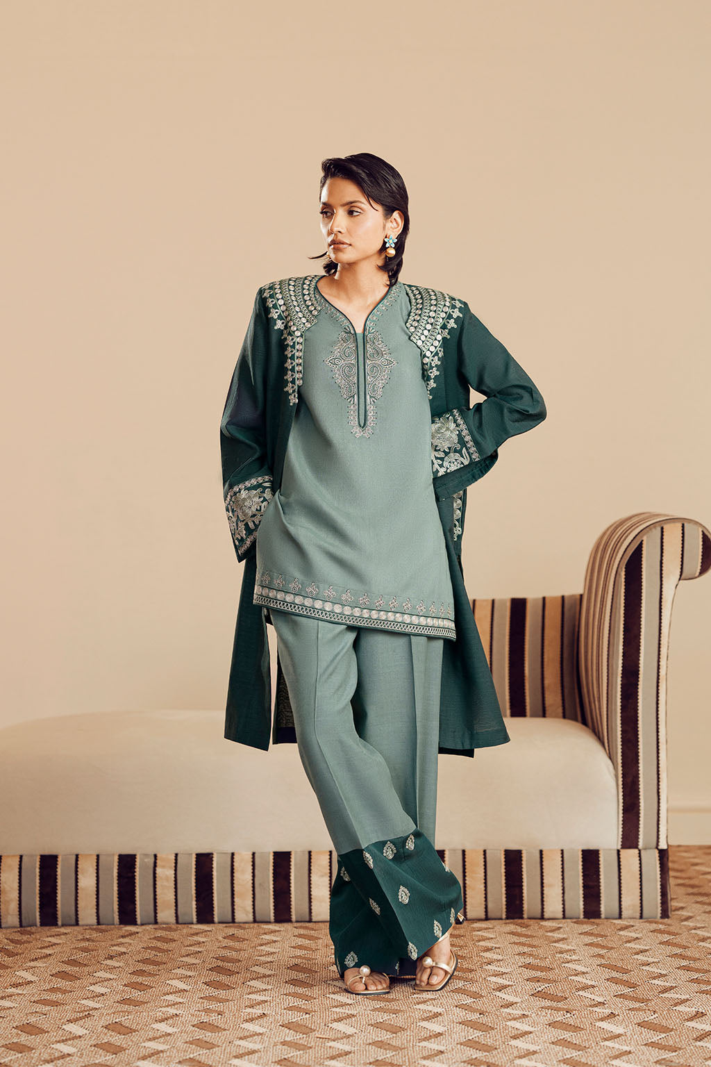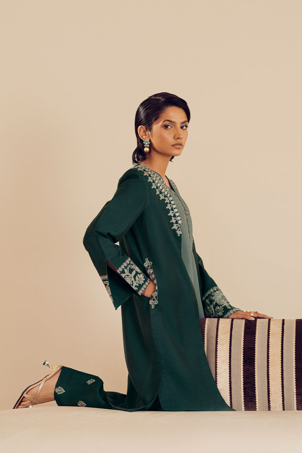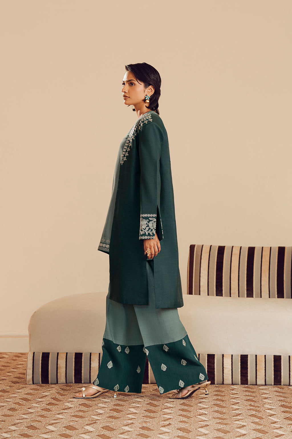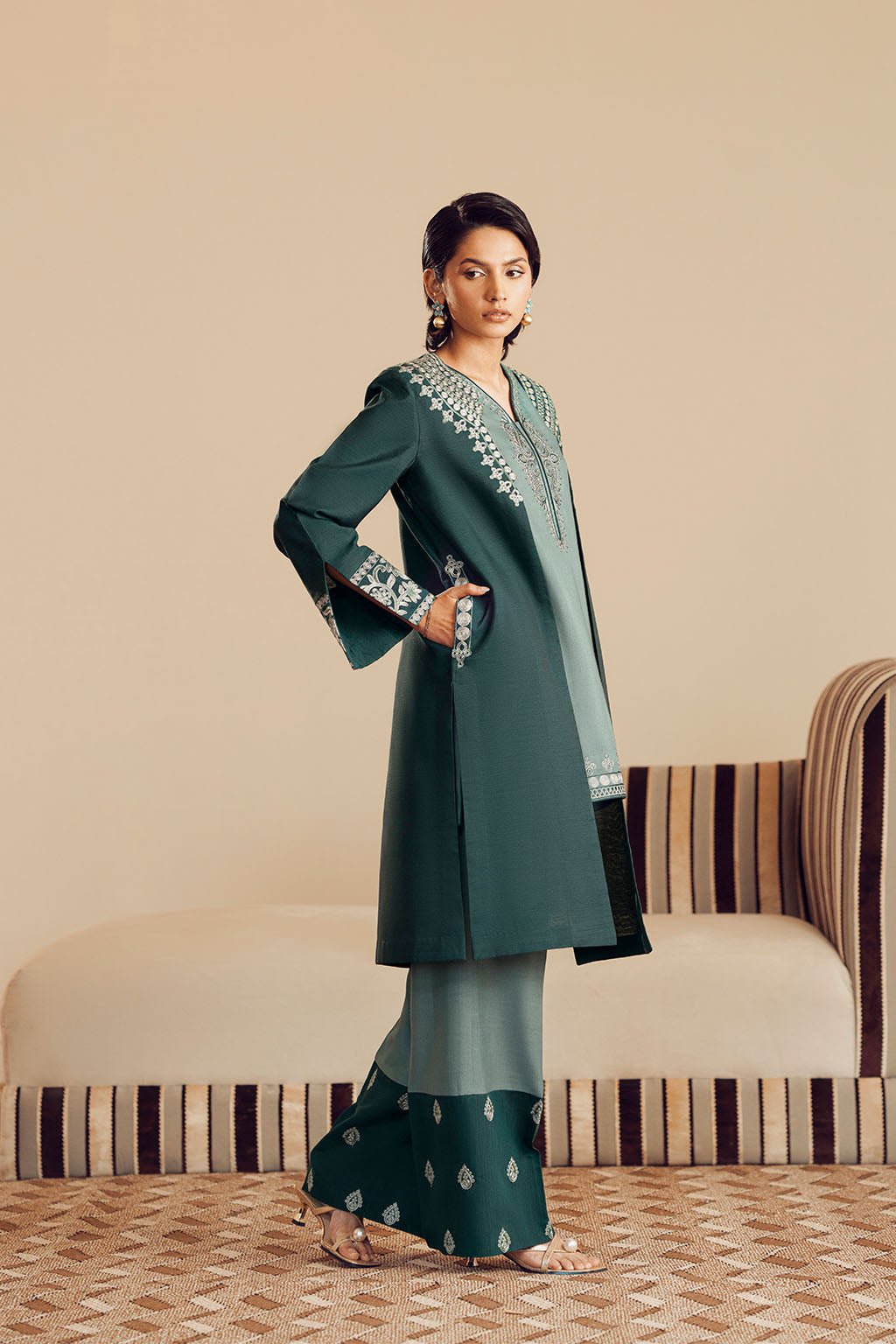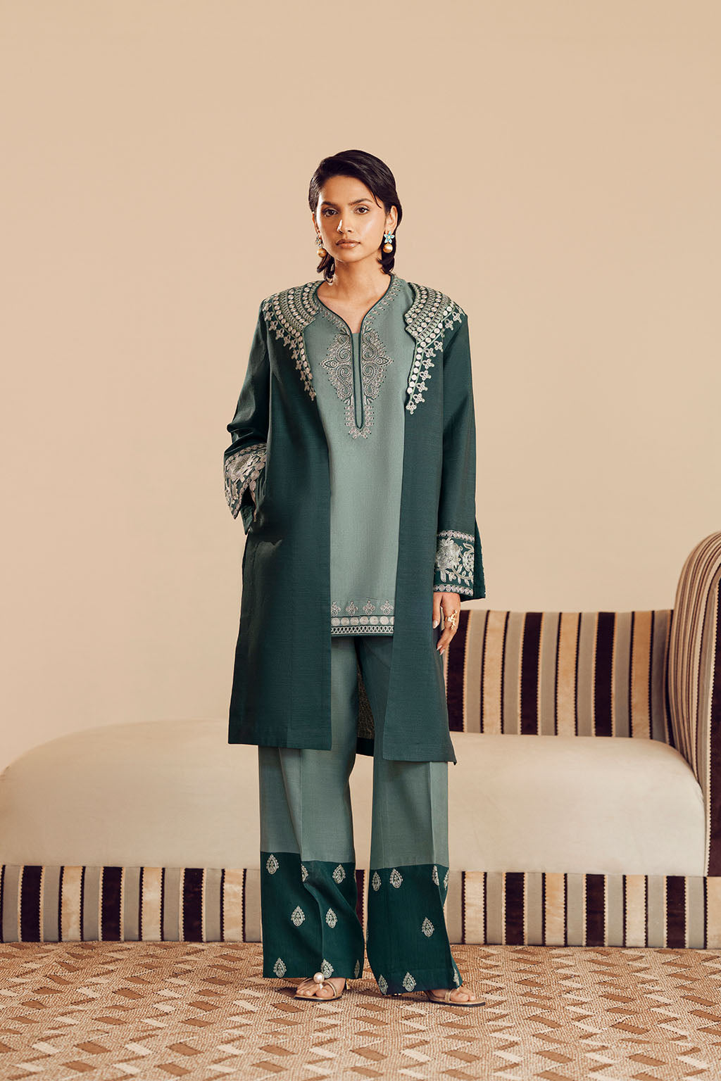 COLOUR-BLOCK EMBROIDERED BORDER. THE OUTFIT IS ELEVATED BY A