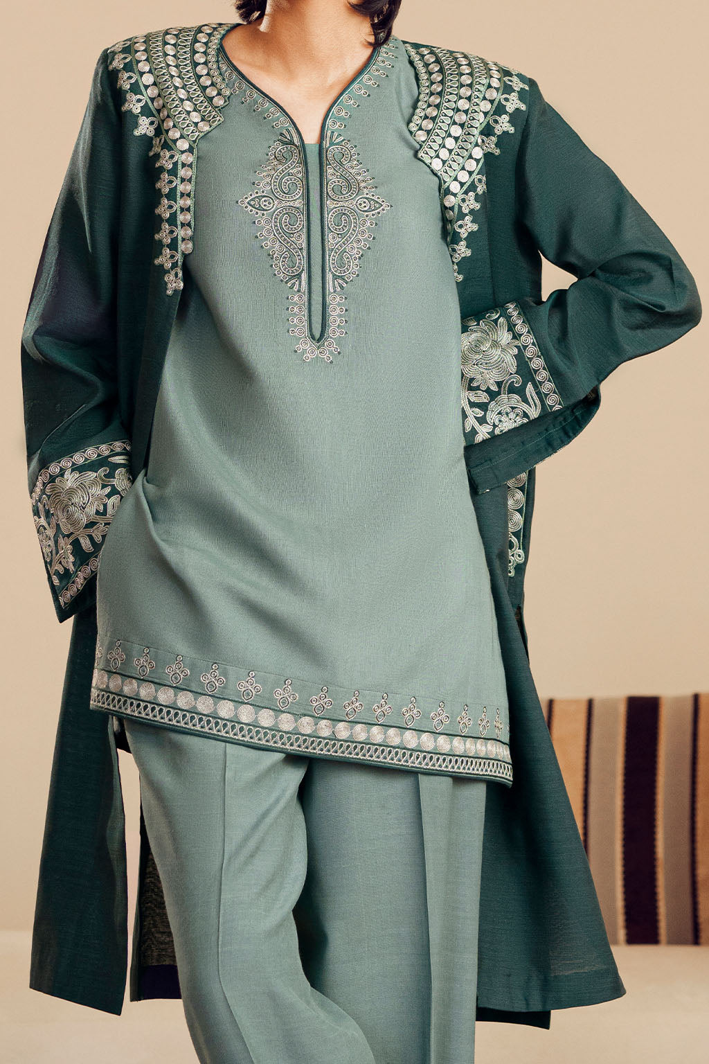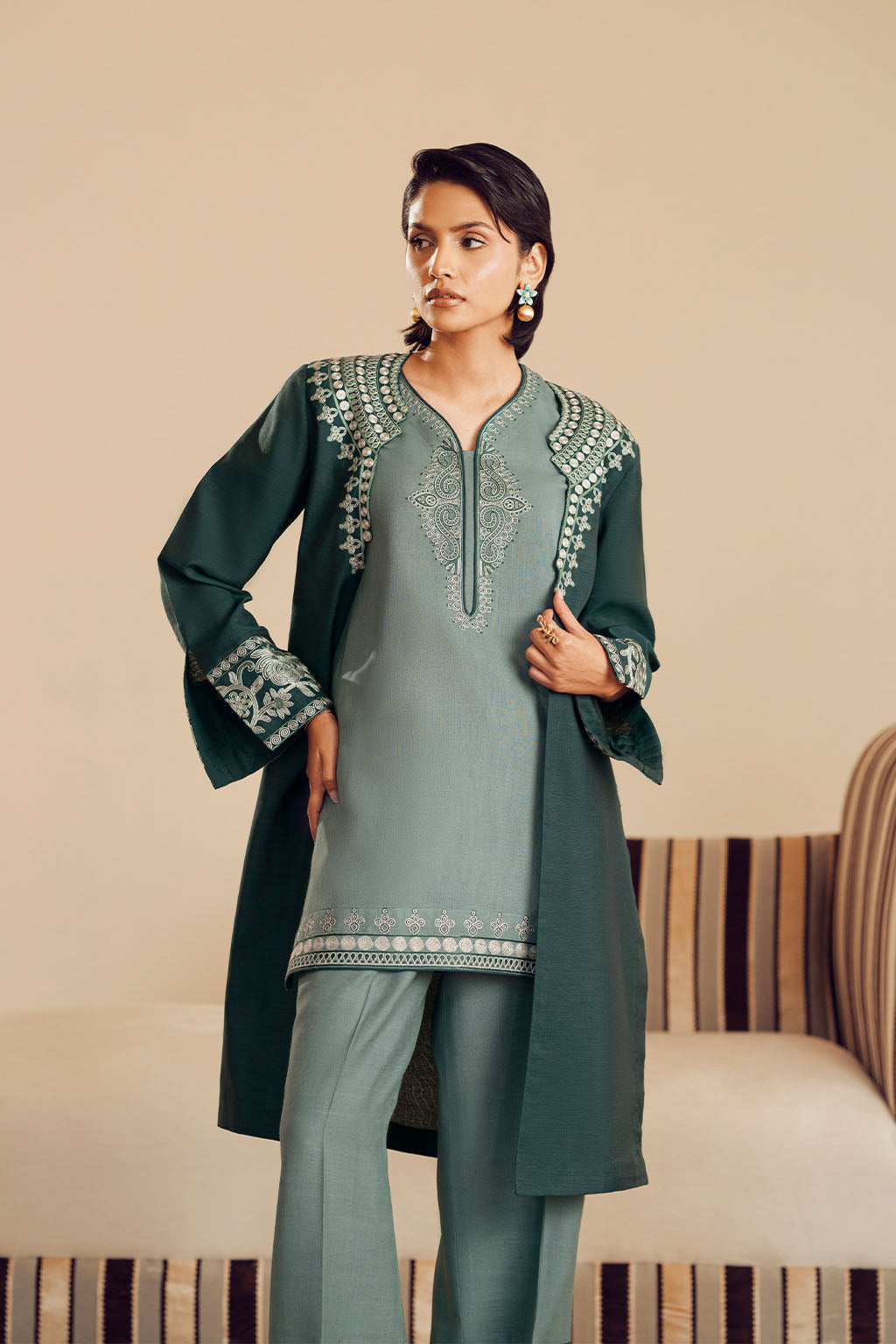 MEDIUM TEAL RAW SILK EMBROIDERED SHIRT, PAIRED WITH TROUSERS FEATURING A