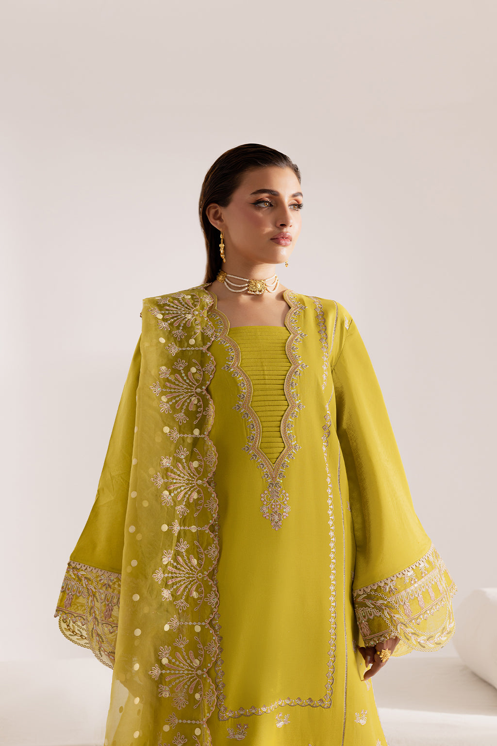 Sheen green embroidered cotton shirt and culottes with organza borders, paired with an embroidered and embossed print organza dupatta with hangings.
