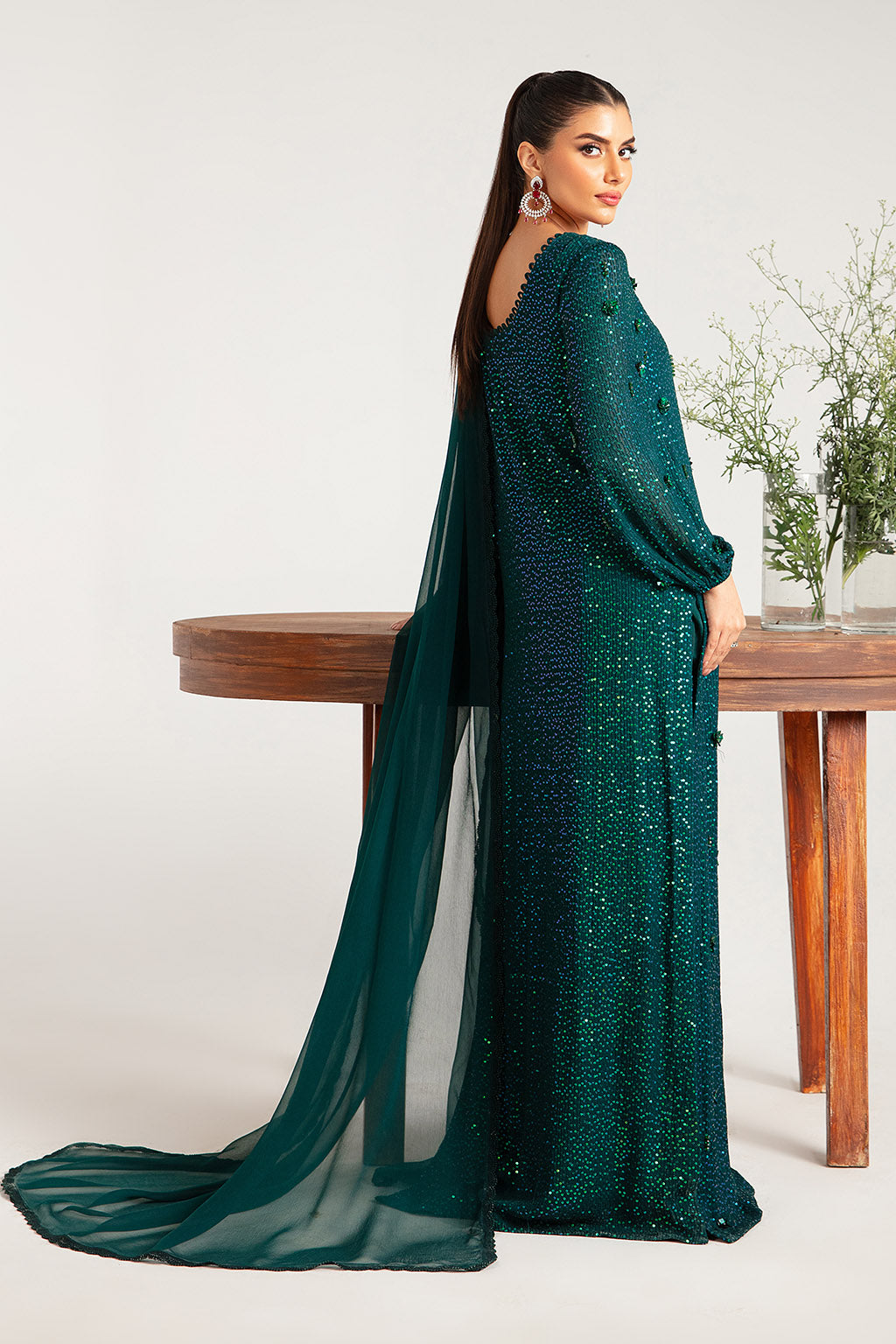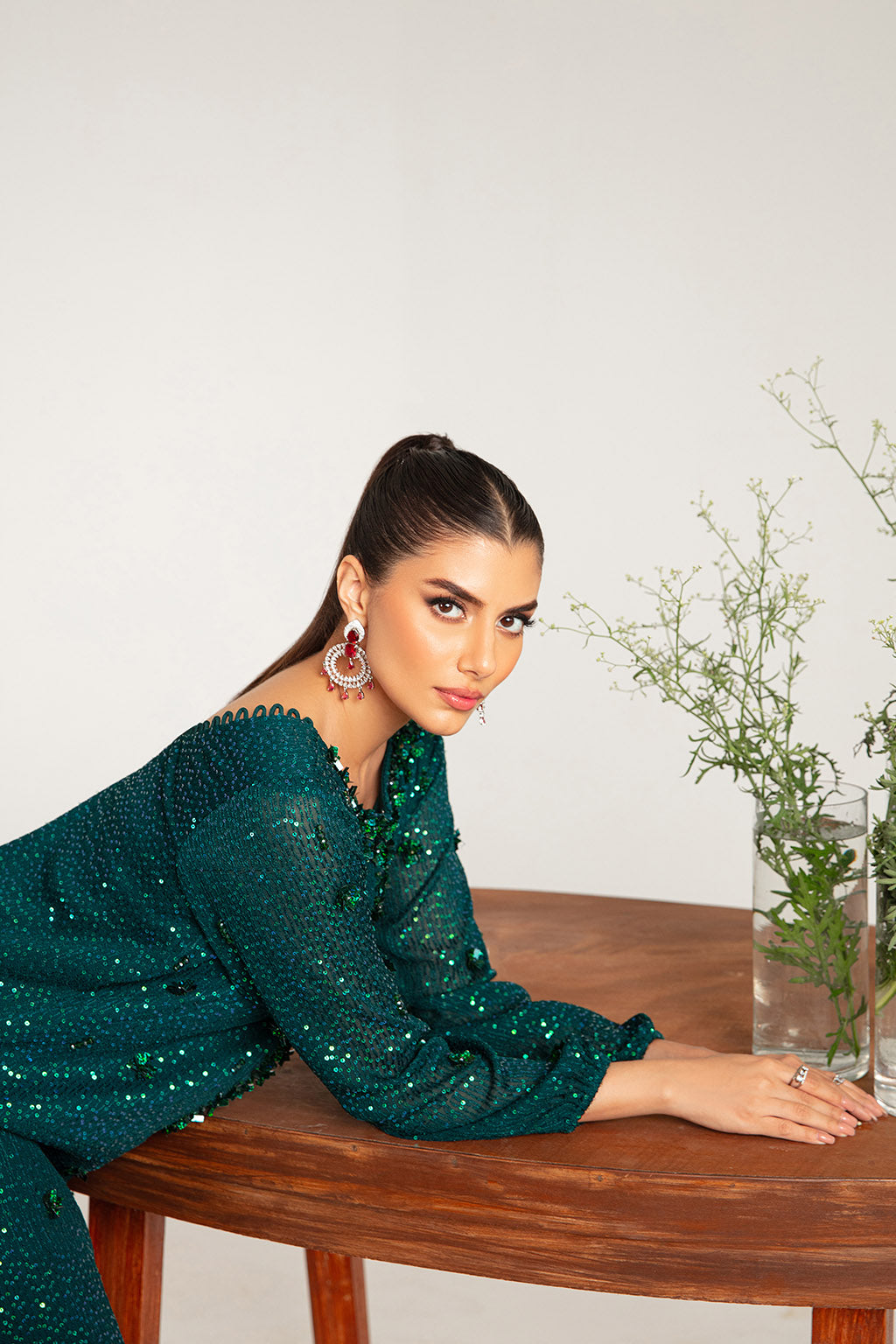 Fully sequined green long shirt with embroidered neckline and sleeves, paired with matching dupatta and pants.