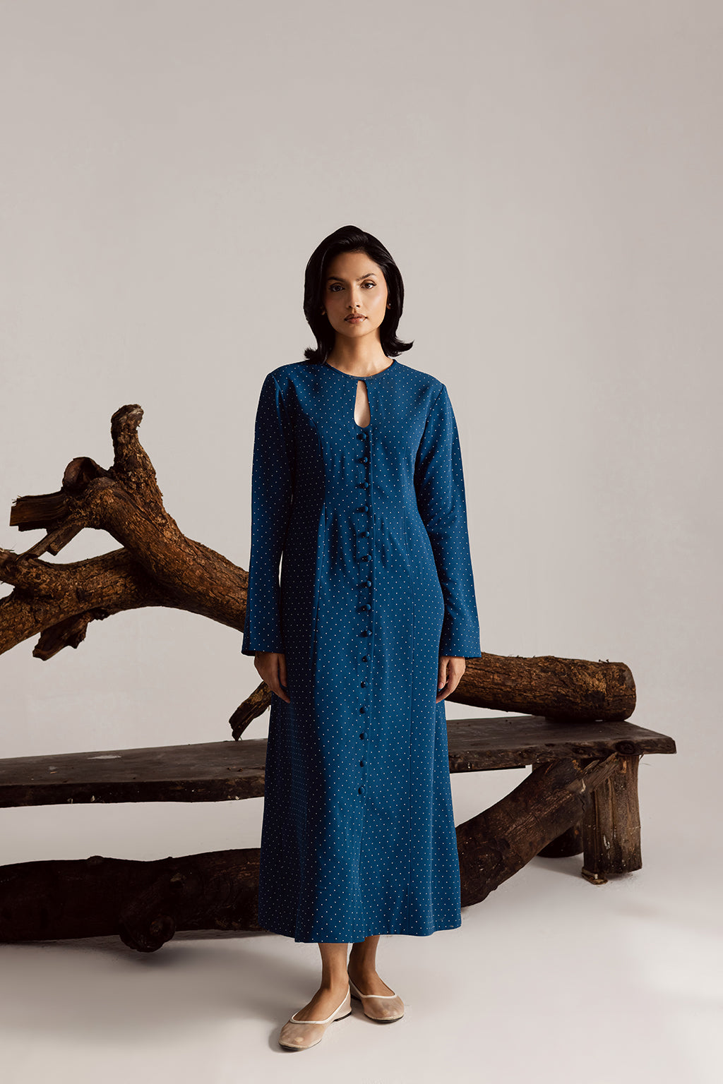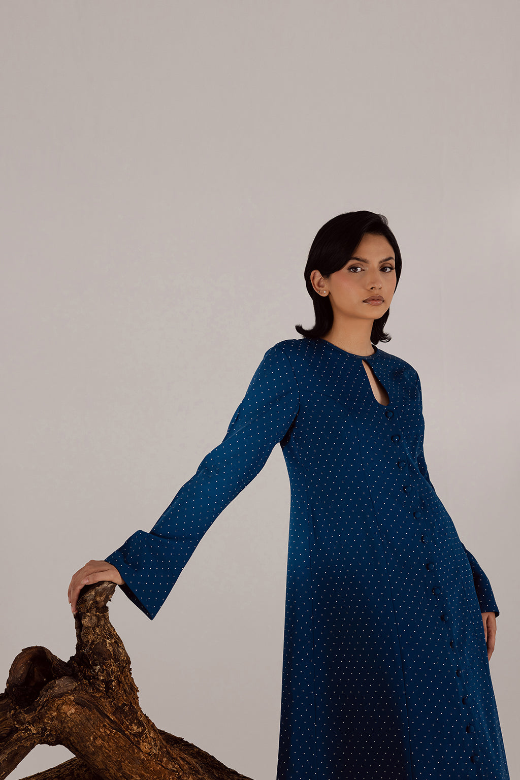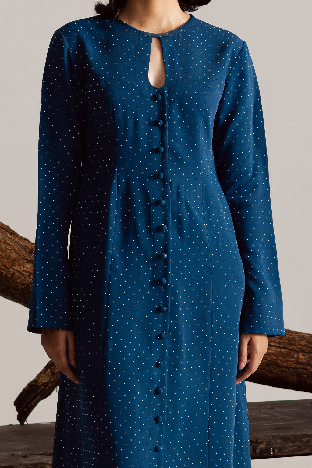 Chic blue long dress in georgette, detailed with subtle polka dots, front button-down style, and a keyhole neckline for a refined, graceful look