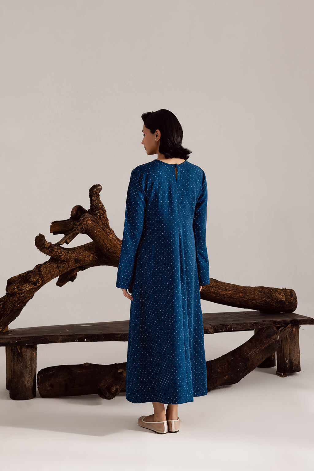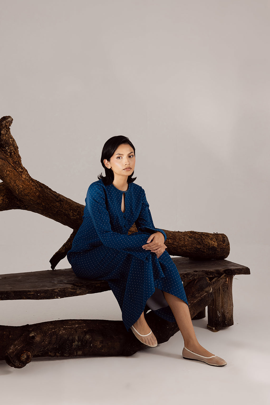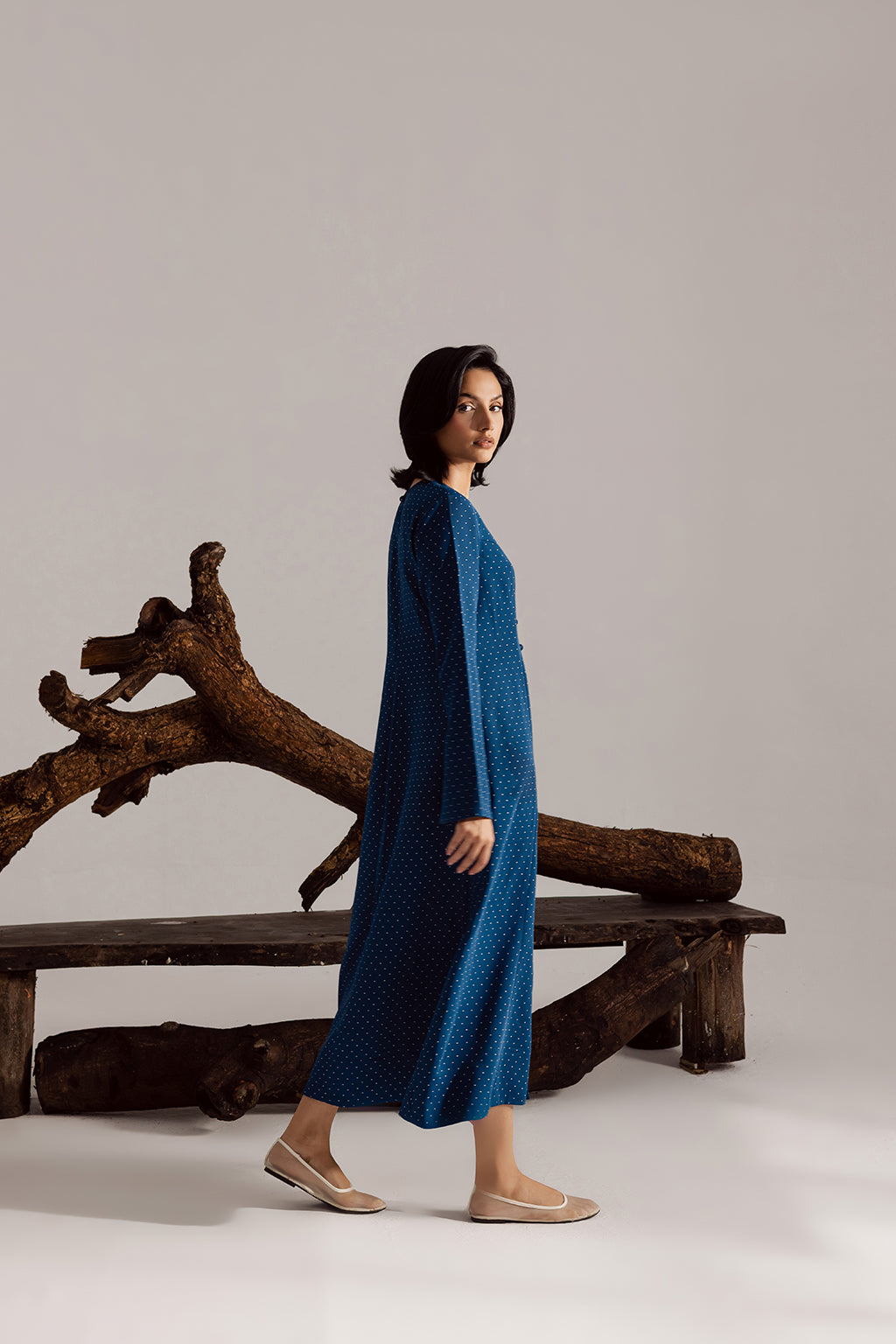Chic blue long dress in georgette, detailed with subtle polka dots, front button-down style, and a keyhole neckline for a refined, graceful look