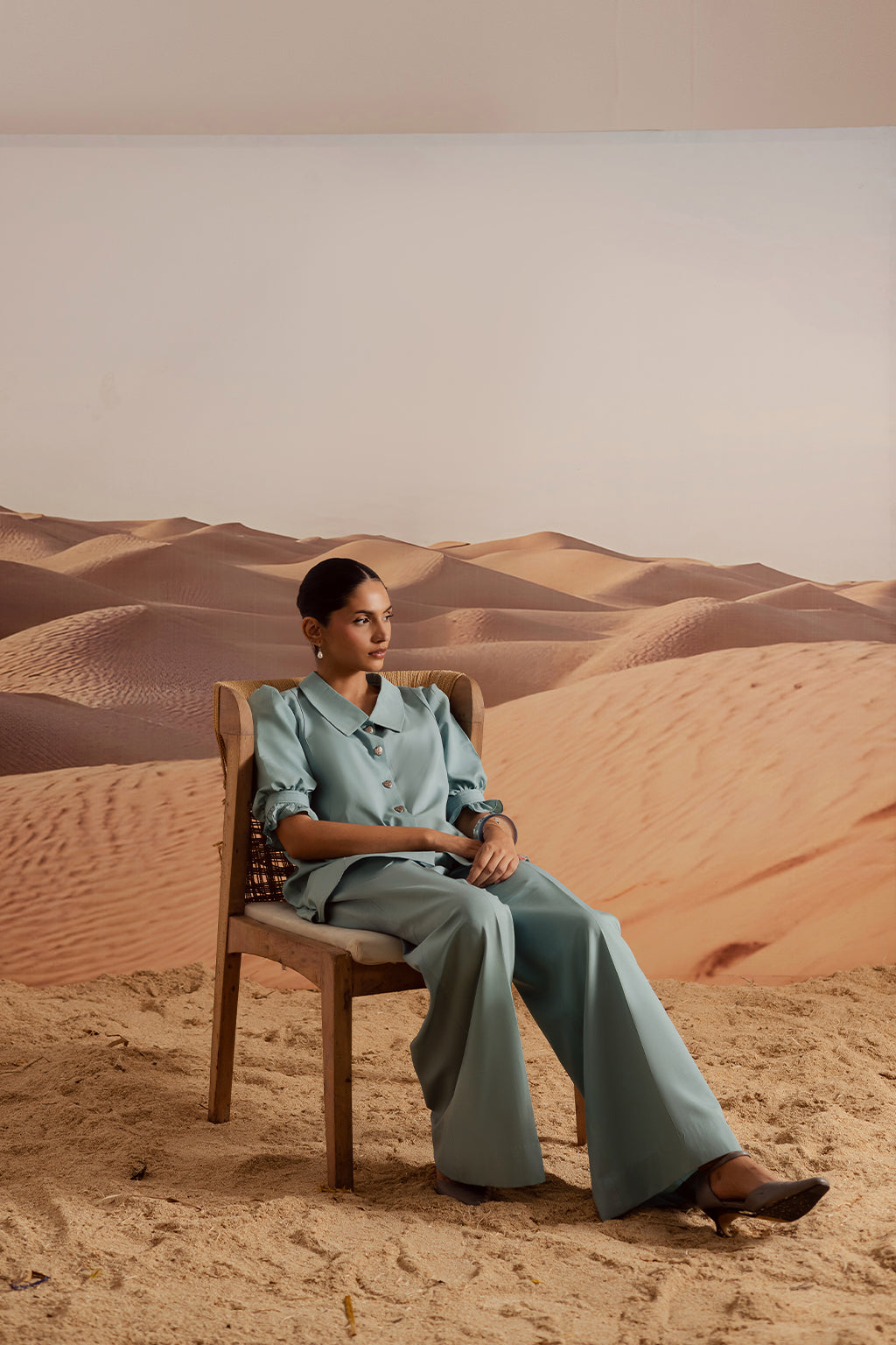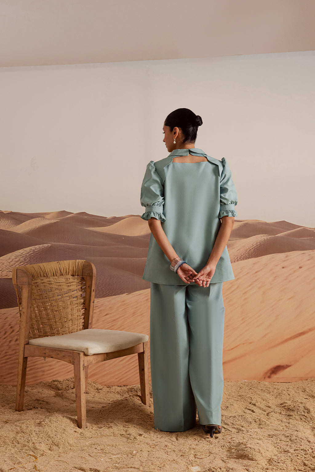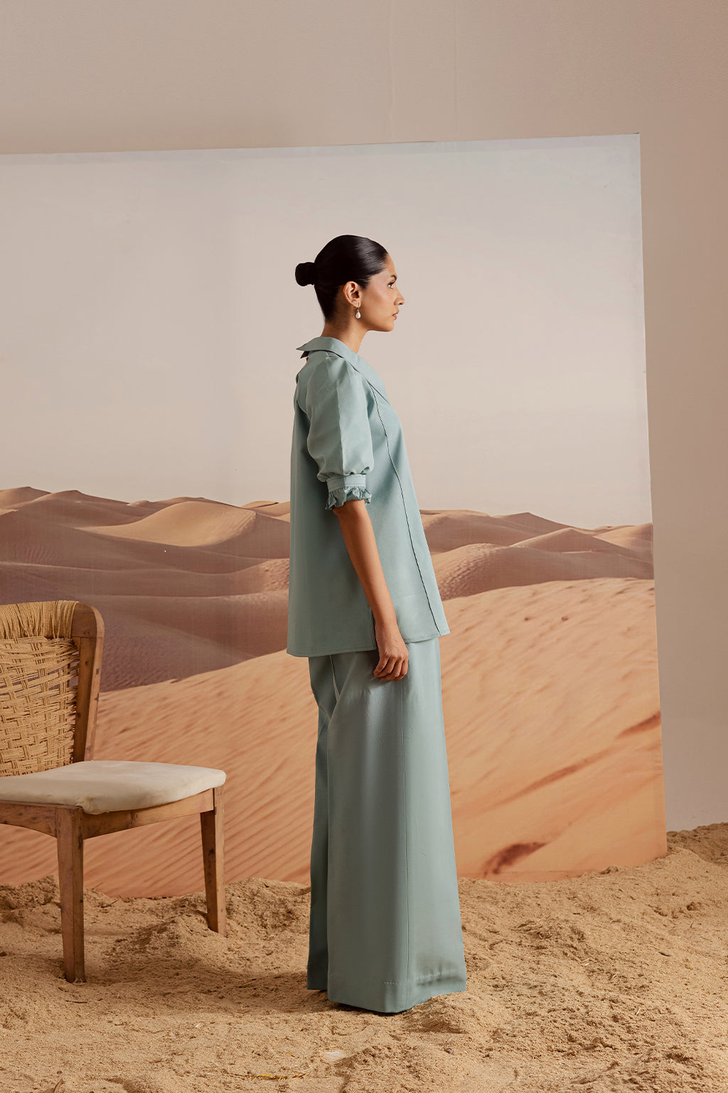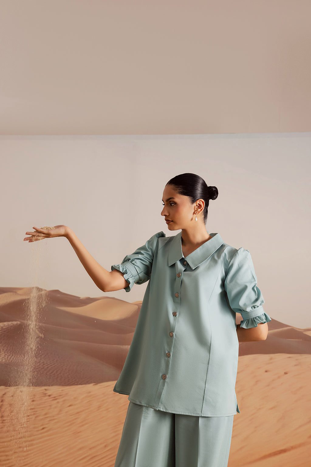 Powder blue grip co-ord set with a collared button-down top, puff sleeves with ruffle cuffs, and wide-leg trousers. Accented with heart-shaped buttons for a chic, playful touch.