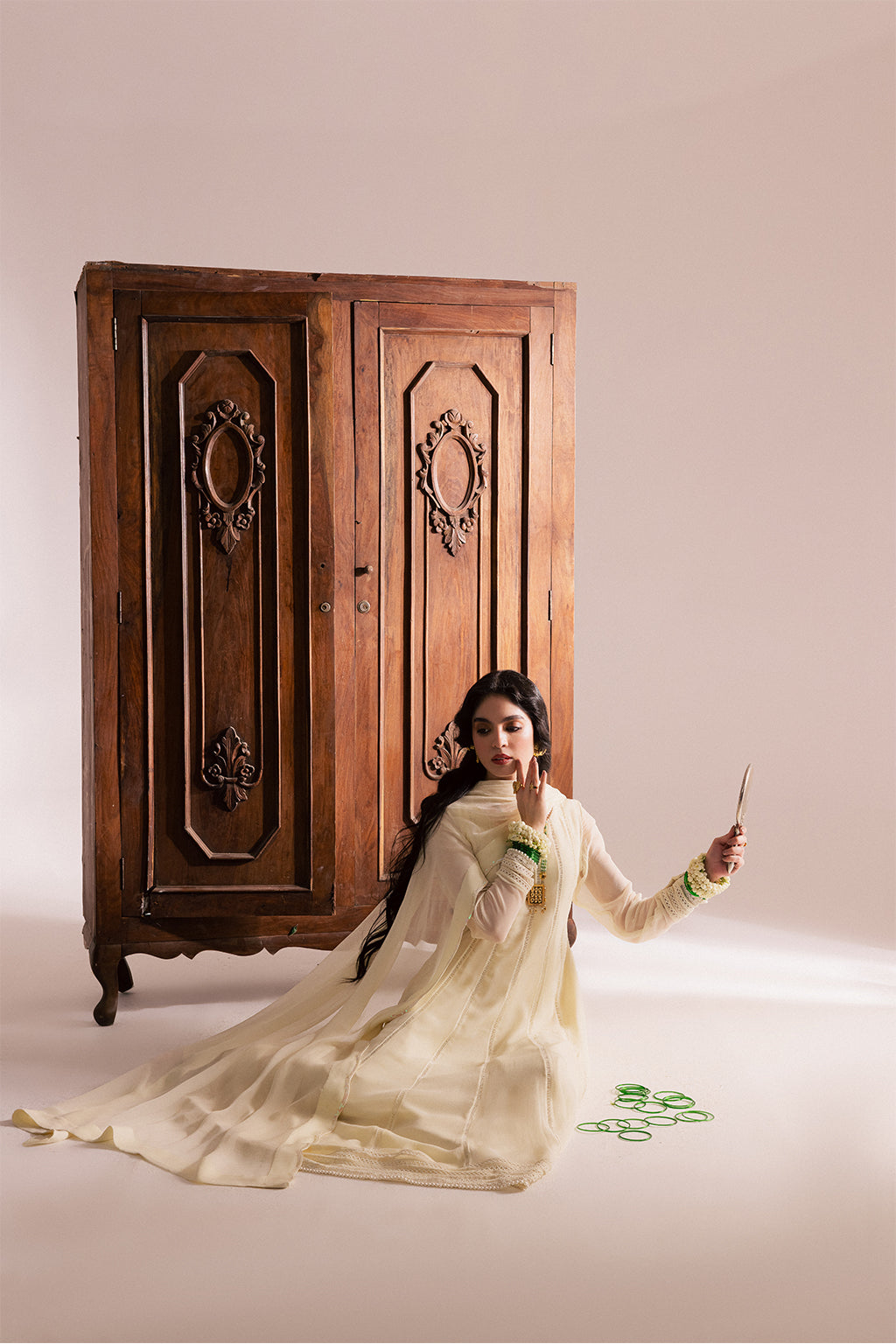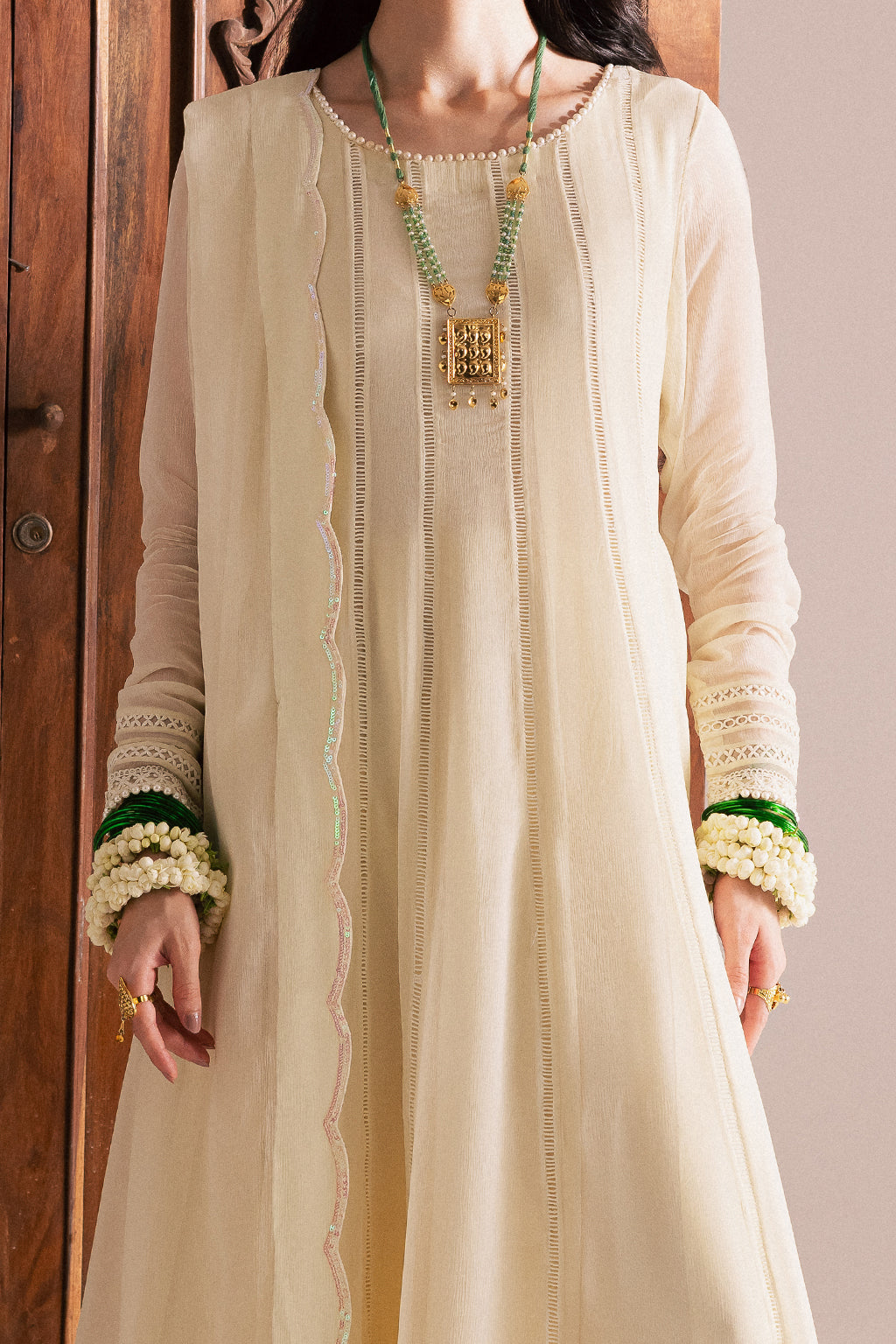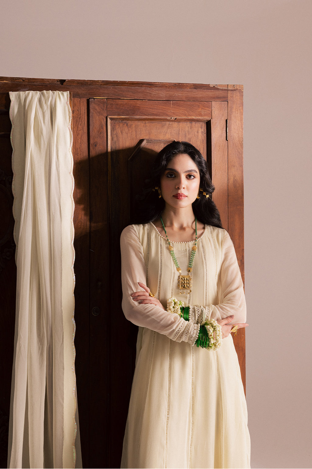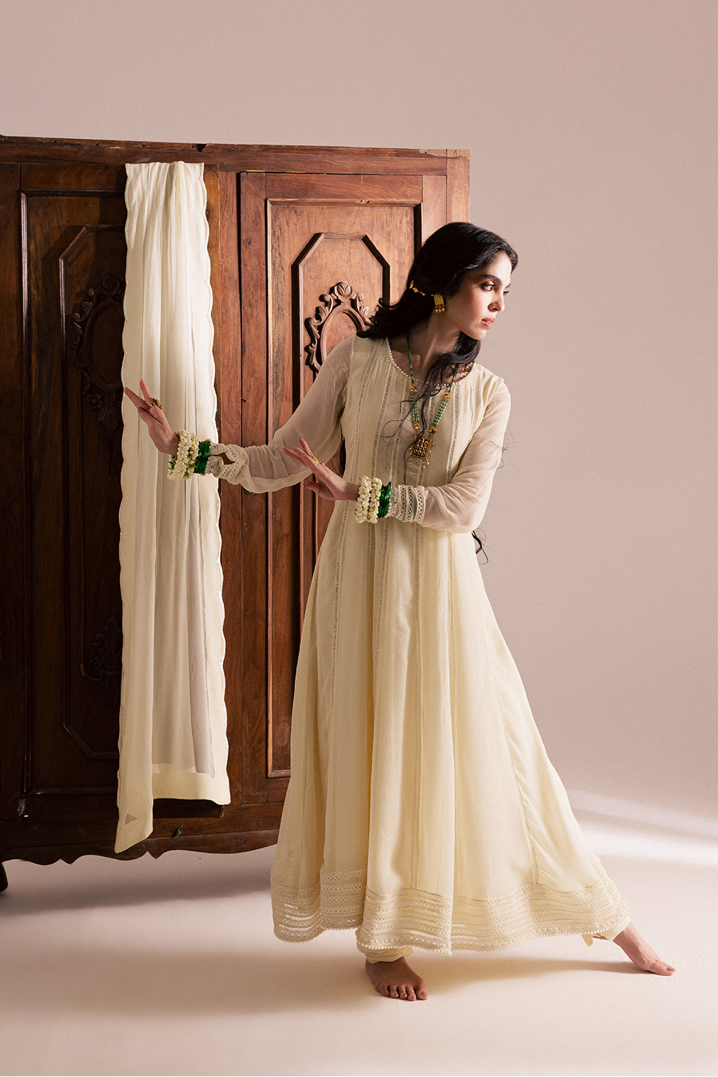Plain white chiffon Anarkali adorned with lace and pearl detailing, paired with embroidered chiffon dupatta and raw silk churidar
