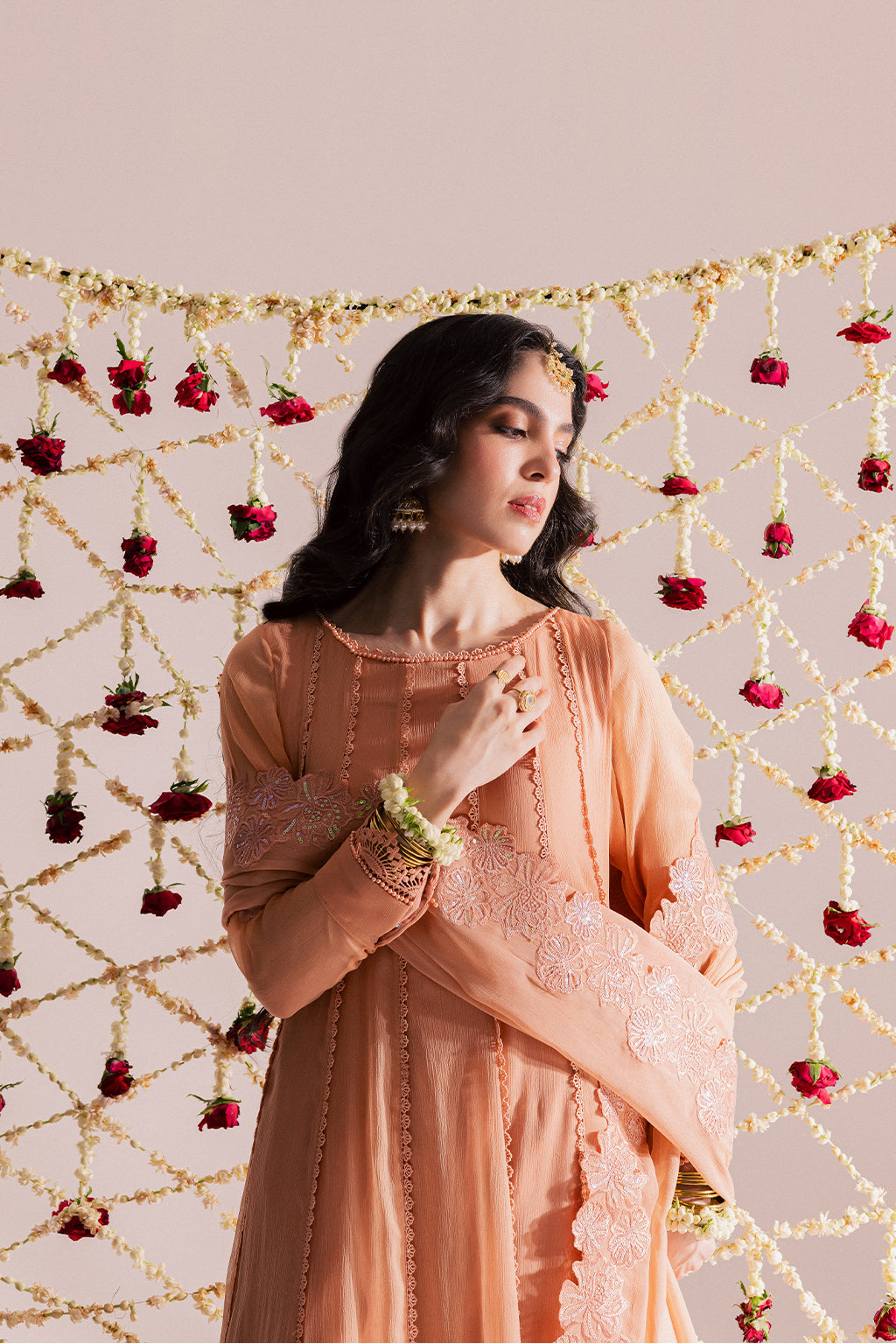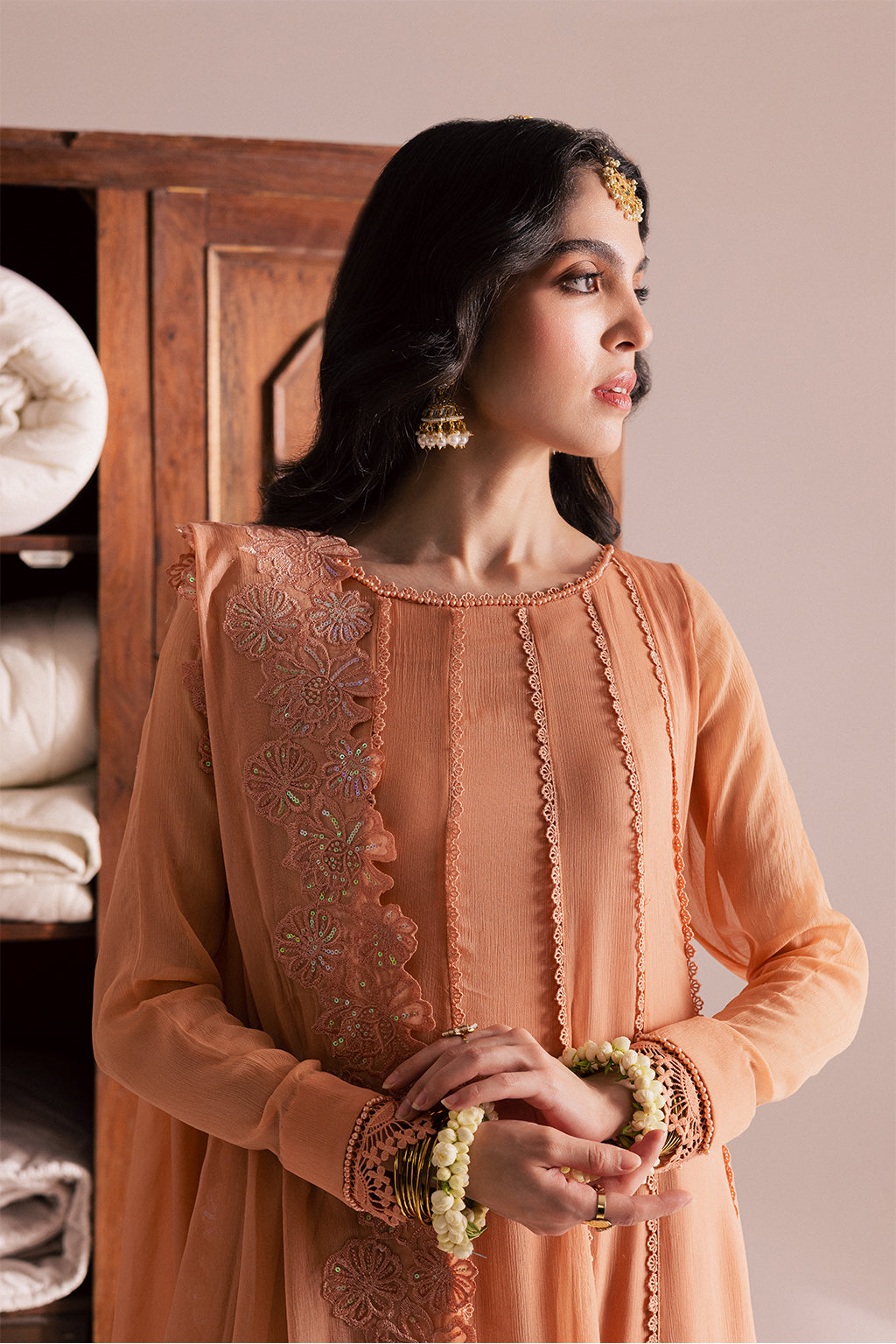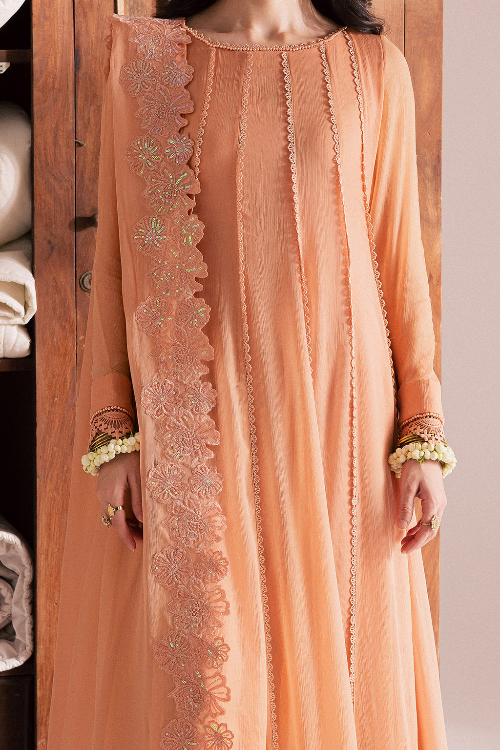 Peach chiffon Anarkali with lace and pearl detailing, paired with an embroidered chiffon dupatta and raw silk cigarette pants