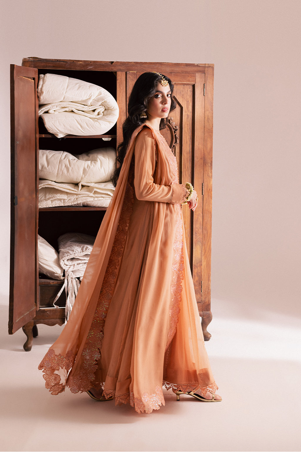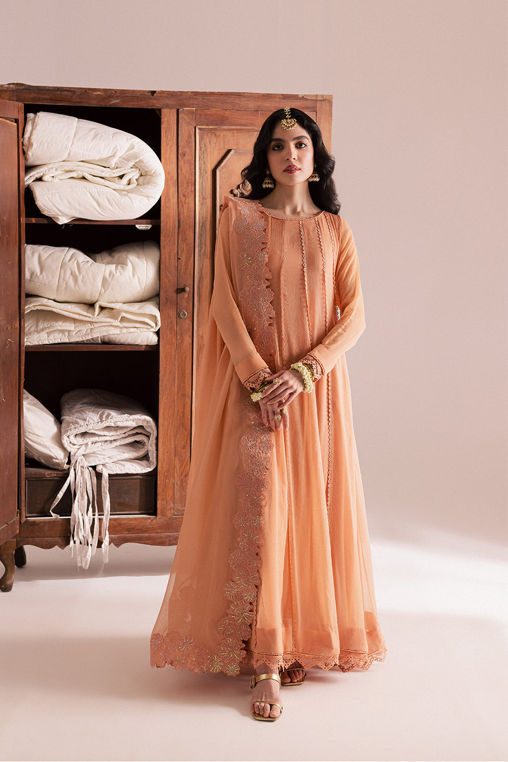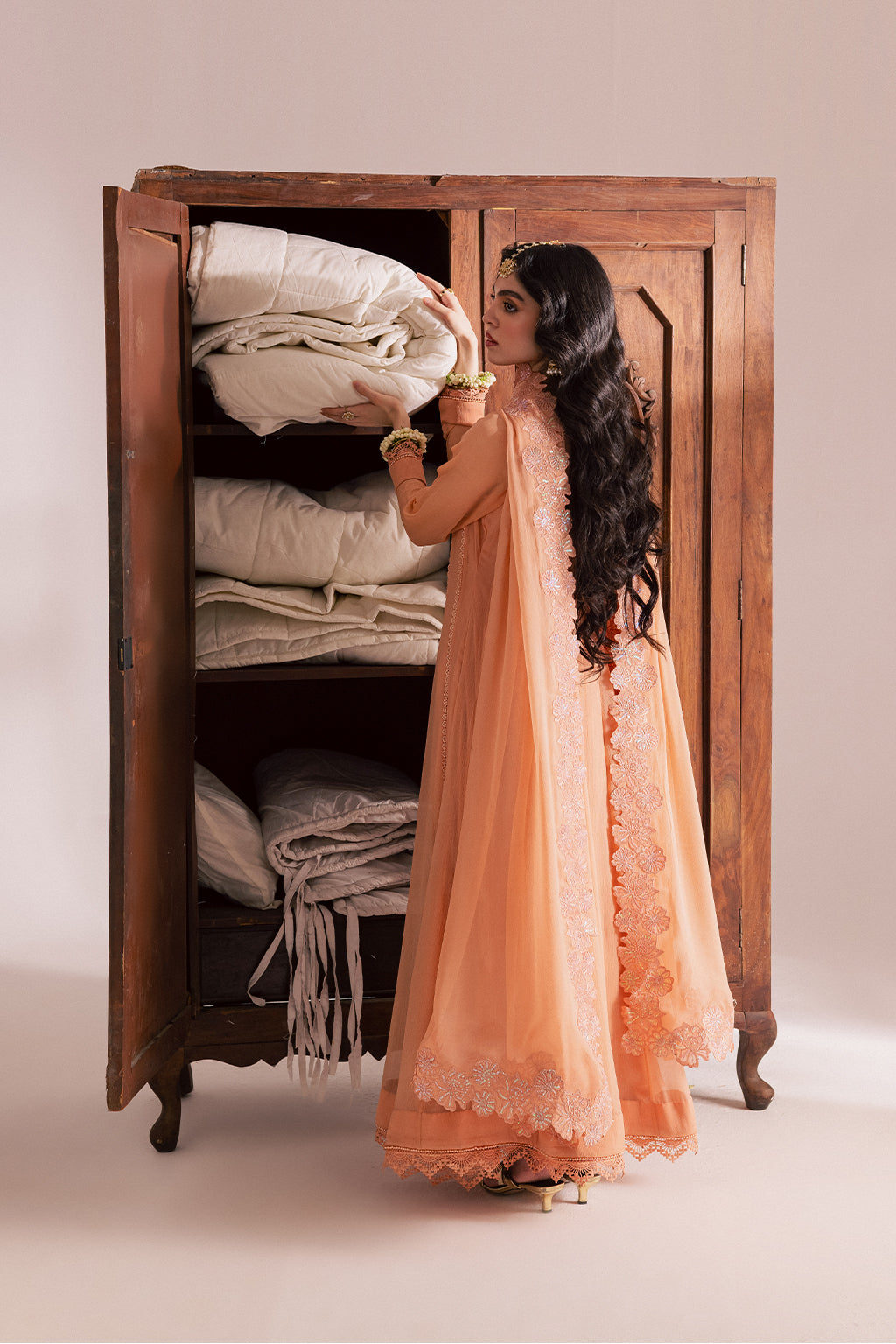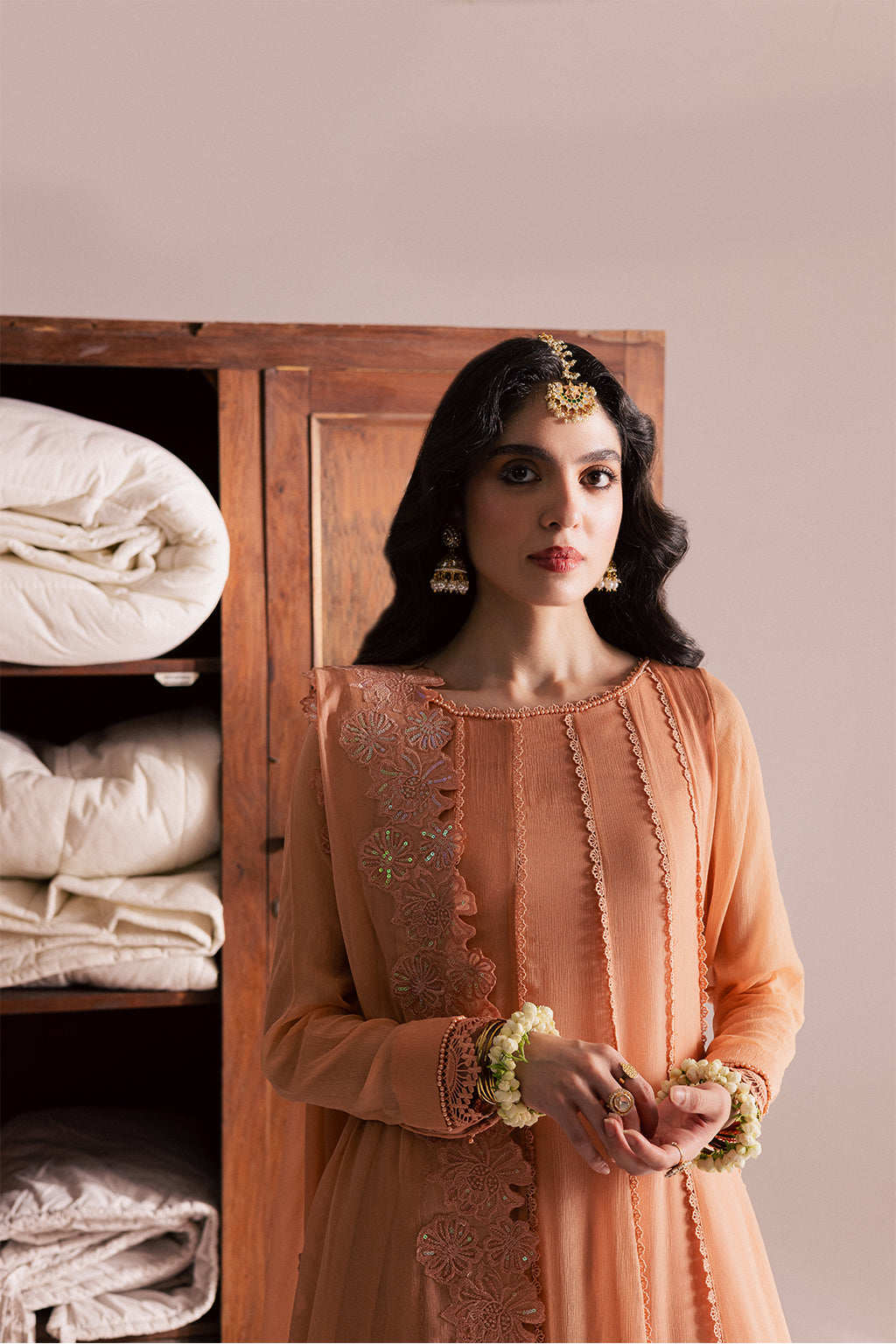 Peach chiffon Anarkali with lace and pearl detailing, paired with an embroidered chiffon dupatta and raw silk cigarette pants