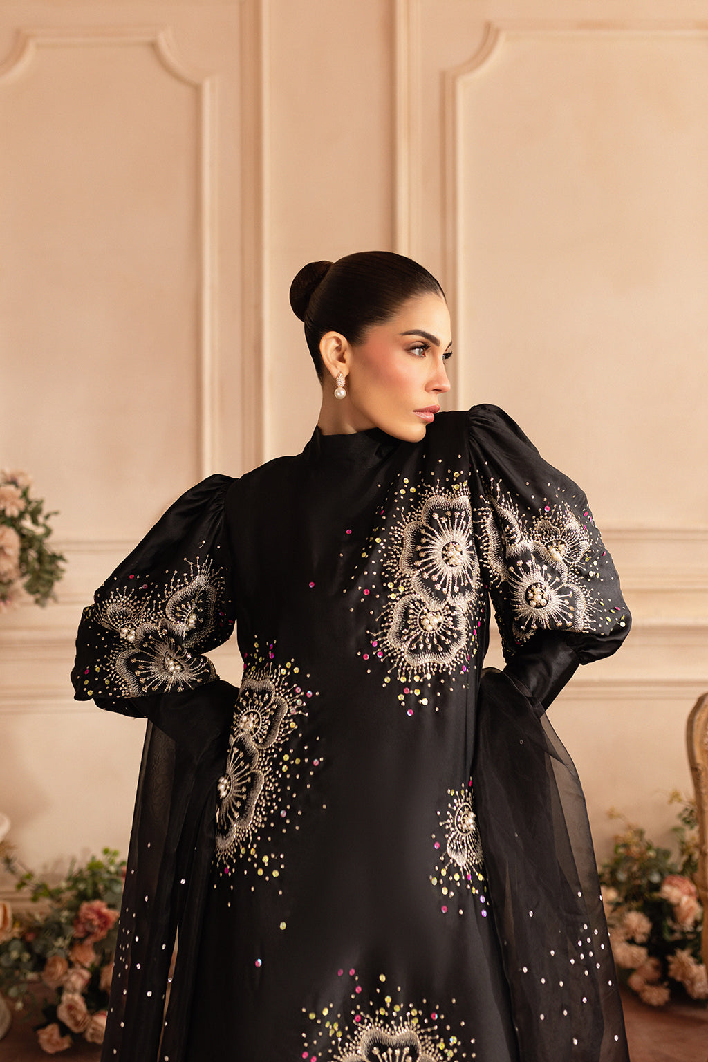 A black Charmeuse silk long embroidered shirt with delicate hand embellishments, paired with cigarette pants and hand work organza dupatta