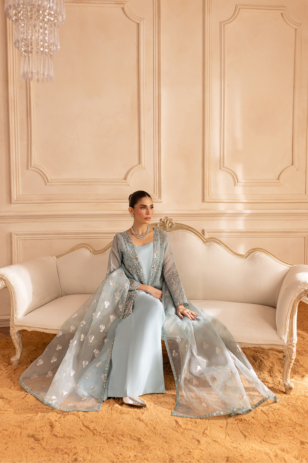 Ice blue embroidered wrap shirt with delicate hand embellishments, paired with plazo pants , foil print dupatta and a separate raw silk blouse
