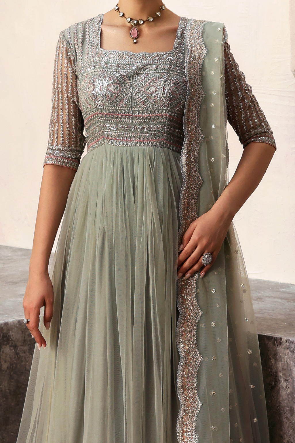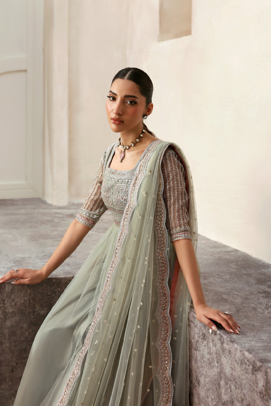 Ash gray net pishwas with intricate sequin embroidery and double sequin borders, paired with raw silk foil-printed trousers and an embroidered scalloped dupatta for a graceful festive look.