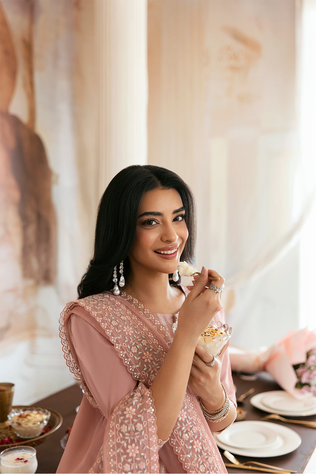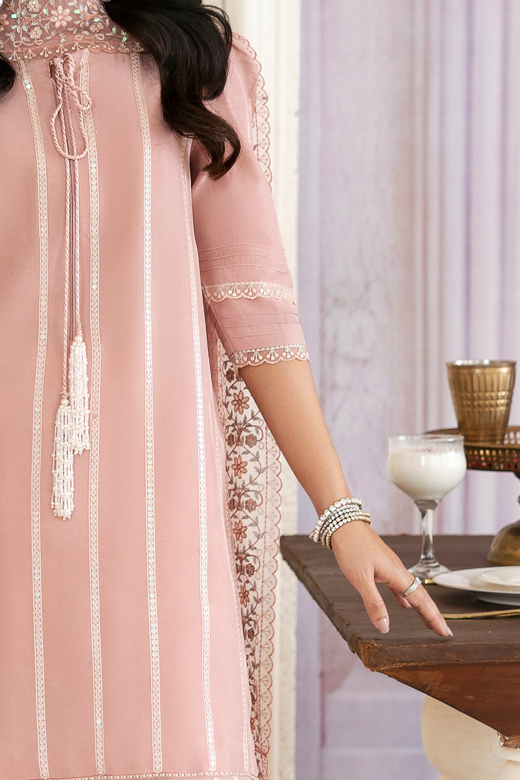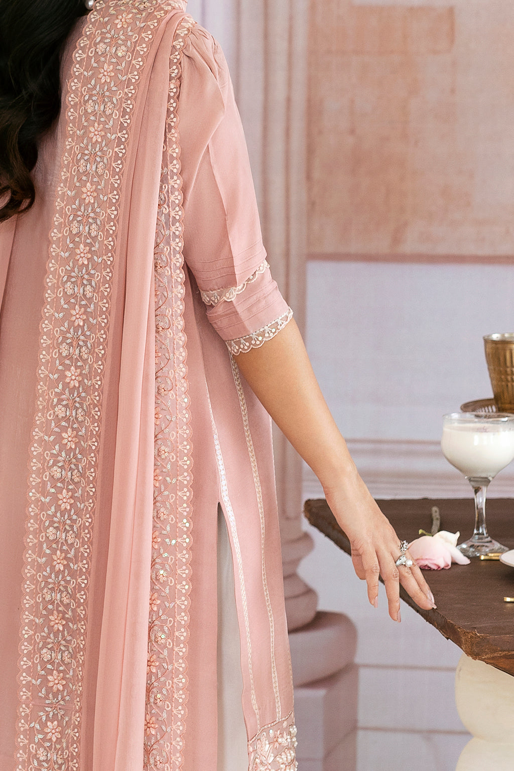 Peach silk embroidered shirt with puff sleeves, paired with off-white silk trousers featuring slit embroidery and hand embellishments and chiffon embroidered dupatta