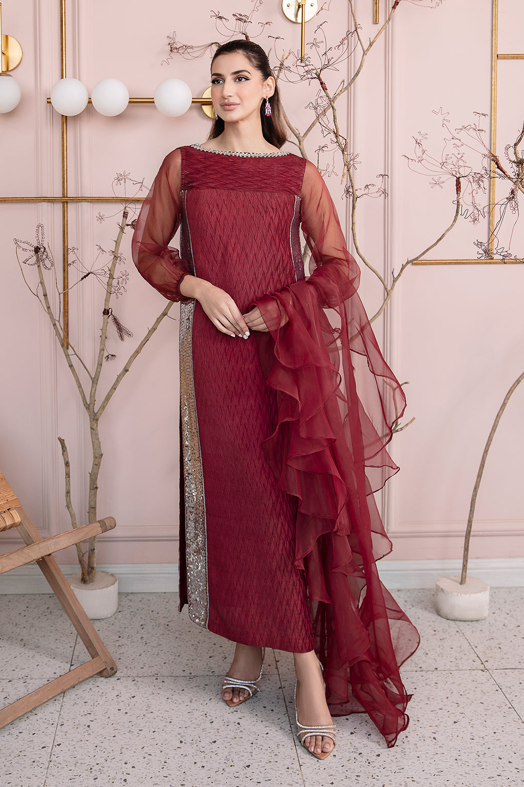 Deep maroon long shirt with hand embellished neckline, embroidered side panels, paired with cigarette pants and ruffles dupatta.