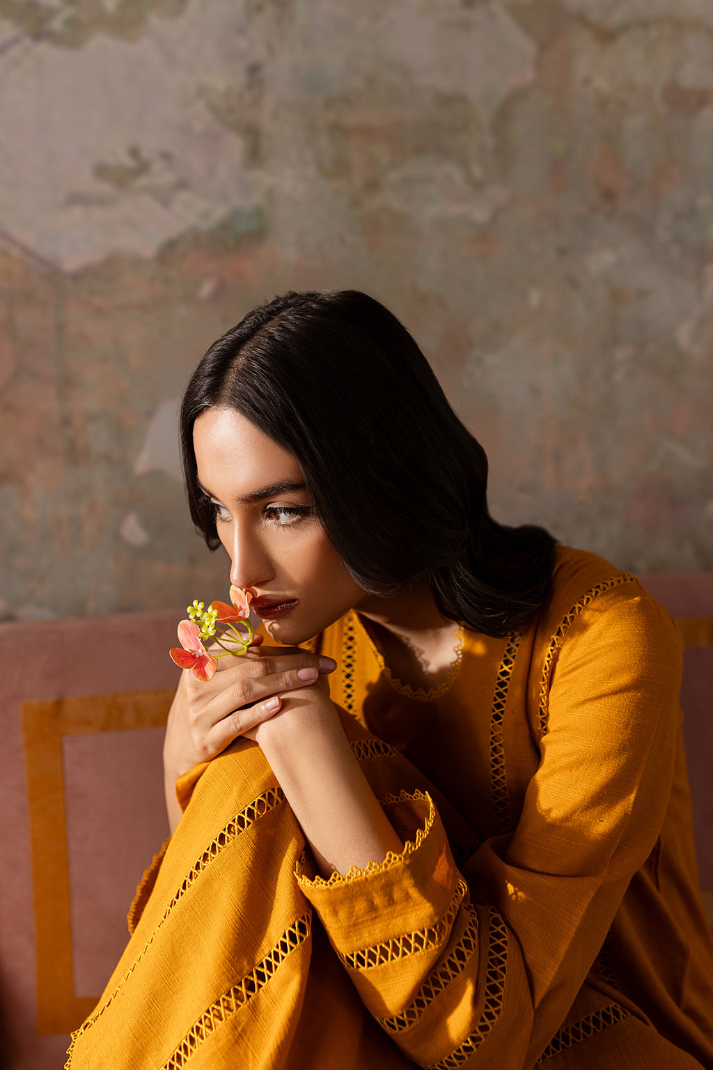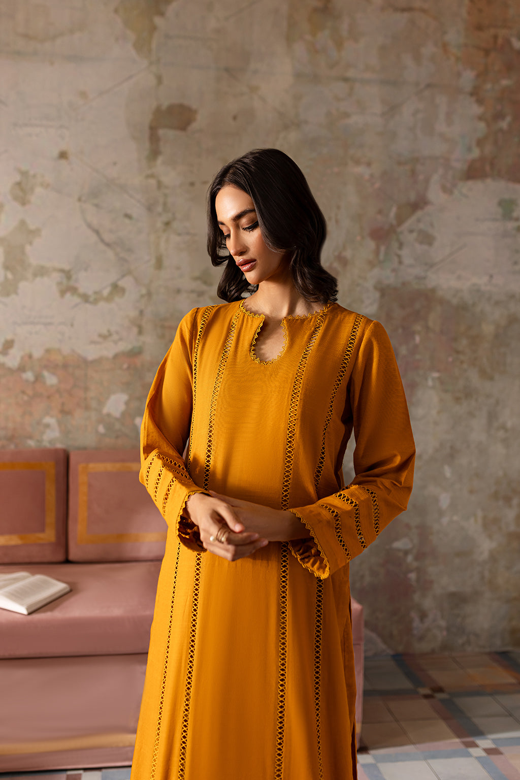 Mustard shirt with lace detailing on front & sleeves, paired with wide legged trousers