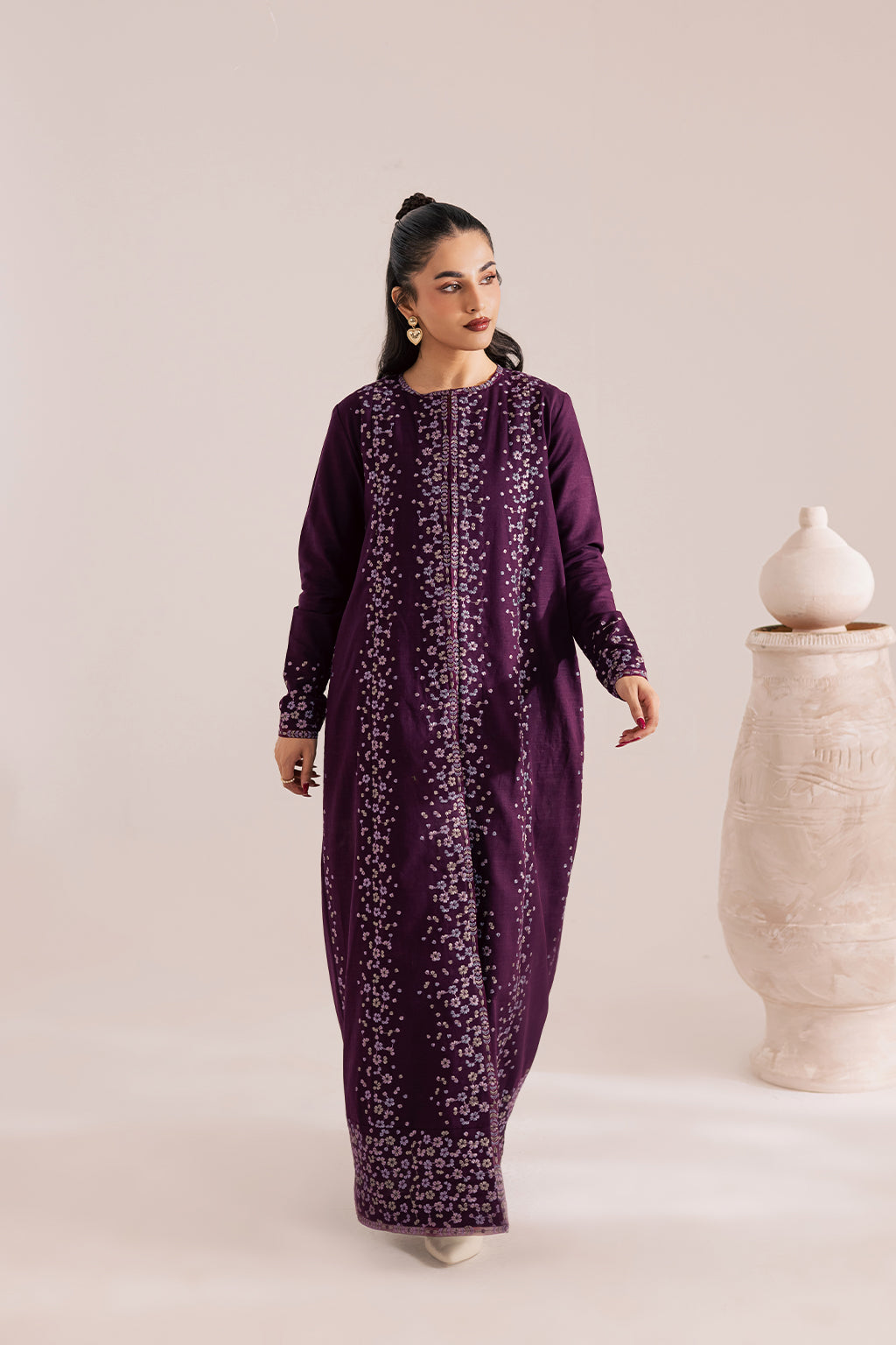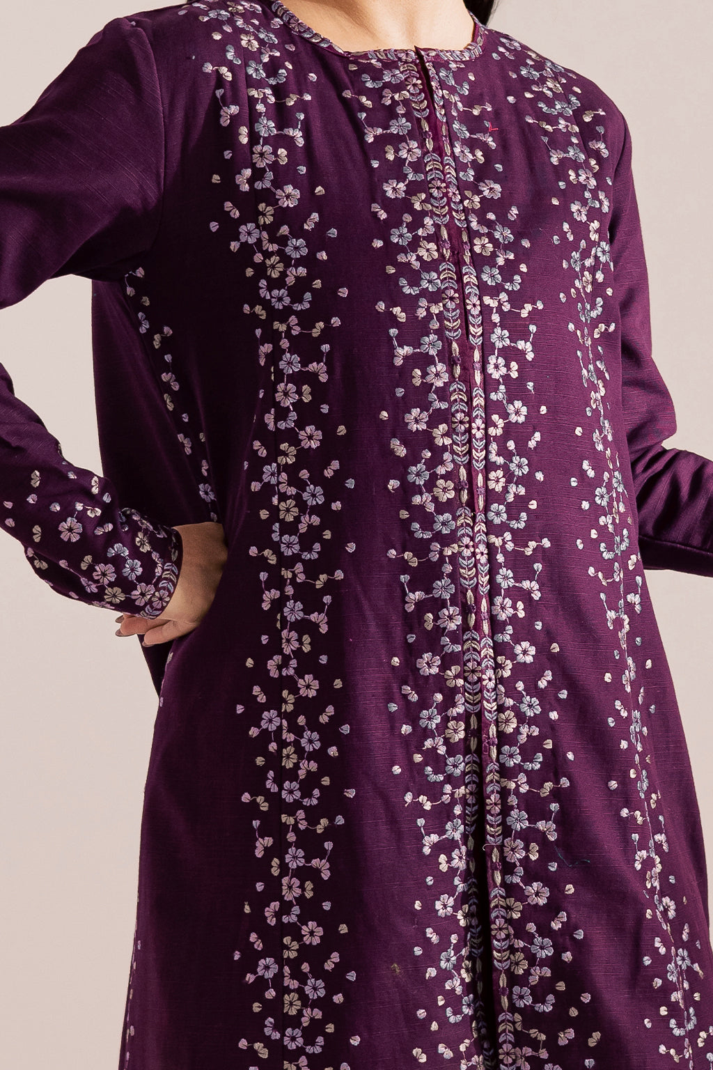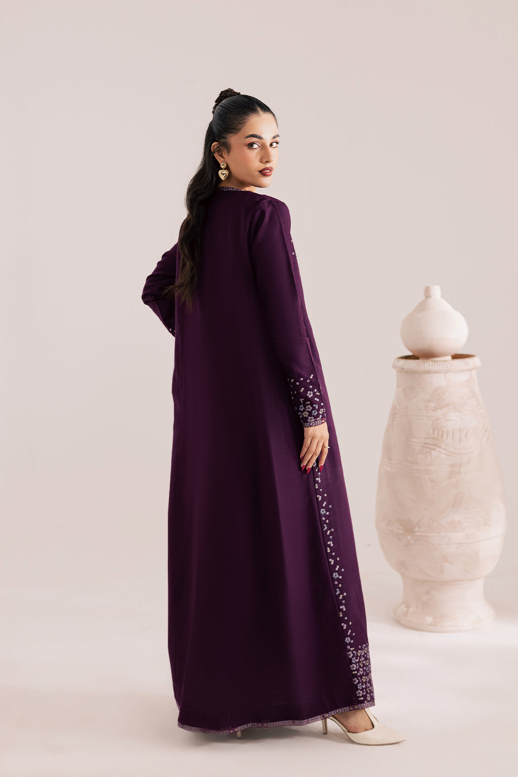 Deep plum flared embroidered khaddar jacket paired with khaddar inner and pants