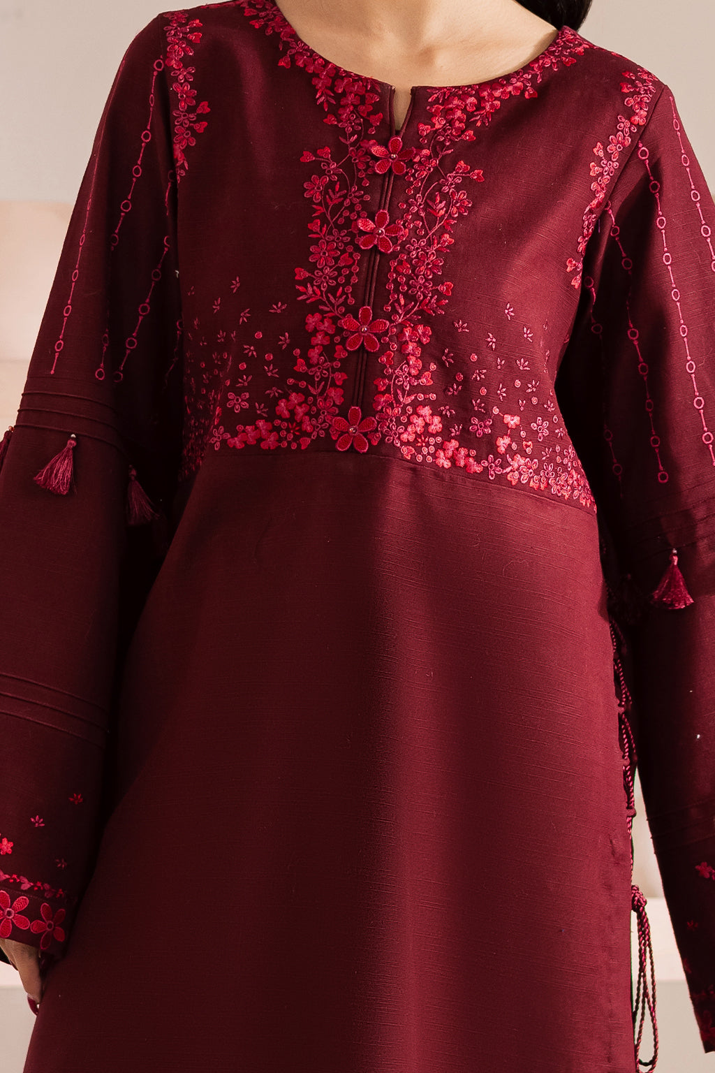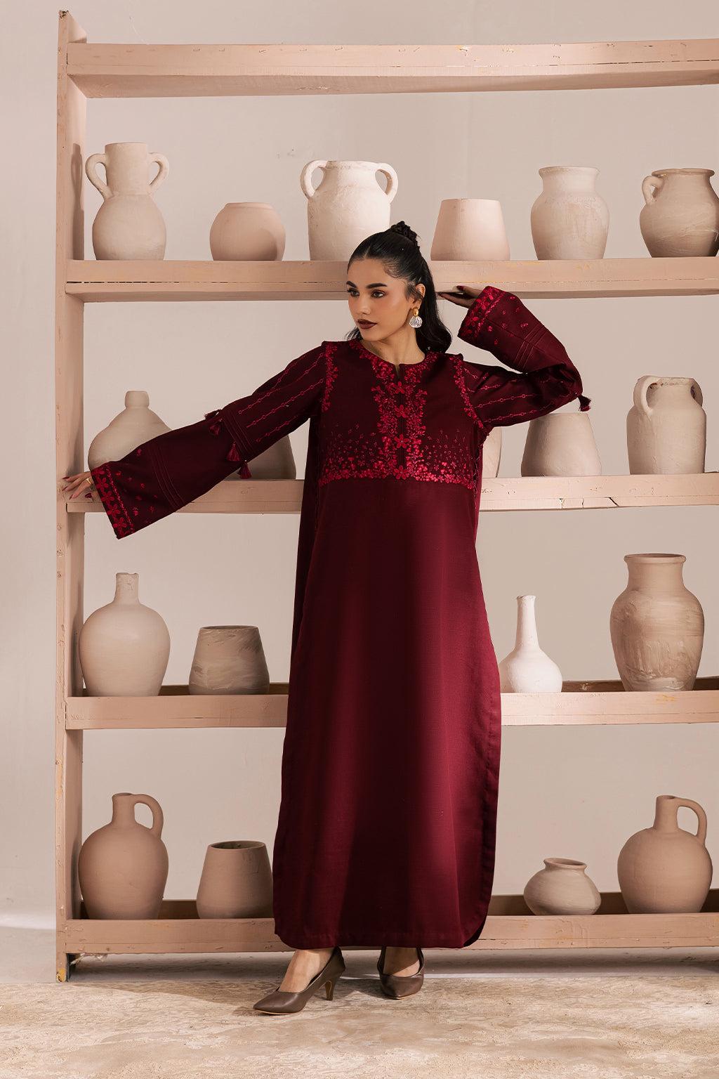 An ethereal Khaddar long shirt, beautifully embroidered with tasselling side details, paired with khaddar pants.
