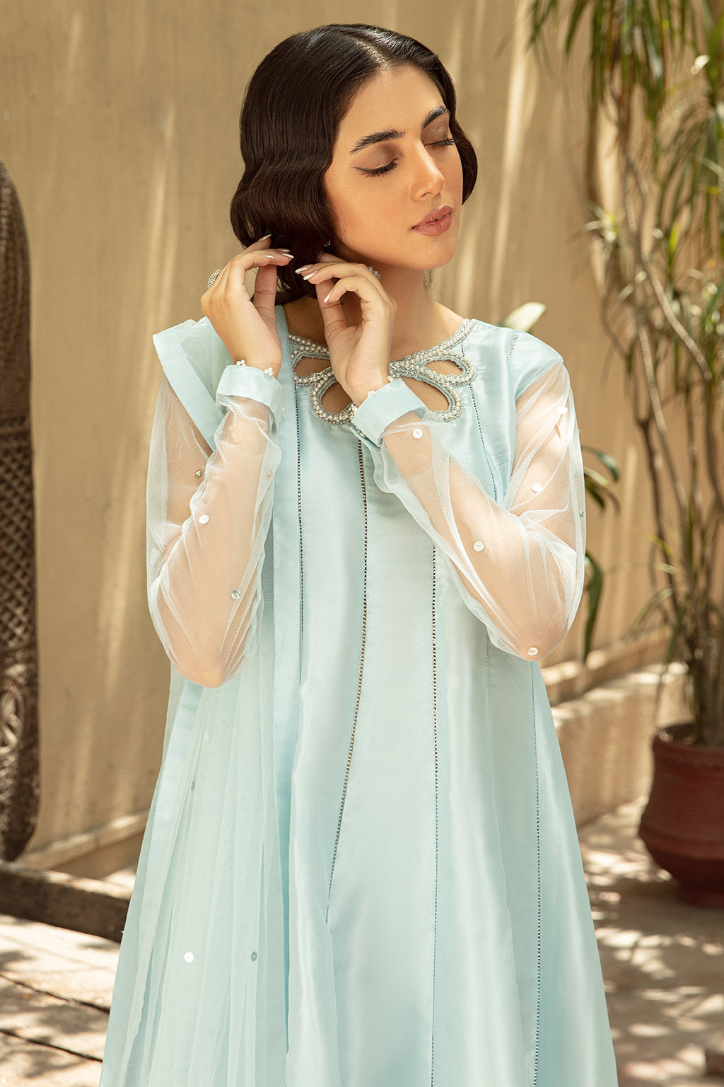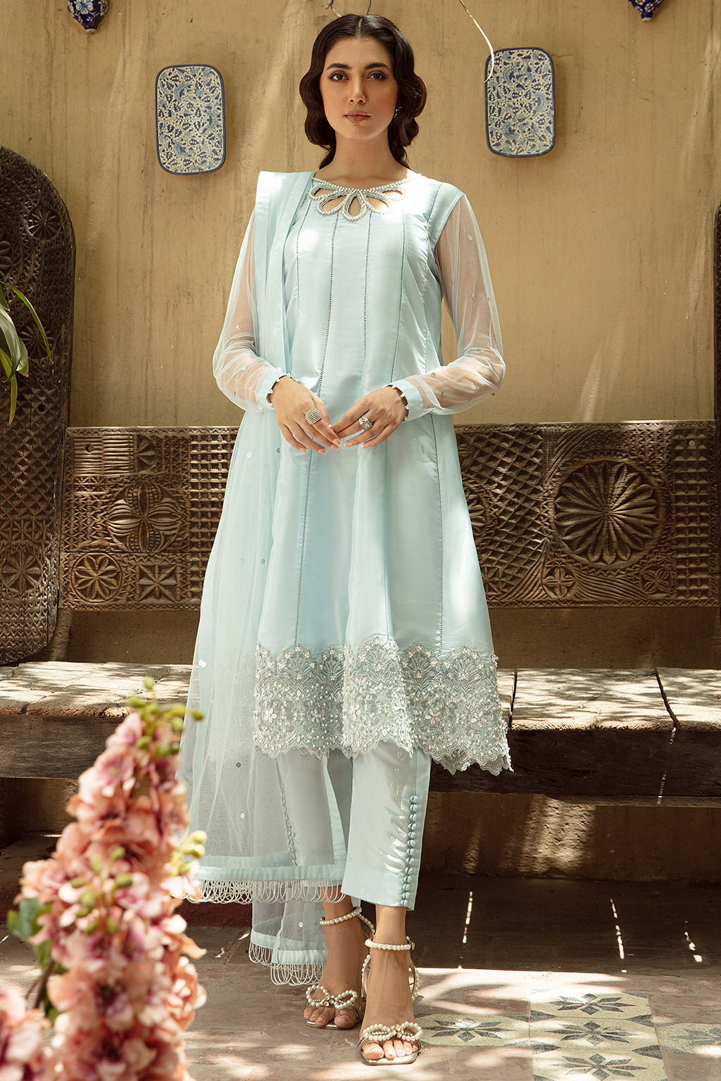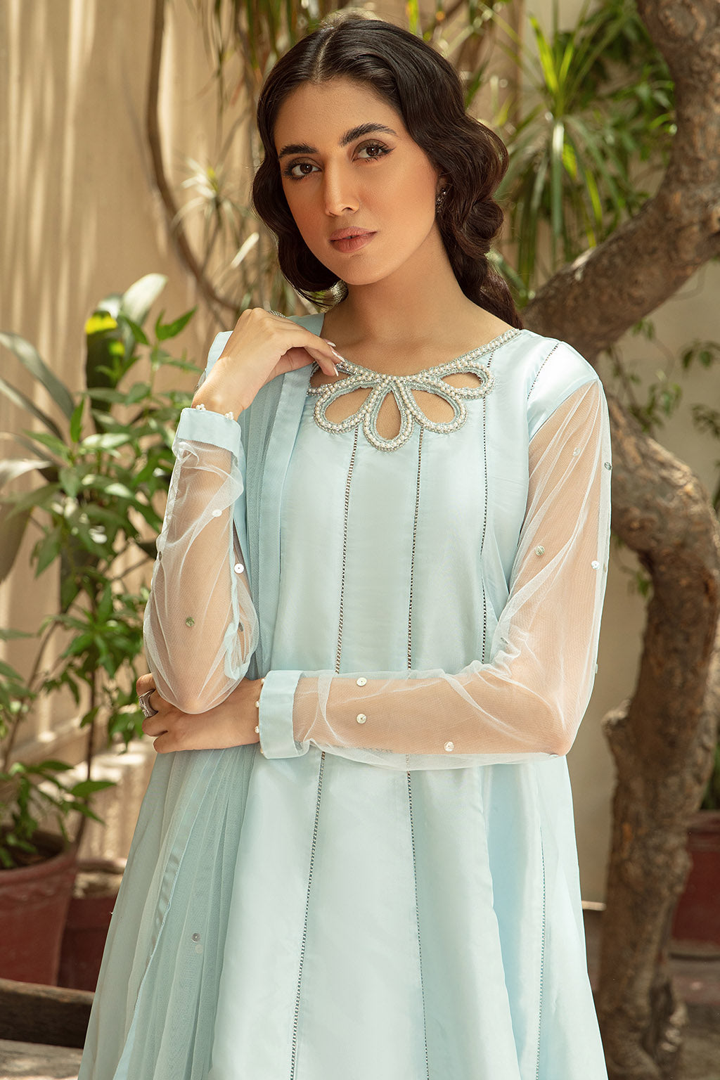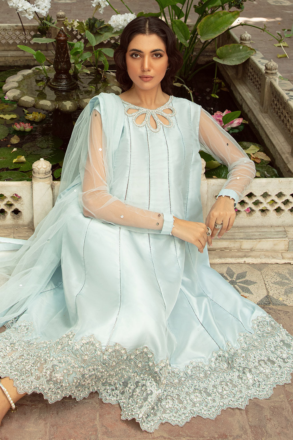 • A 3 PIECE KALI DAR FROCK WITH HEAVILY EMBELLISHED DAMAN.