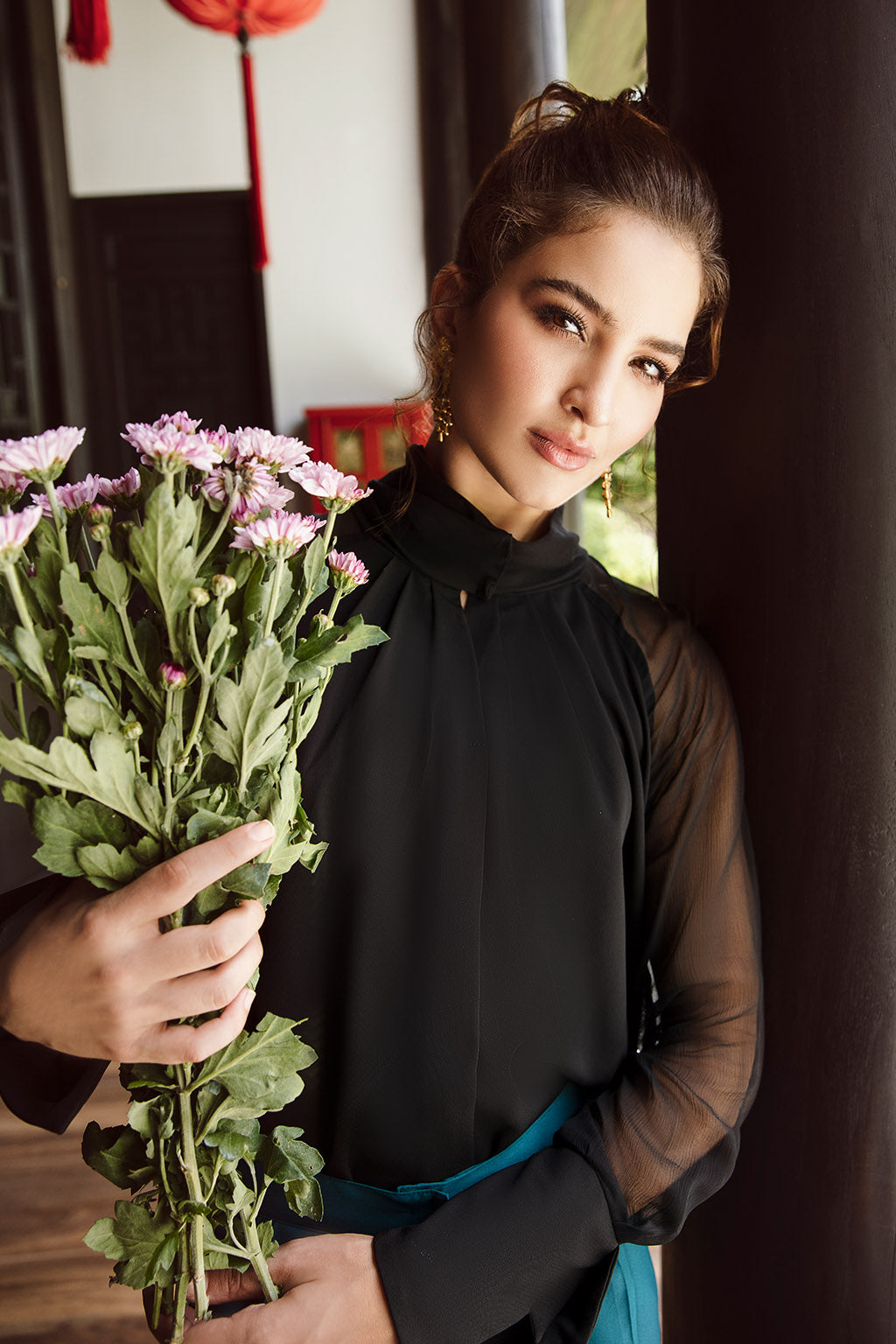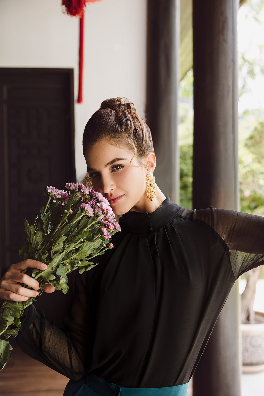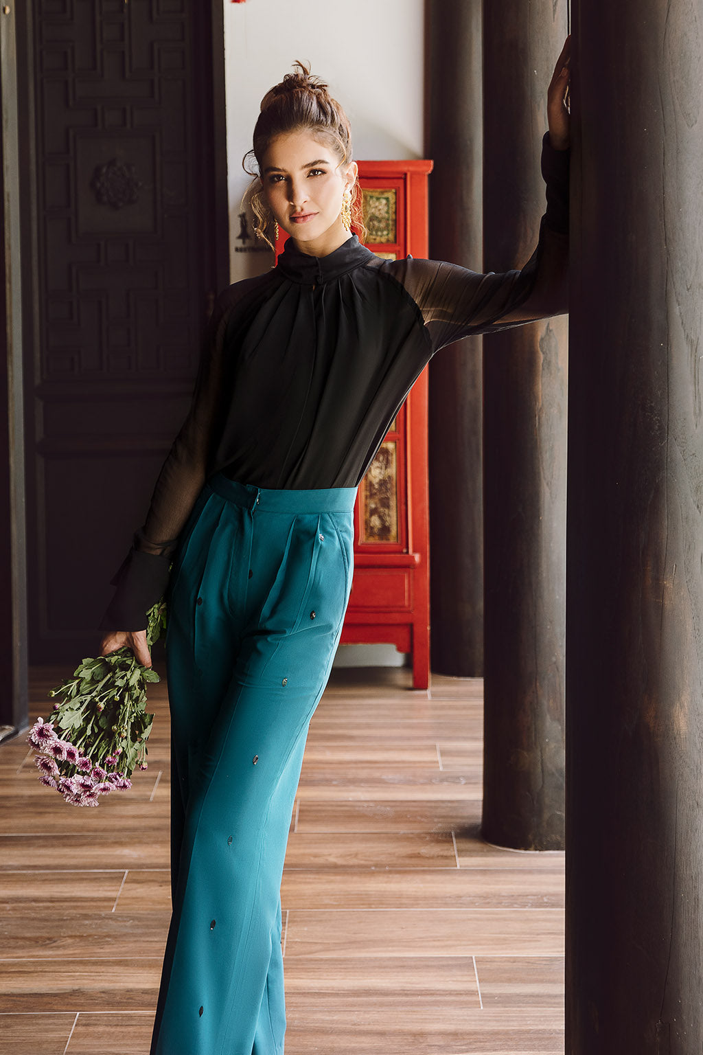 A modern raglan sleeved shirt made in georgette with chiffon sleeves having unique wrap style neckline.