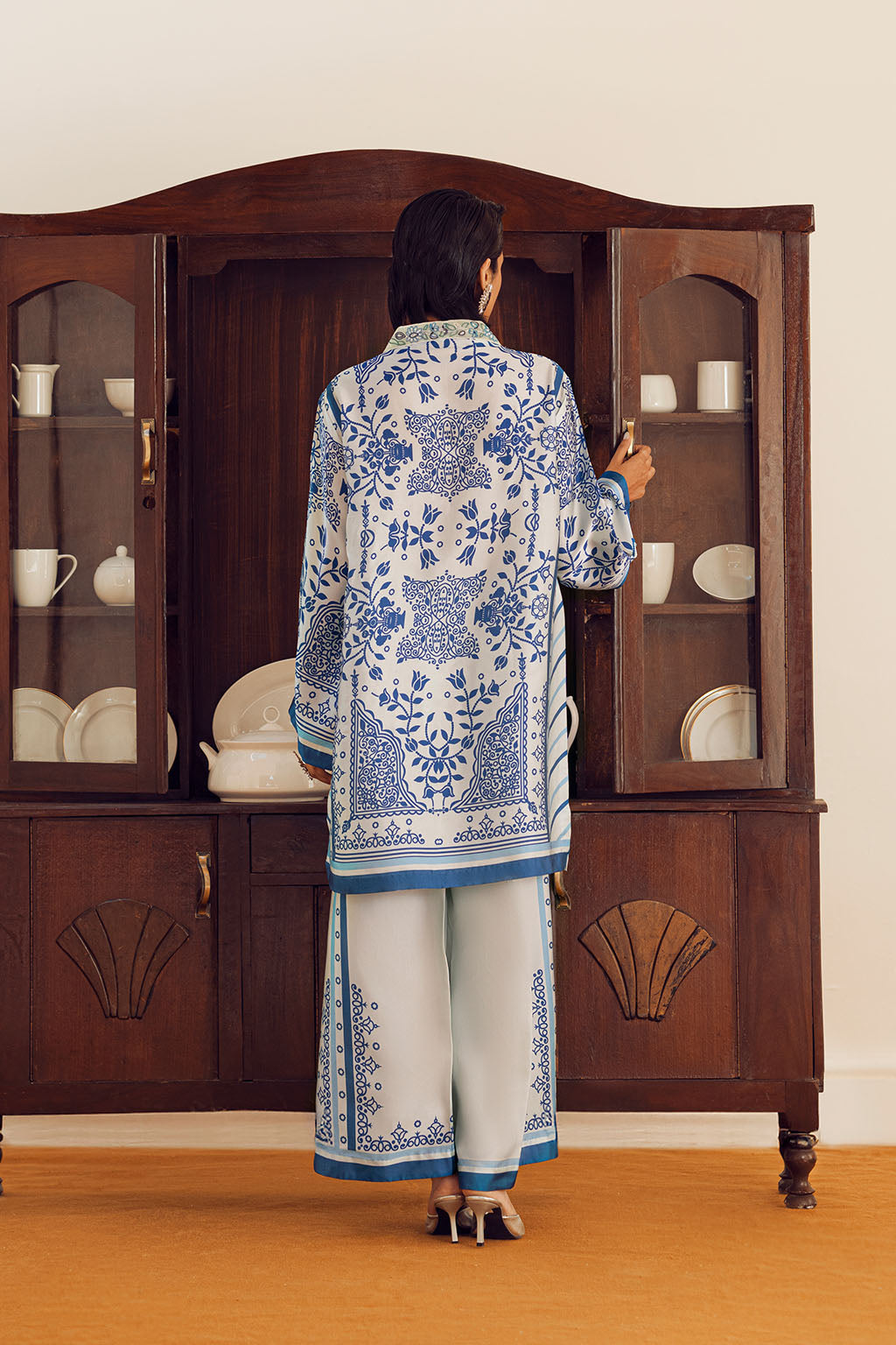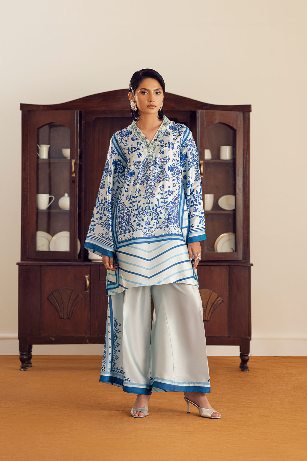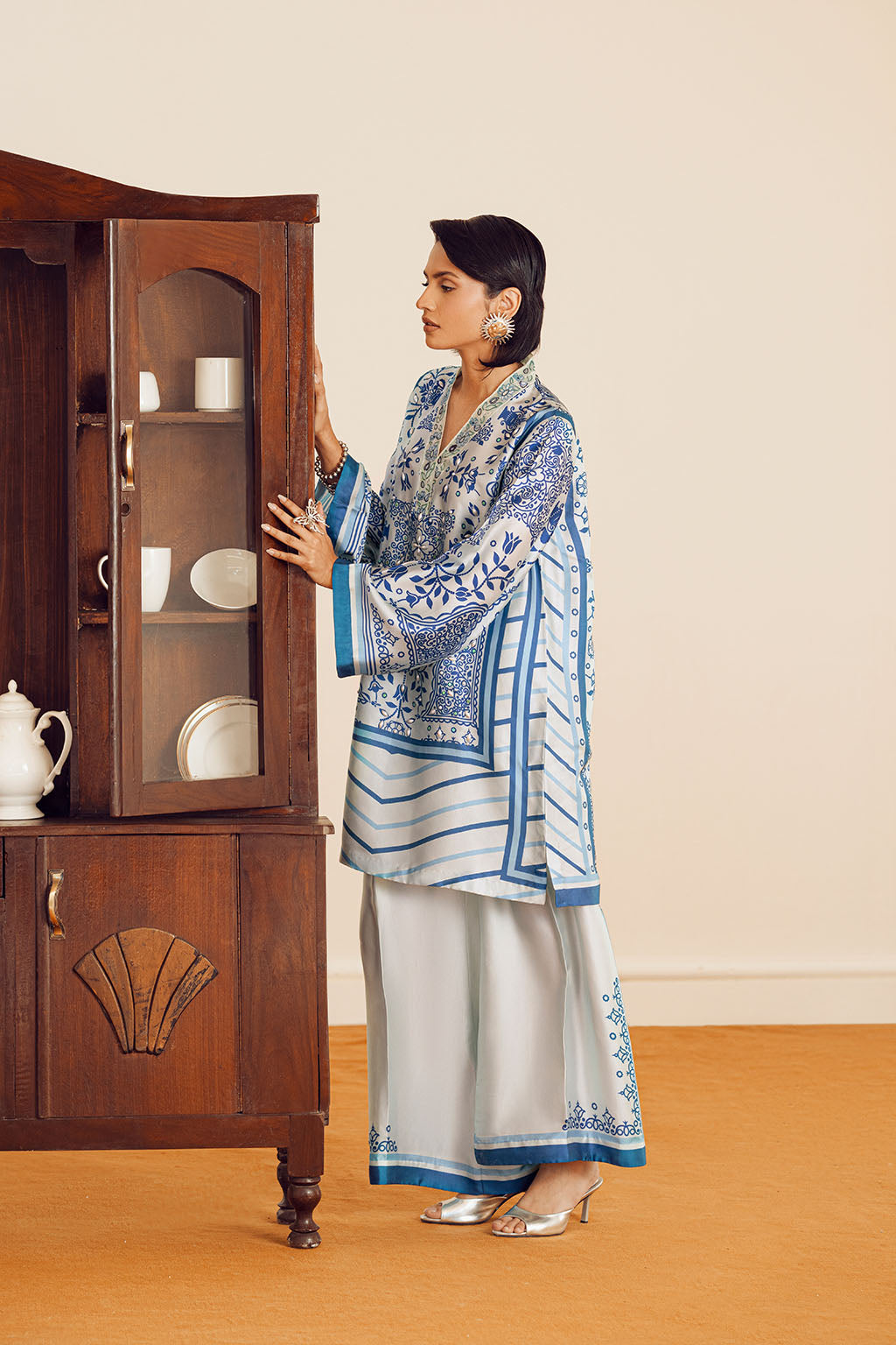 BORDER PAIRED WITH PRINTED SILK PANTS.