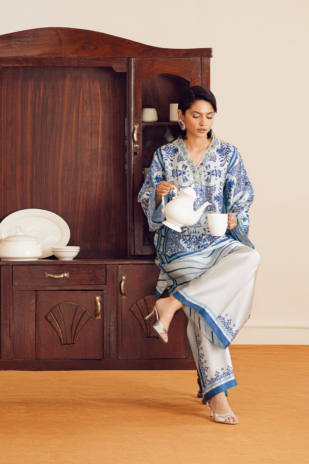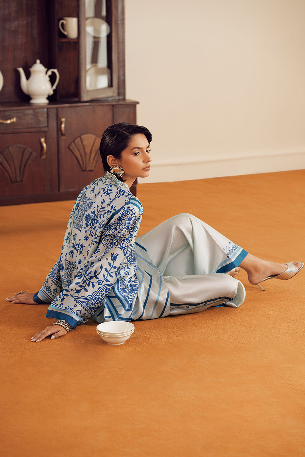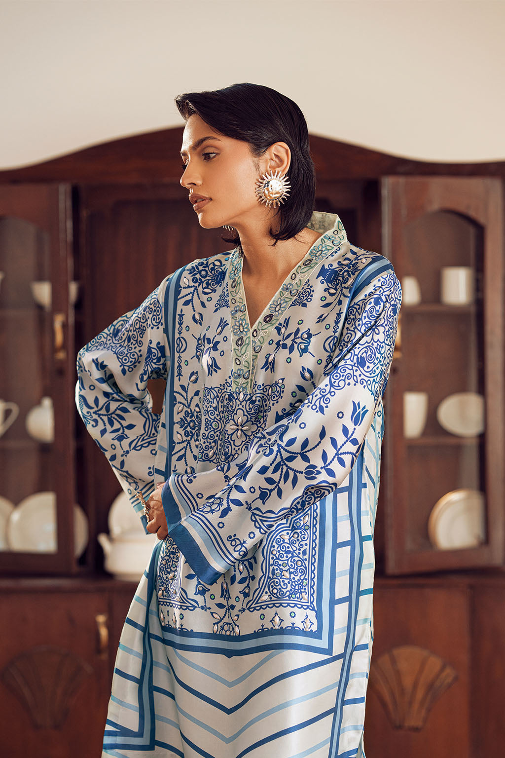 BORDER PAIRED WITH PRINTED SILK PANTS.