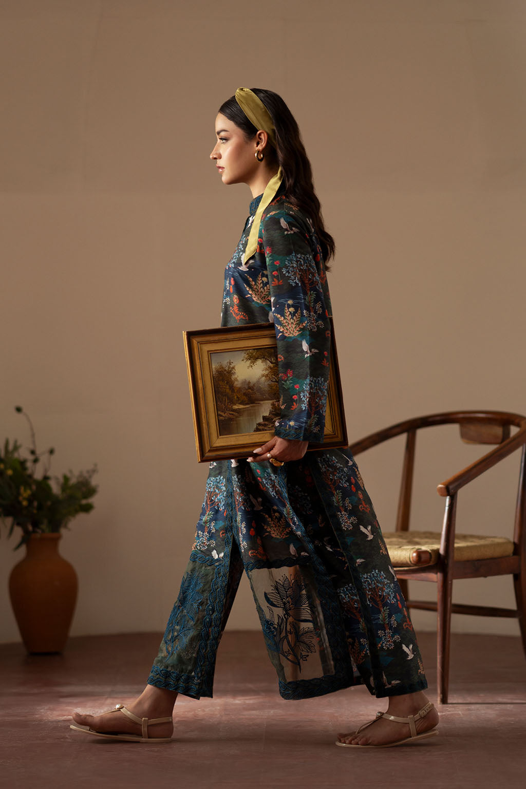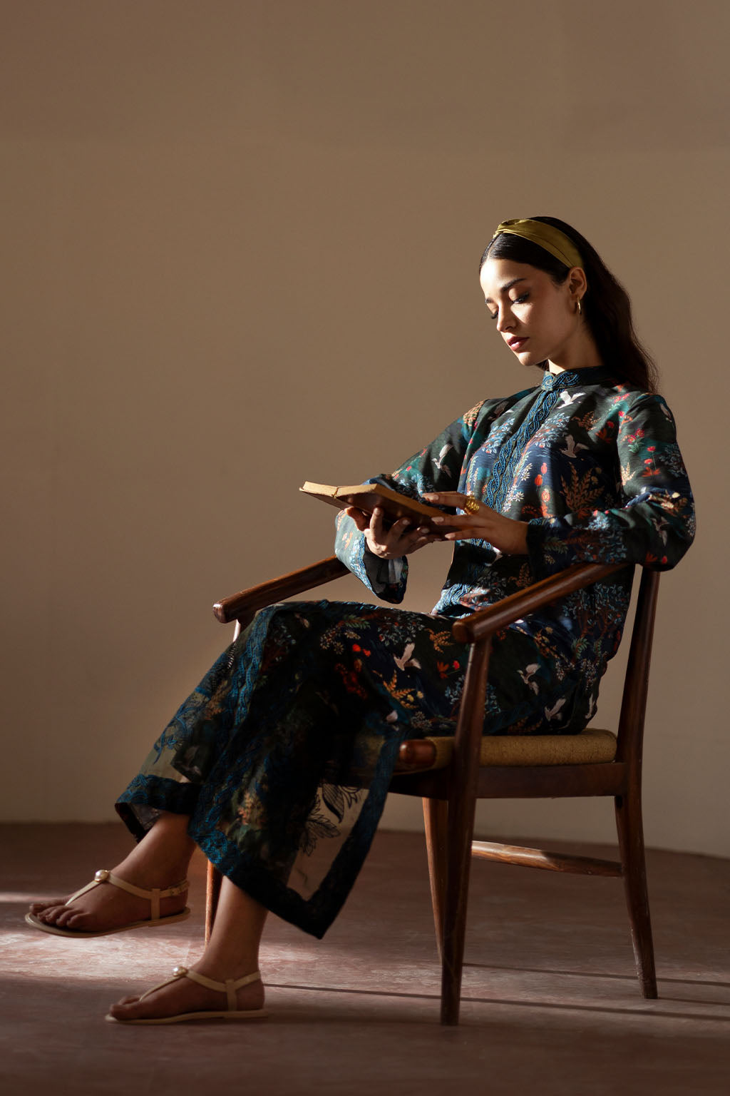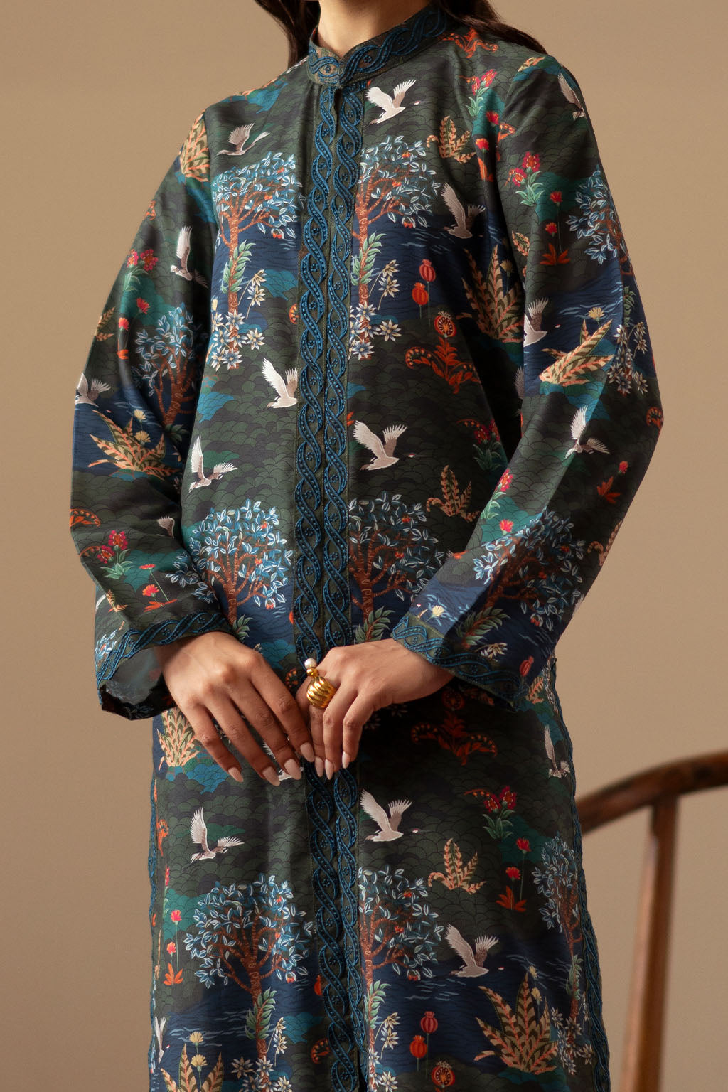 GREEN LONG SHIRT WITH EMBROIDERED DETAILS ON FRONT AND SLEEVES PAIRED WITH STRAIGHT TROUSERS.