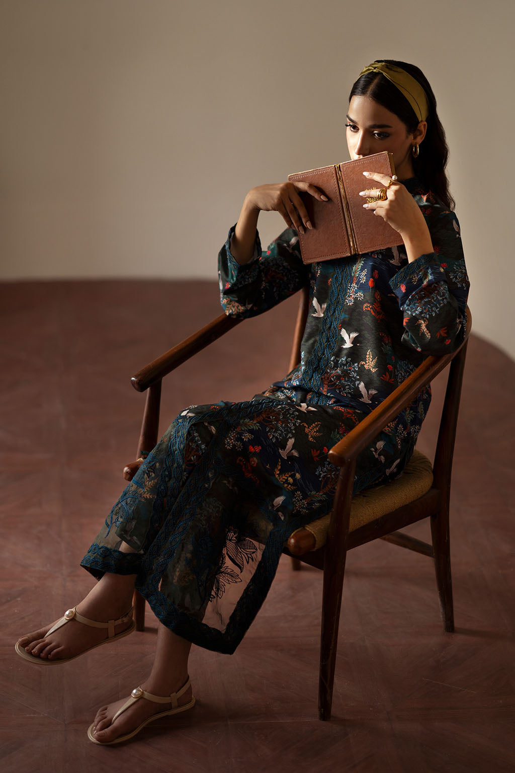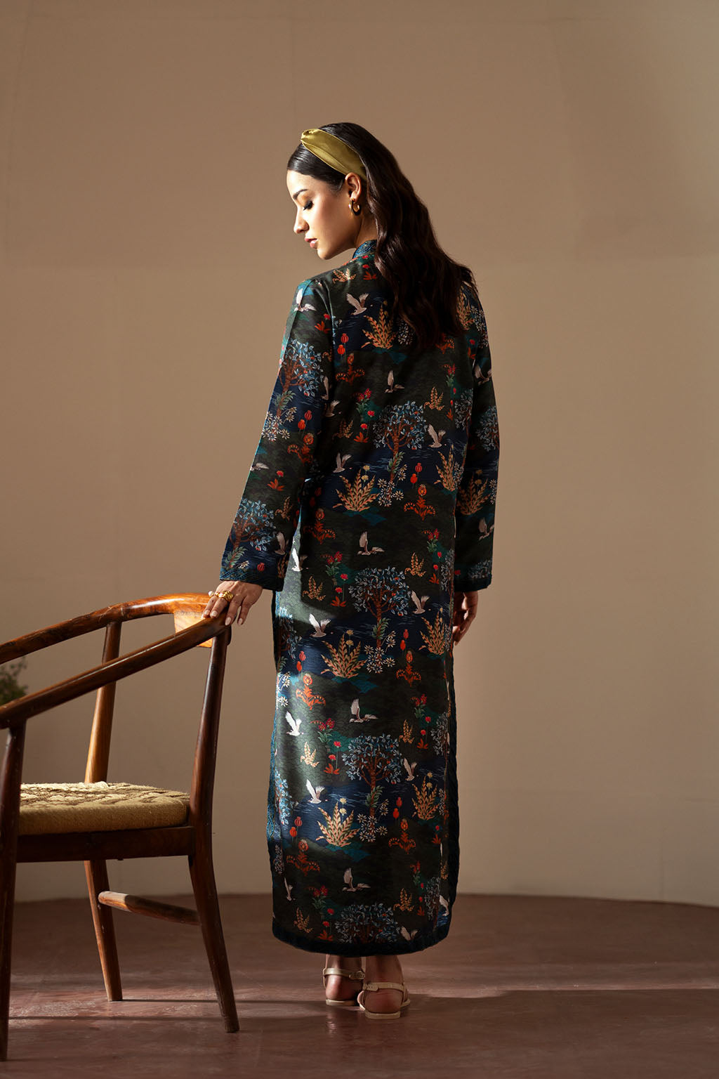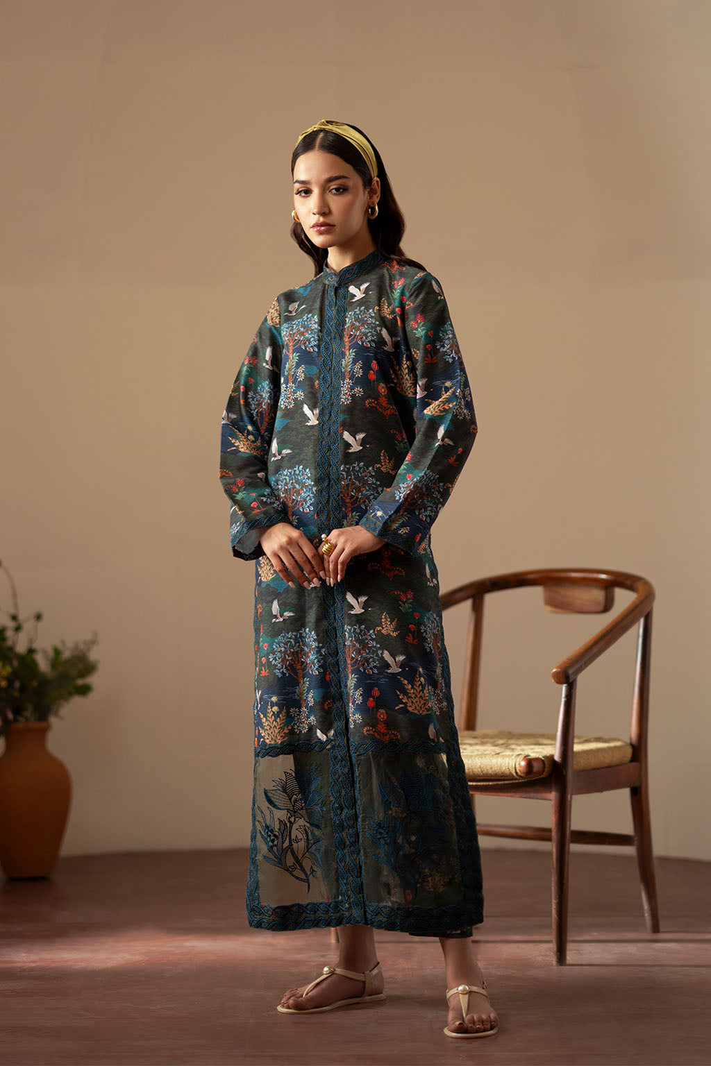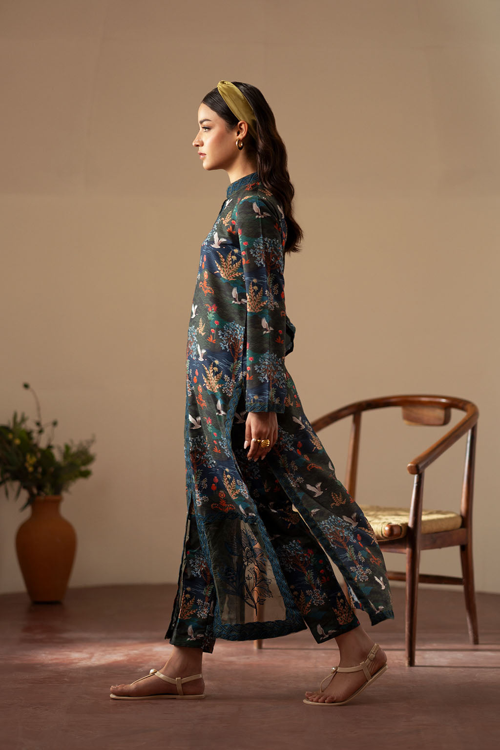 GREEN LONG SHIRT WITH EMBROIDERED DETAILS ON FRONT AND SLEEVES PAIRED WITH STRAIGHT TROUSERS.