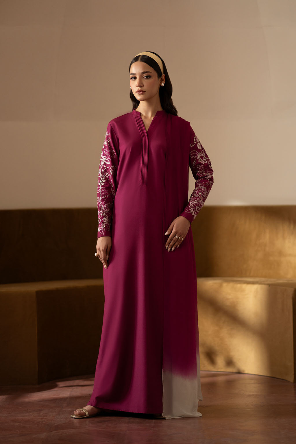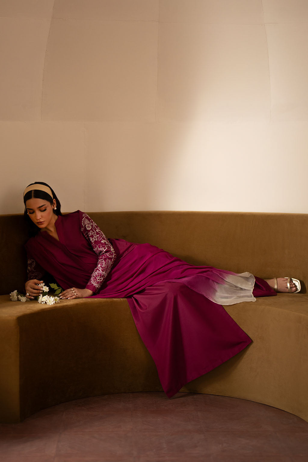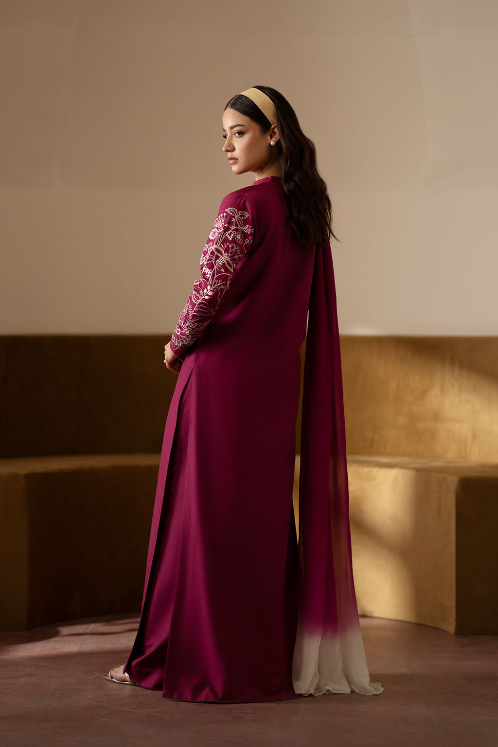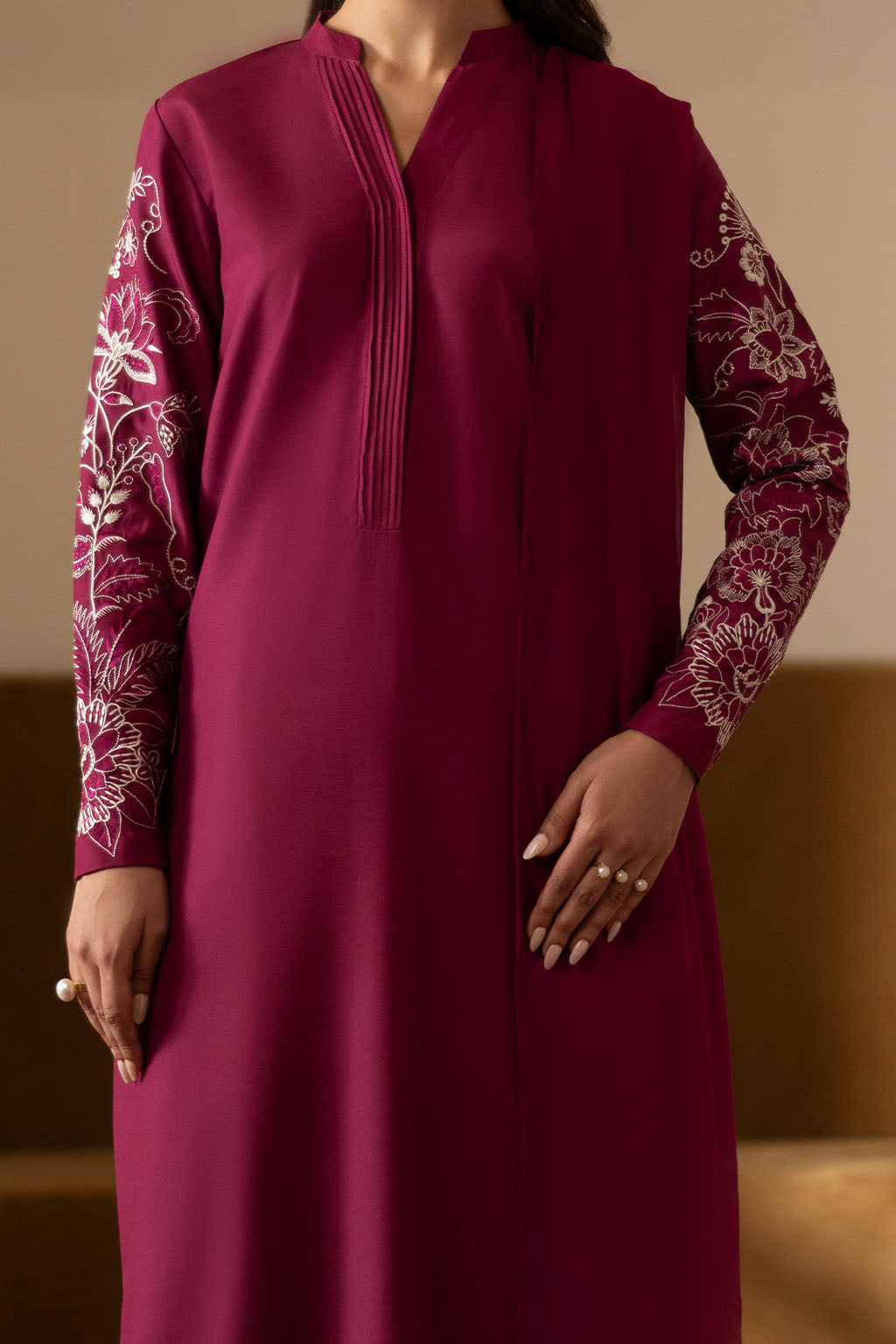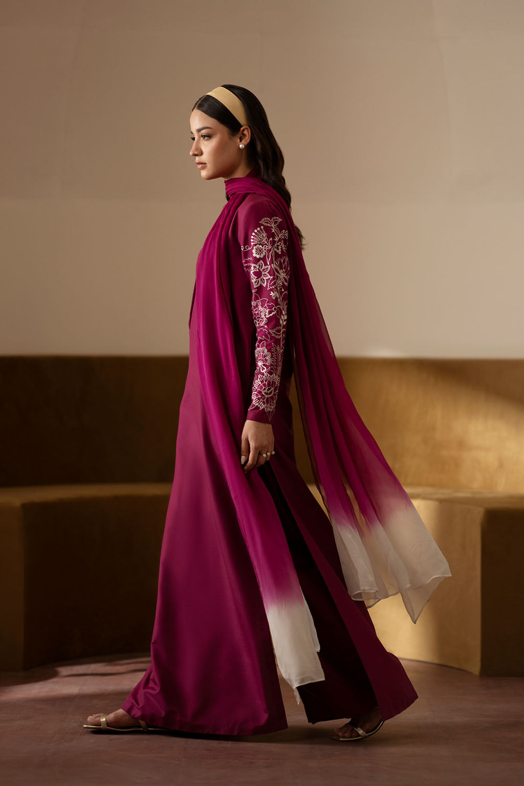 A MAGENTA LONG SHIRT WITH EMBROIDERED SLEEVES, PAIRED WITH MATCHING PLAZO