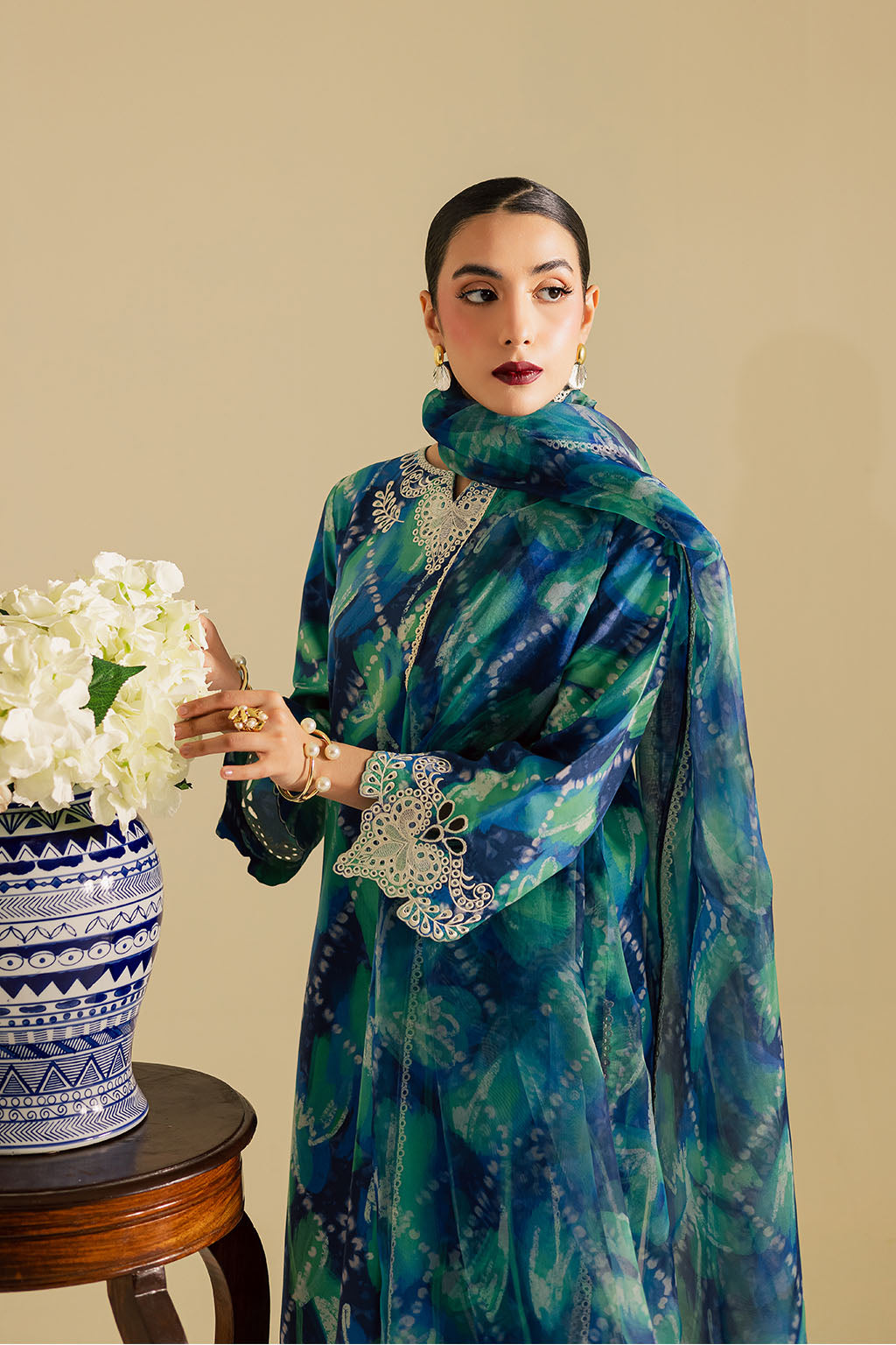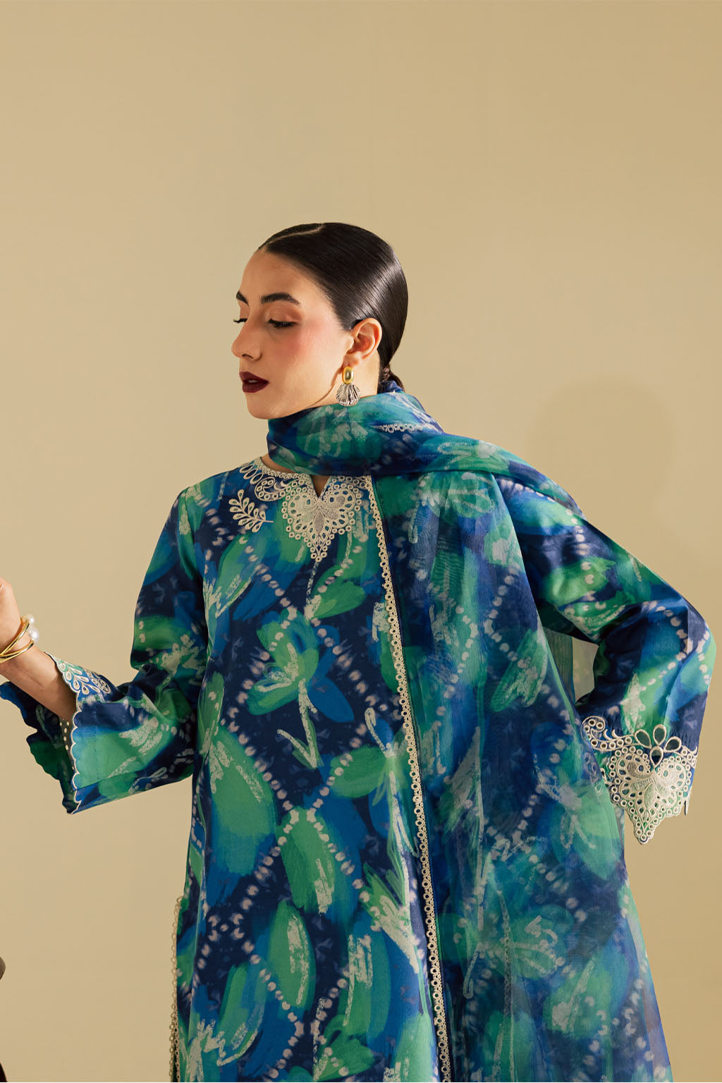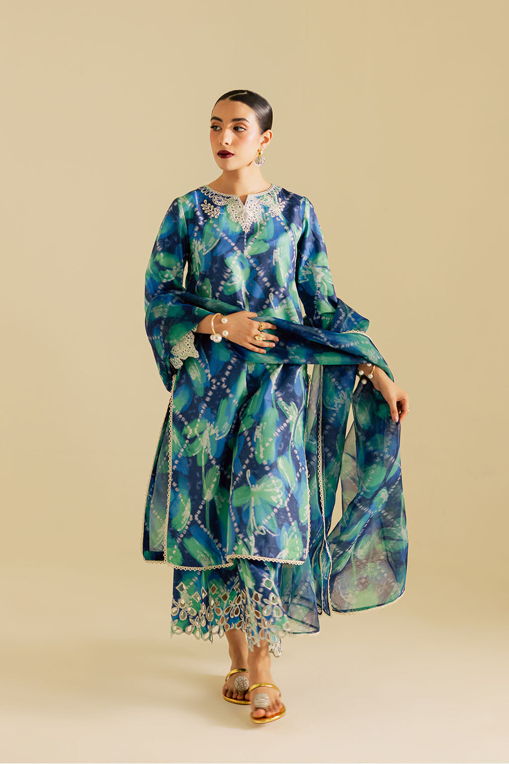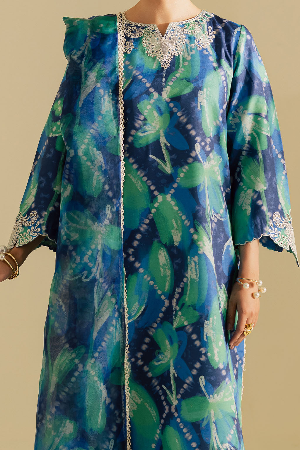 Printed shirt with schiffli embroidered neckline and sleeves, paired with schiffli culottes and organza print dupatta