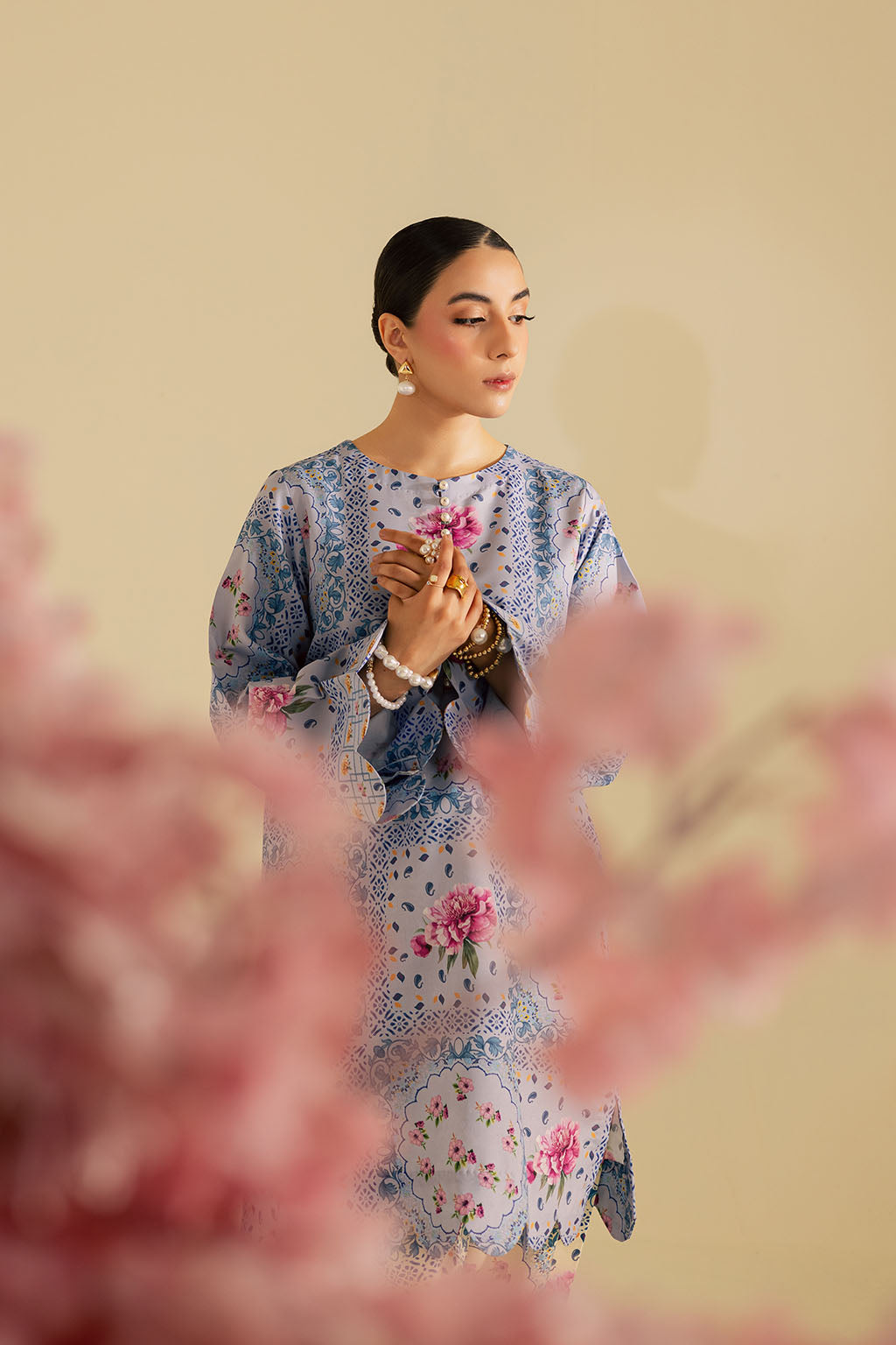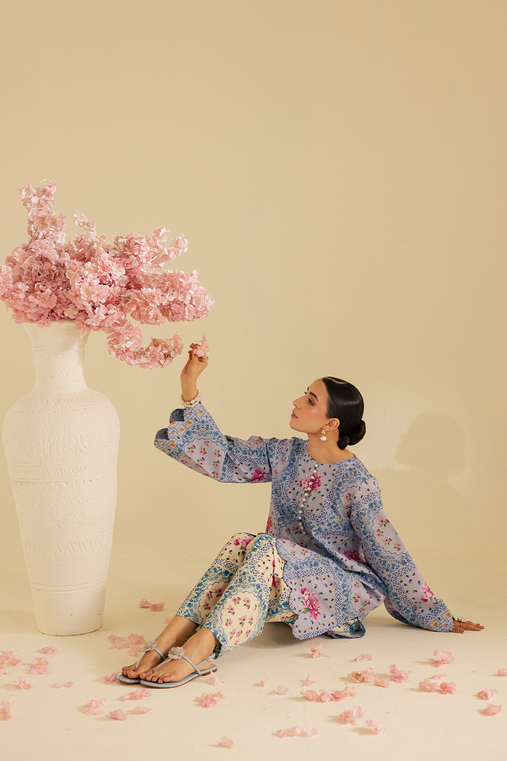 Printed scalloped kurta with embellished details on neckline, paired with contrasting print sleek shalwar pants