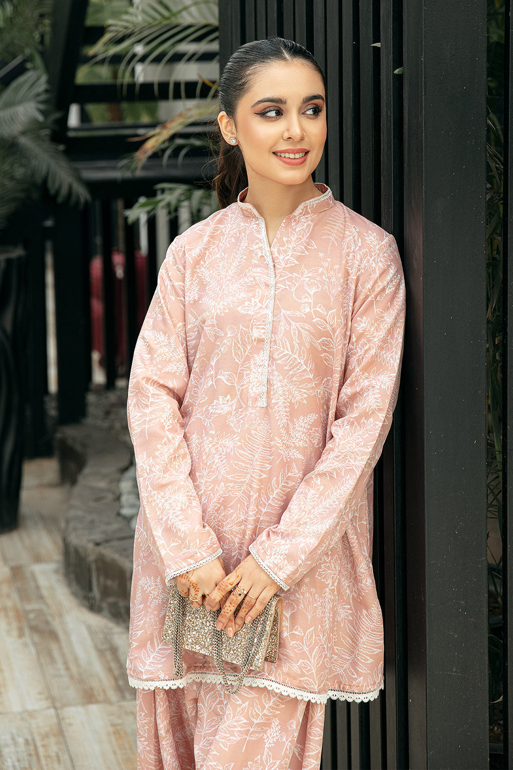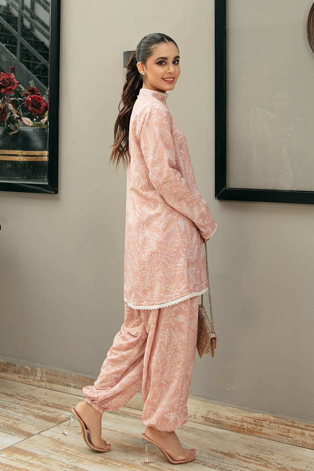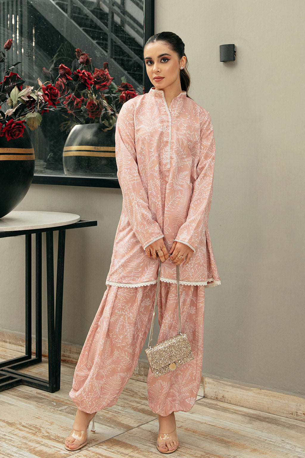 Powder Blush Pink Based With a Contrasting Beige Self Tone Printed Shirt Paired With a Jasmine Style Capri Shalwar