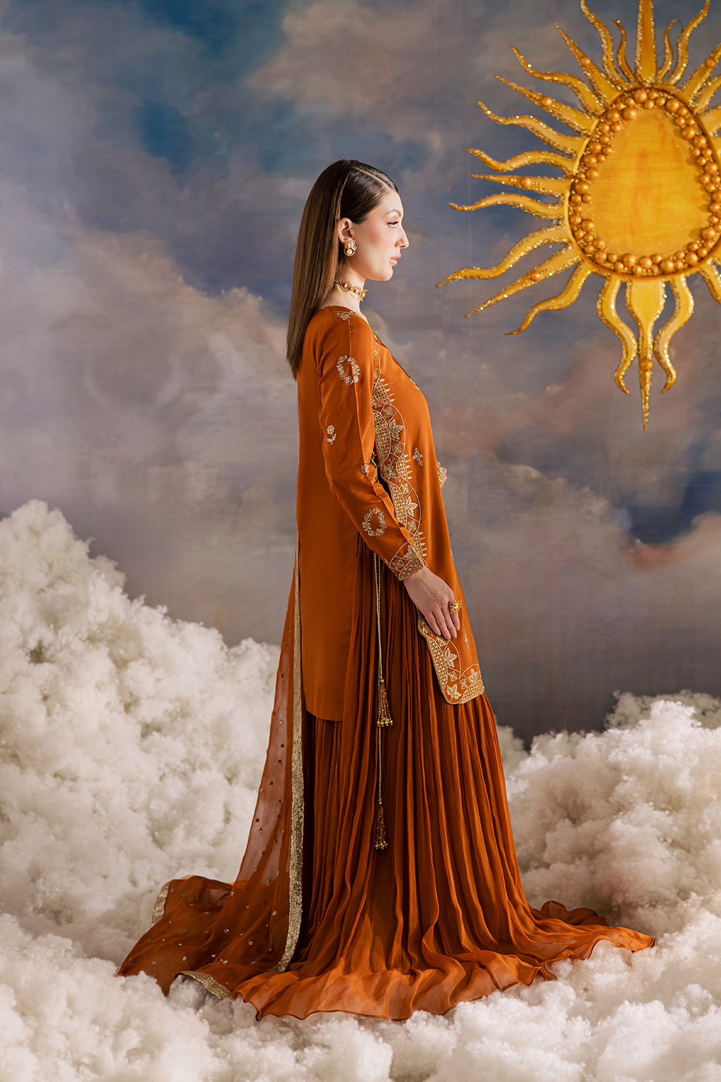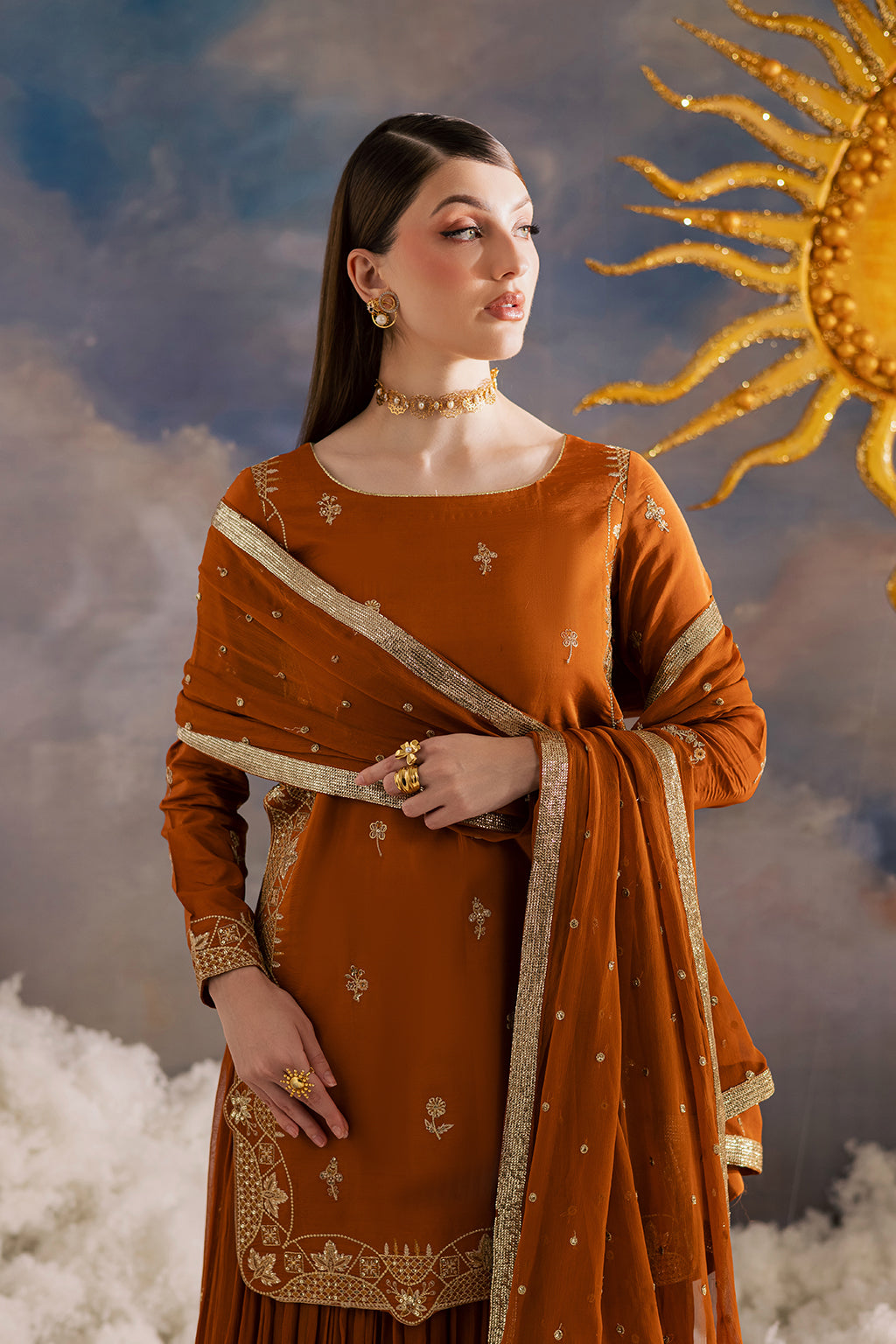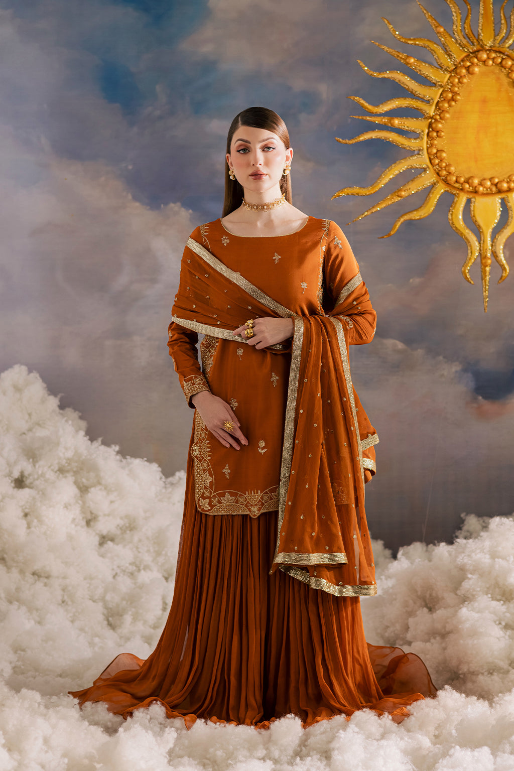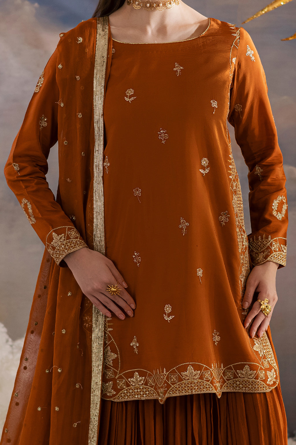 Embroidered silk shirt paired with chiffon crushed sharara pants and embroidered chiffon dupatta.