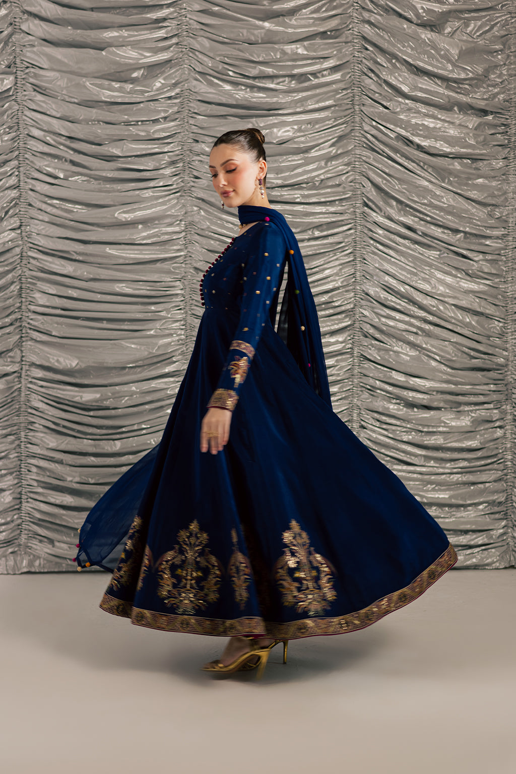 Embroidered silk frock paired with silk pants and embroidered chiffon dupatta.