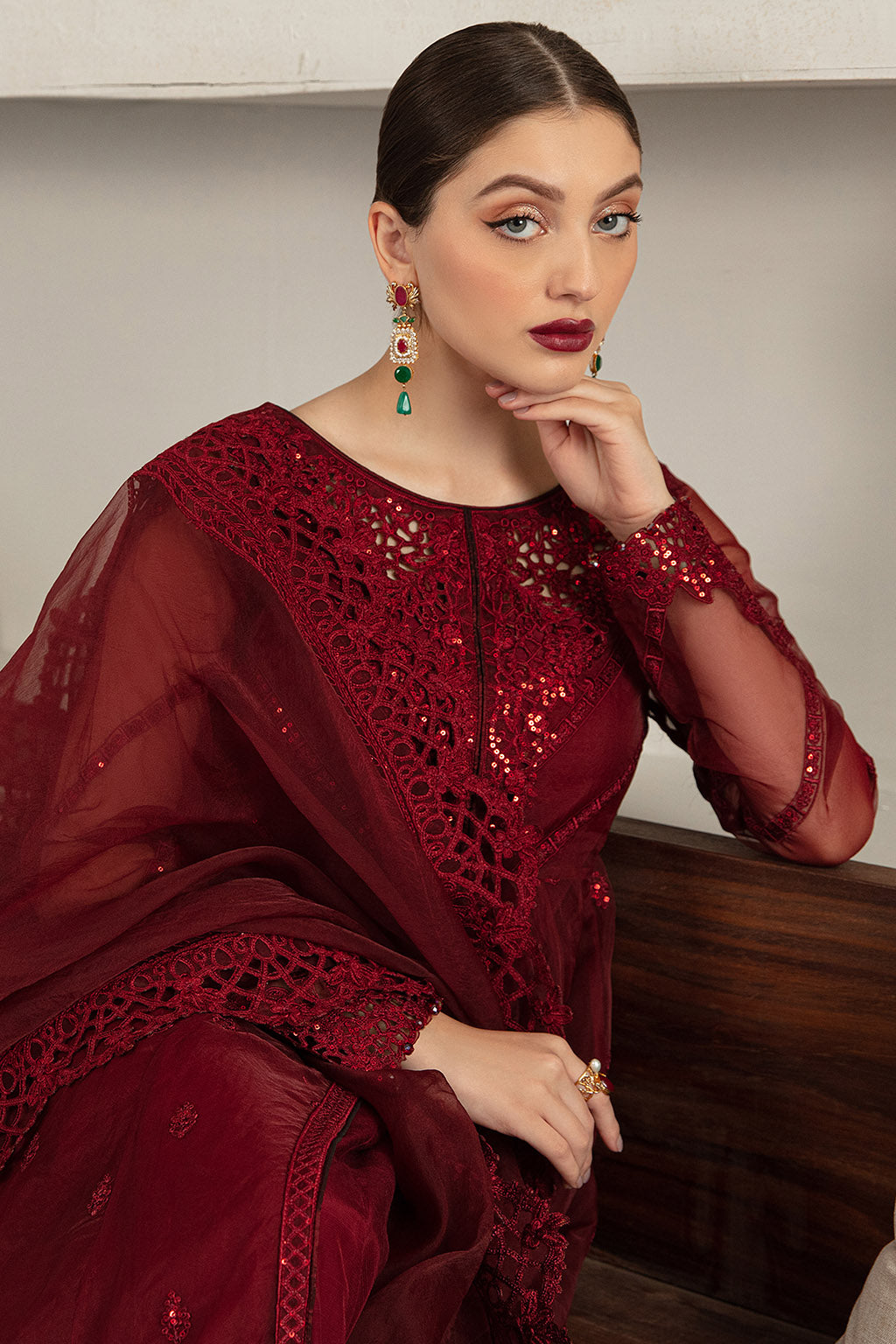 This 3 piece maroon pishwas is gorgeously detailed with embroidery work on the bodice adorned with heavily embroidered work border, embellished borders paired with organza dupatta featuring heavy embellished four sided borders.