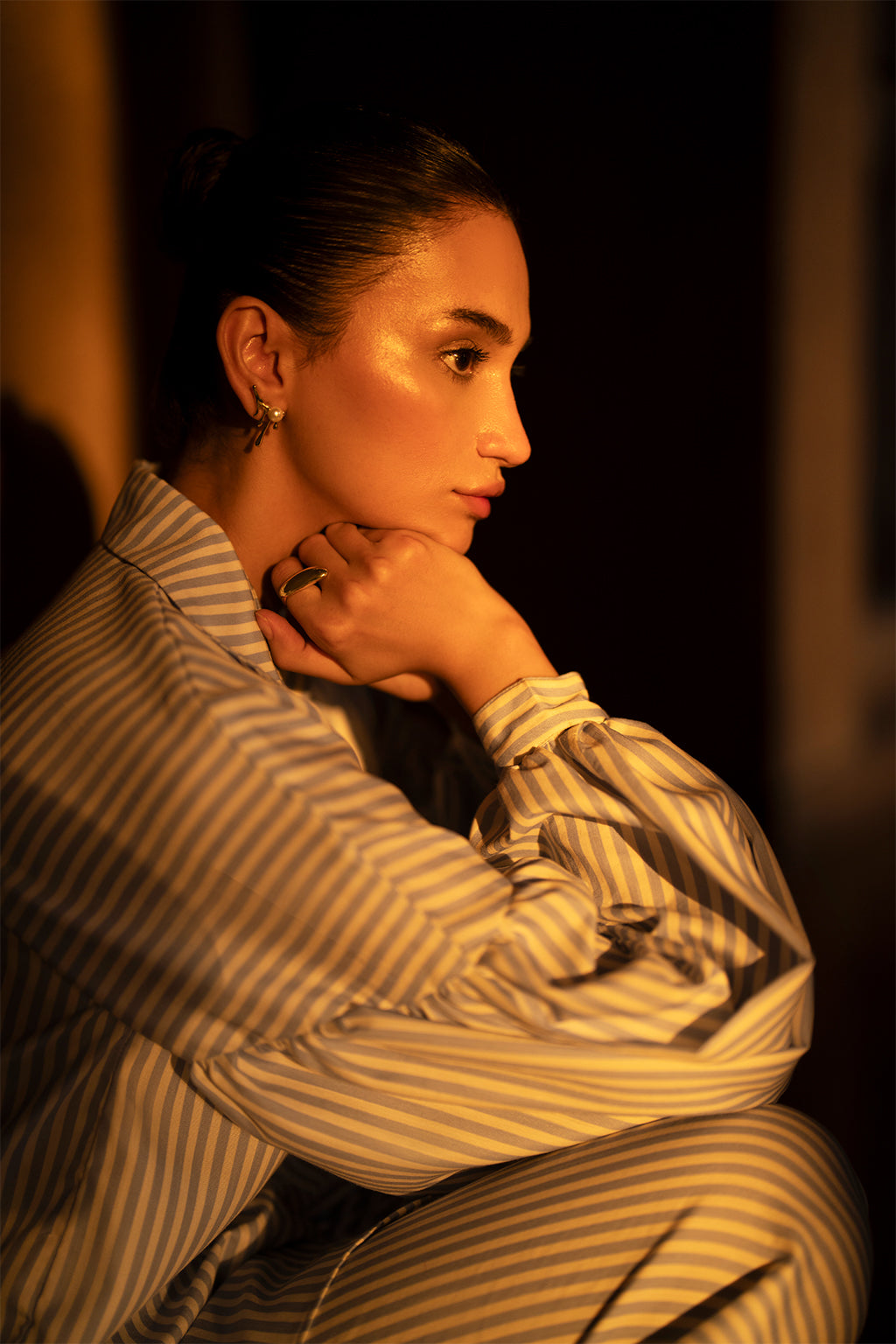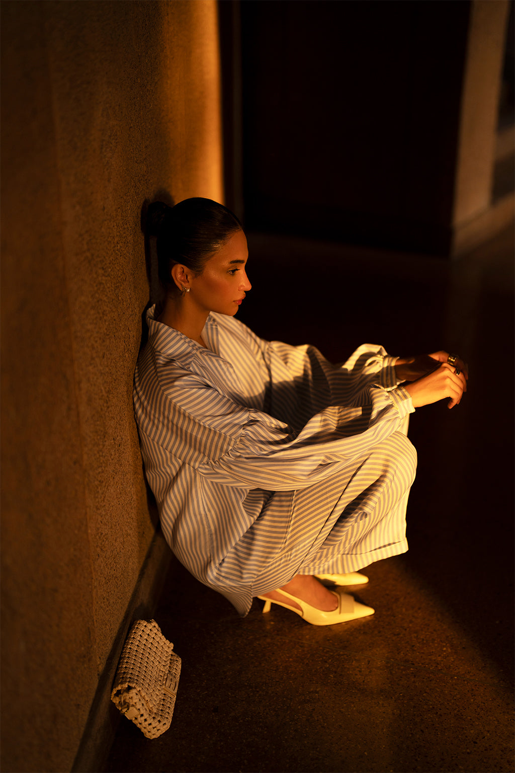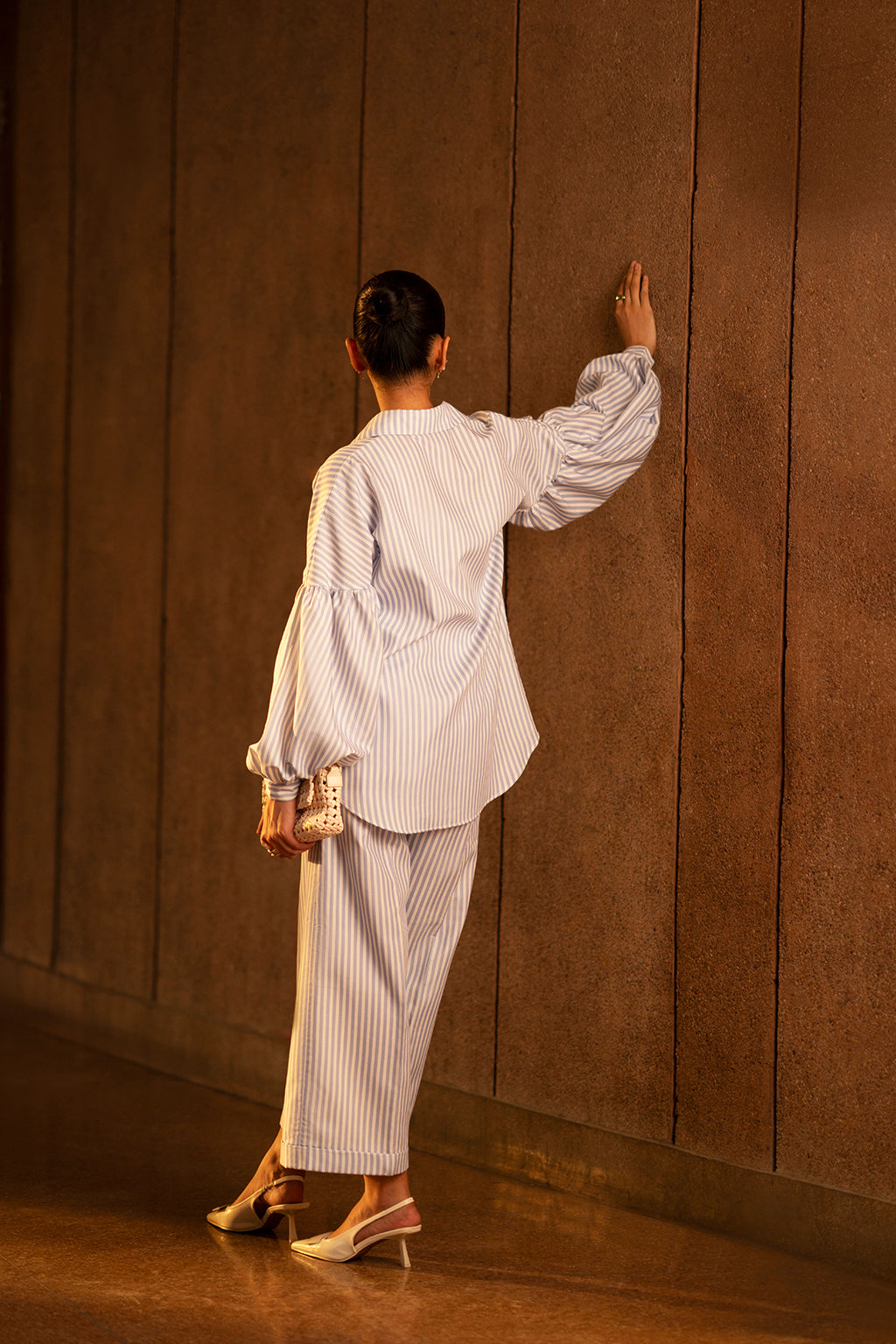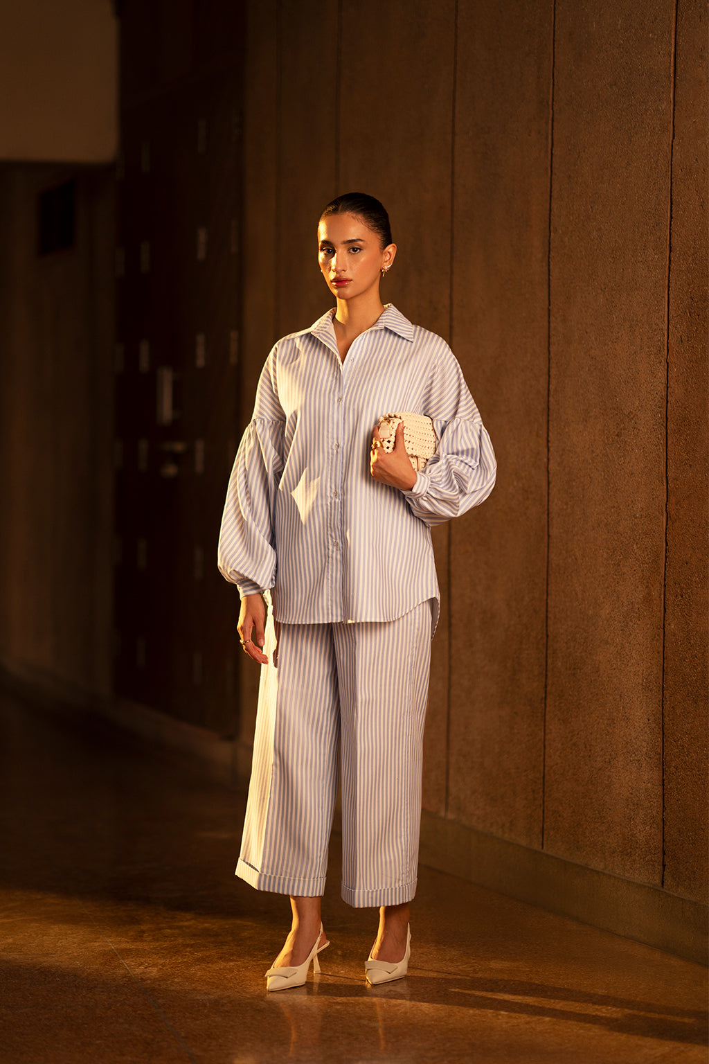 Blue and white striped button down shirt with balloon sleeves, paired with culottes.