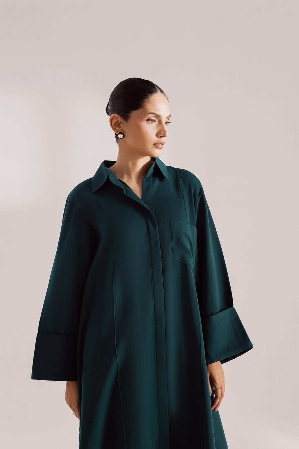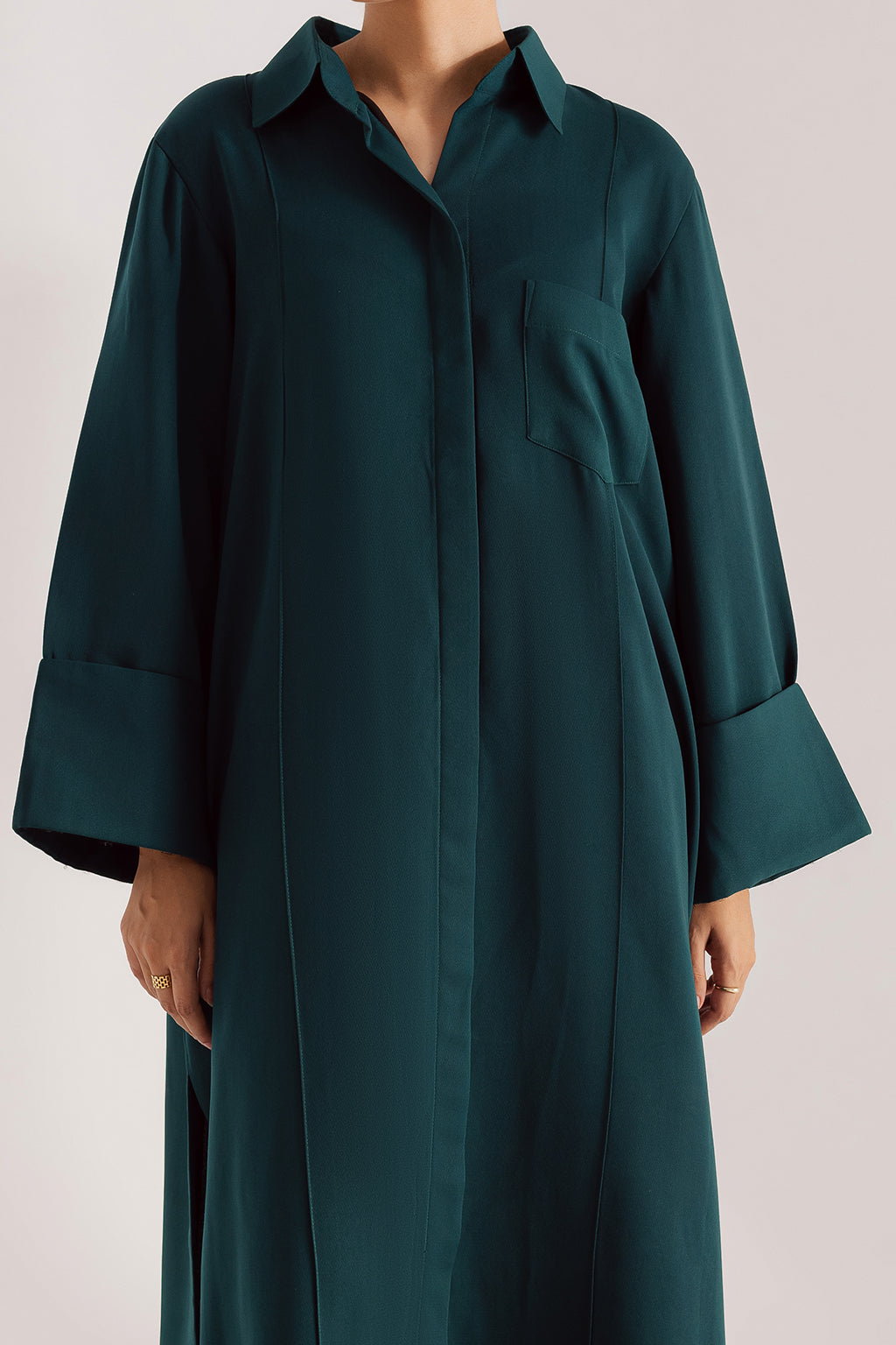 Deep teal georgette long shirt with a structured collar, front pocket, and wide cuff sleeves. Finished with side slits for a sleek, contemporary look.