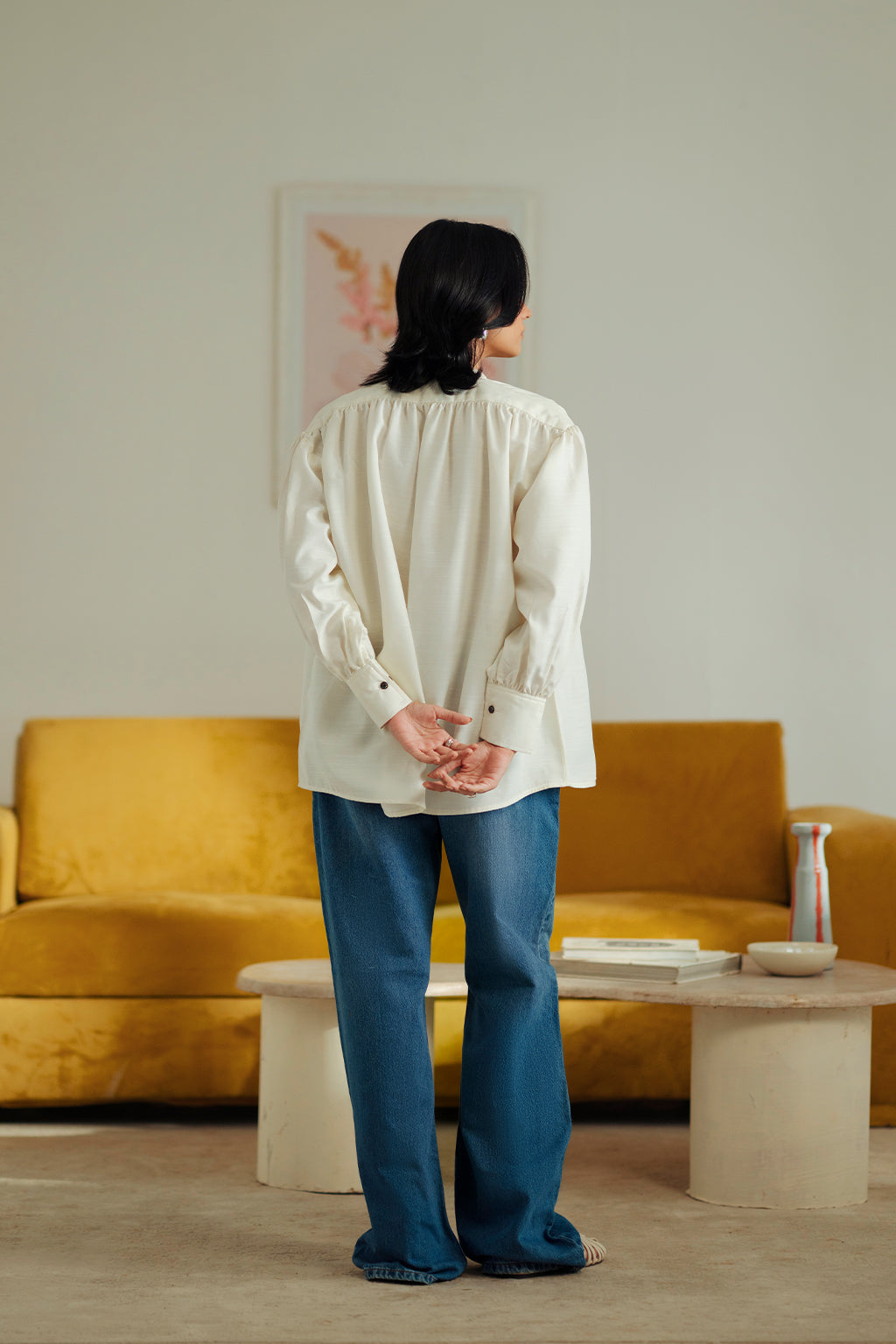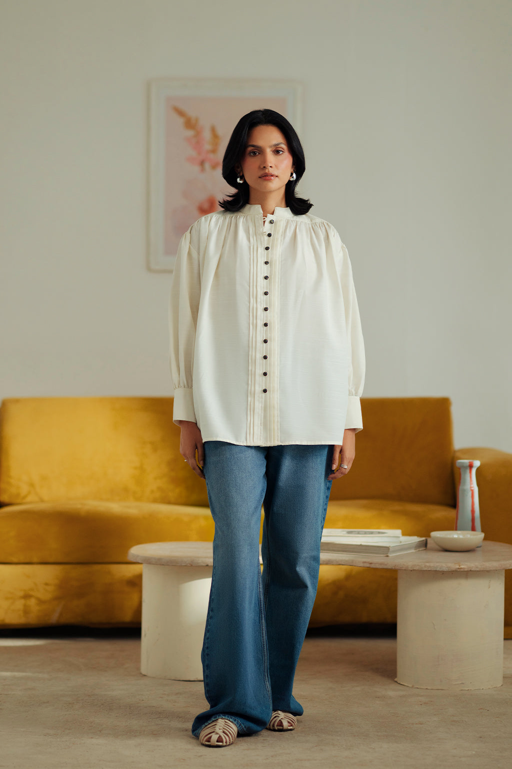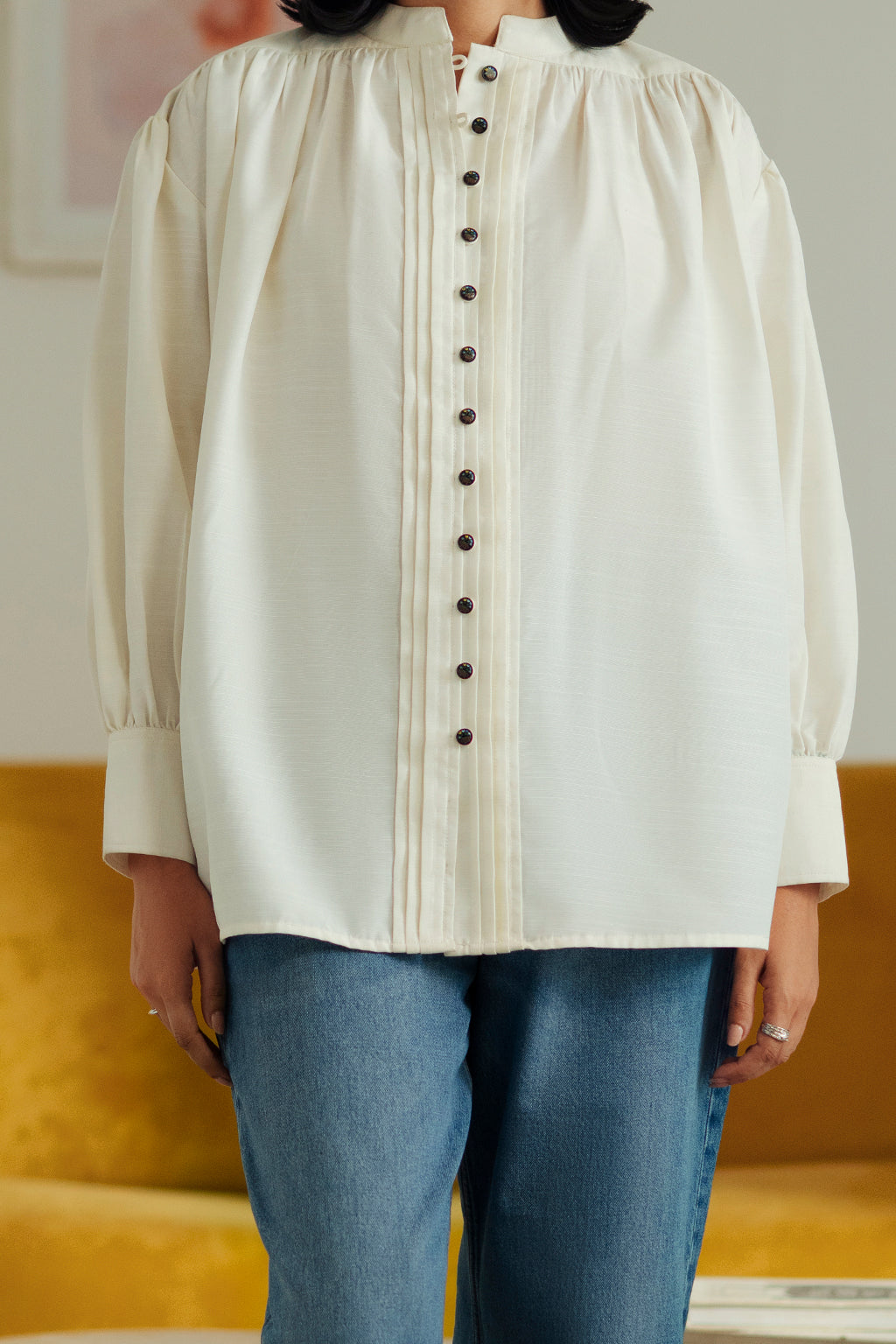Off-white cotton loose-fit shirt with a high mandarin collar and along front button placket. It features pin-tuck detailing on both sides of the buttons and soft gathers at the shoulders for volume.