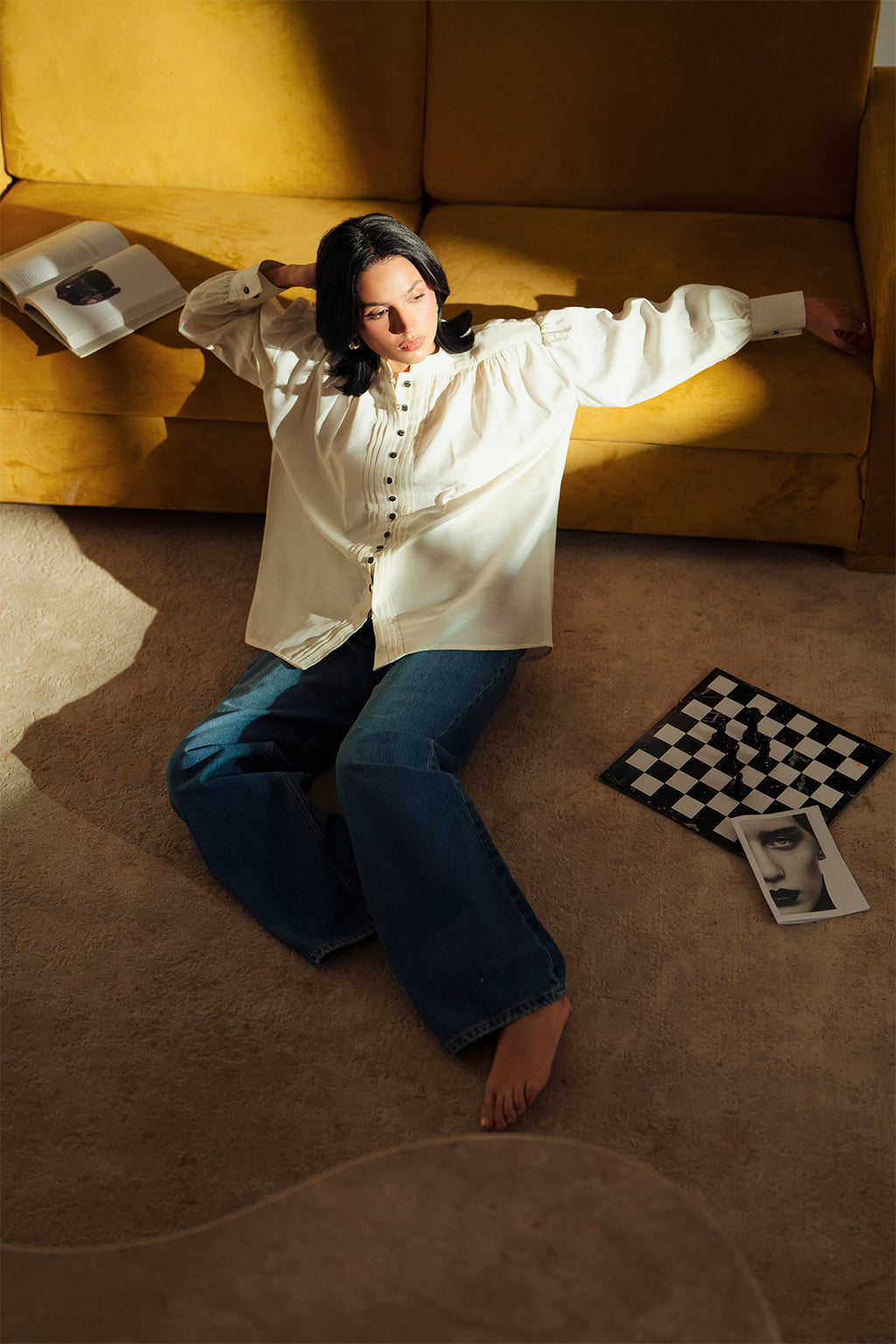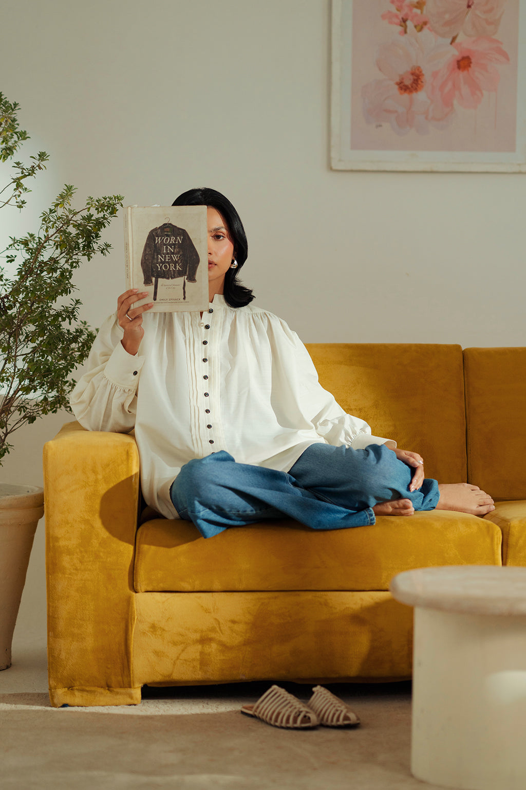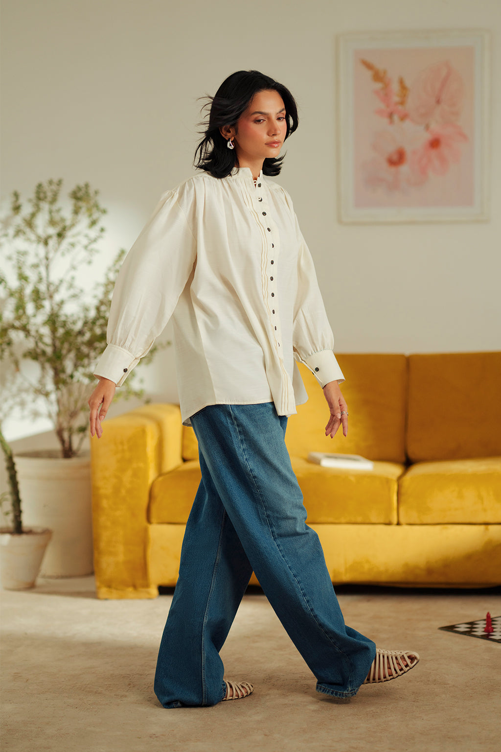 Off-white cotton loose-fit shirt with a high mandarin collar and along front button placket. It features pin-tuck detailing on both sides of the buttons and soft gathers at the shoulders for volume.