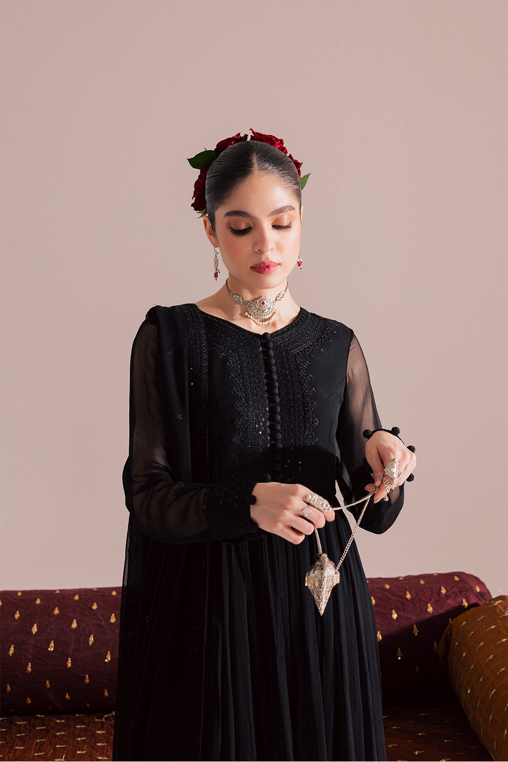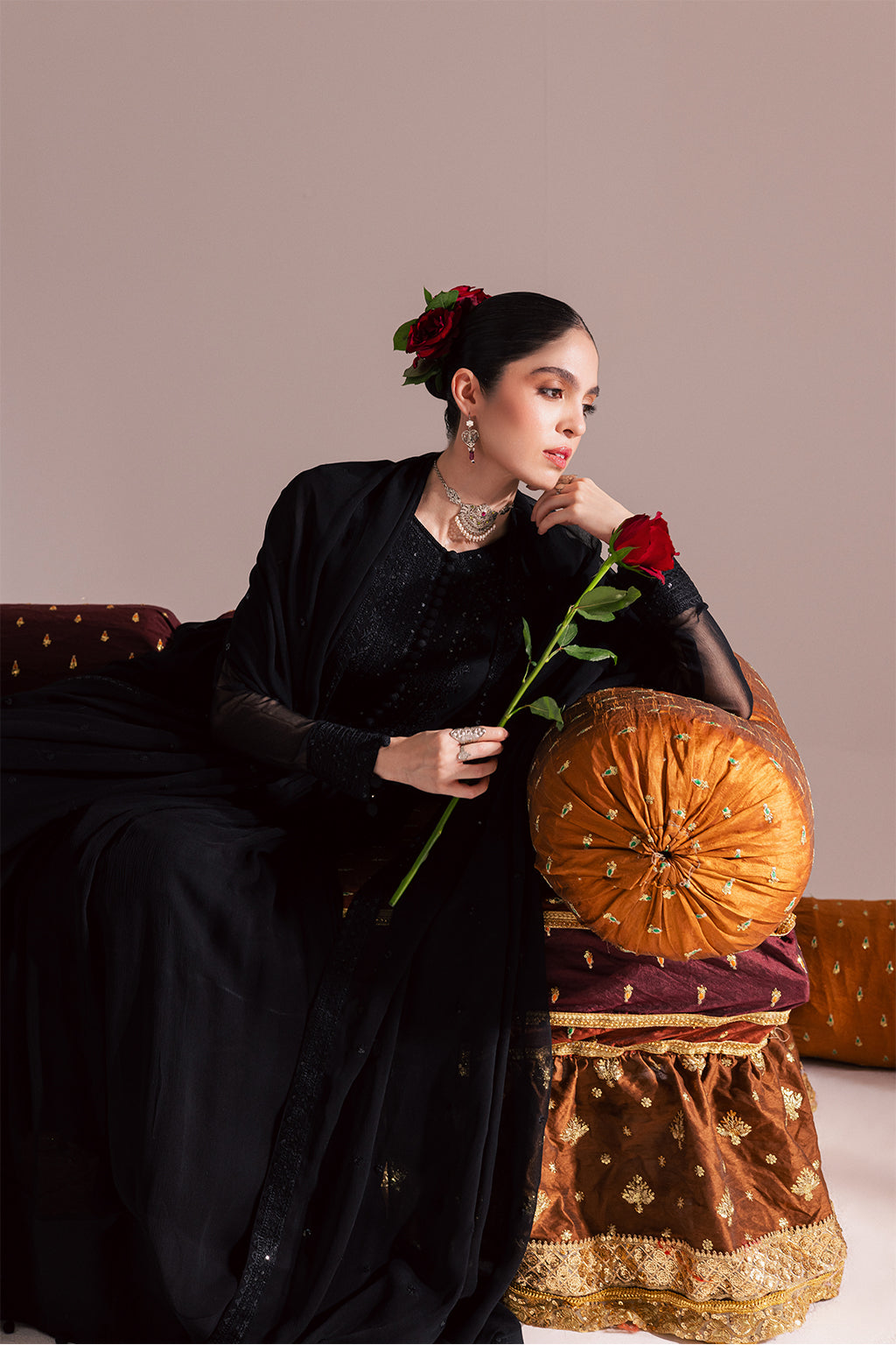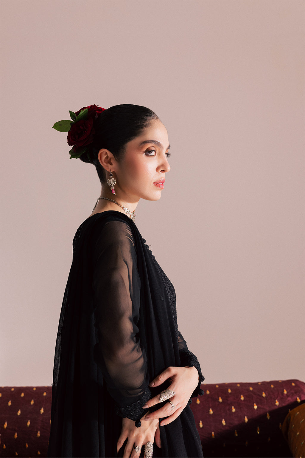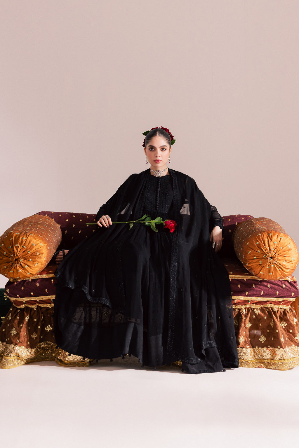 Black embroidered chiffon pishwas paired with an embroidered chiffon dupatta and plain raw silk flared trousers.