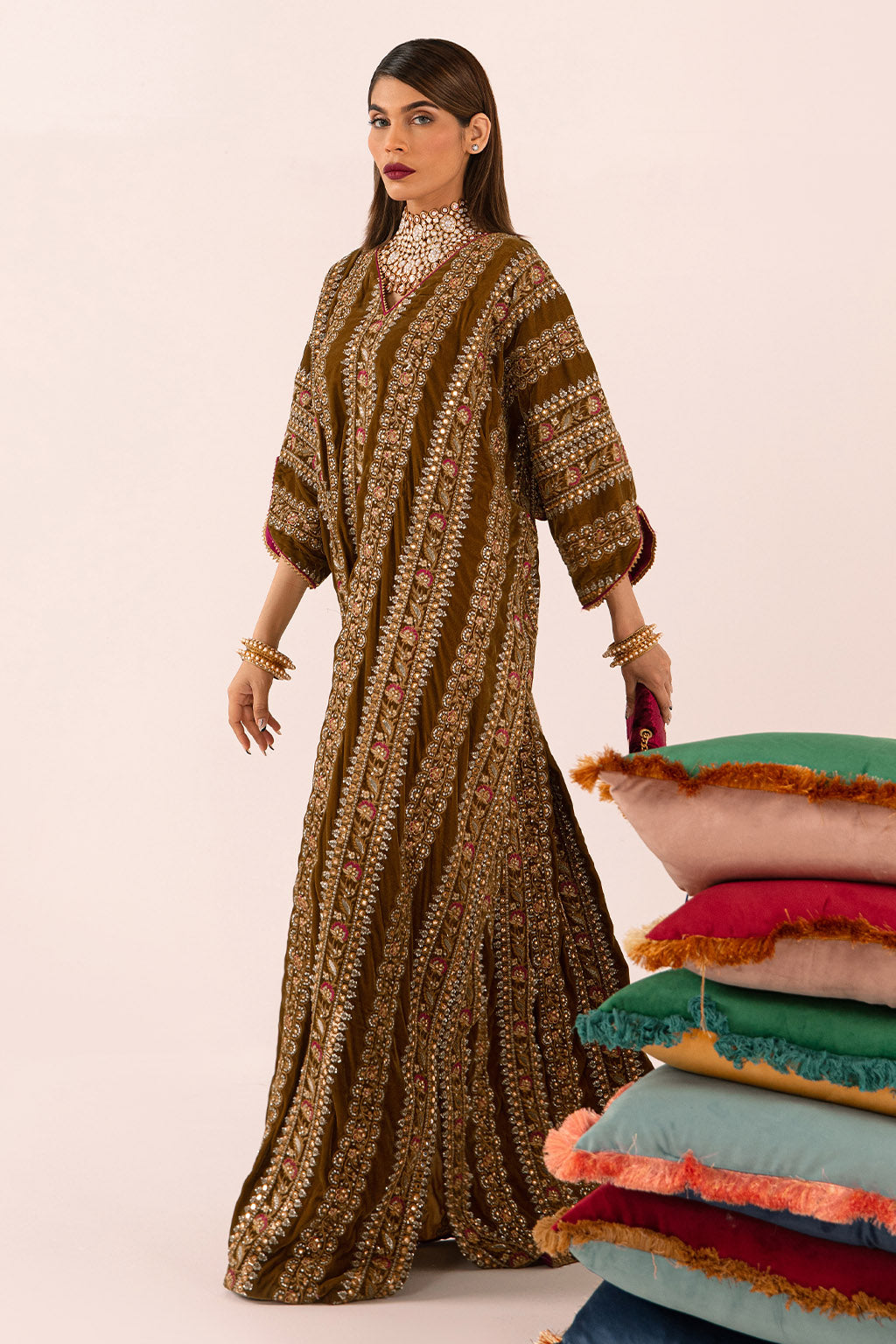 The ultimate must-have color for this winter’s festivities. This forever flattering silhouette is cut from a velvet in the most stunning shade of green. Adorned with intricate embellishments and thread-work in gold and red this is going to be your immediate.