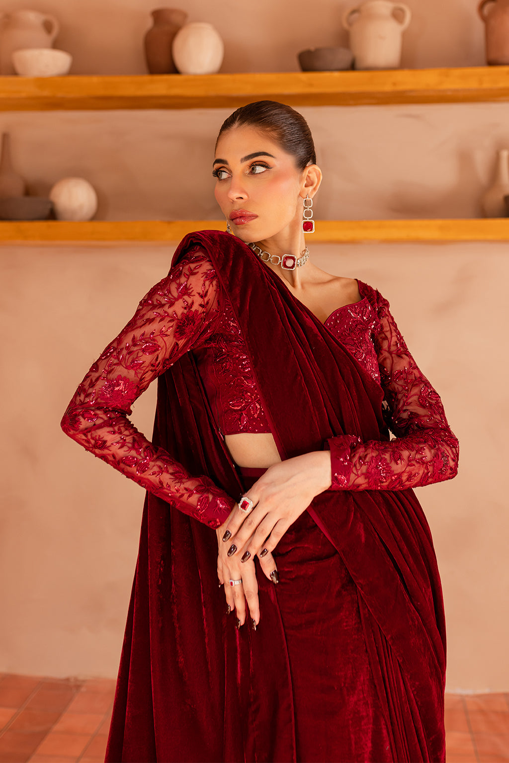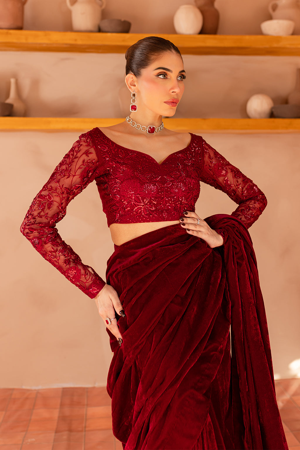 Maroon organza sequined embroidered blouse, velvet saree with raw silk paiti coat.