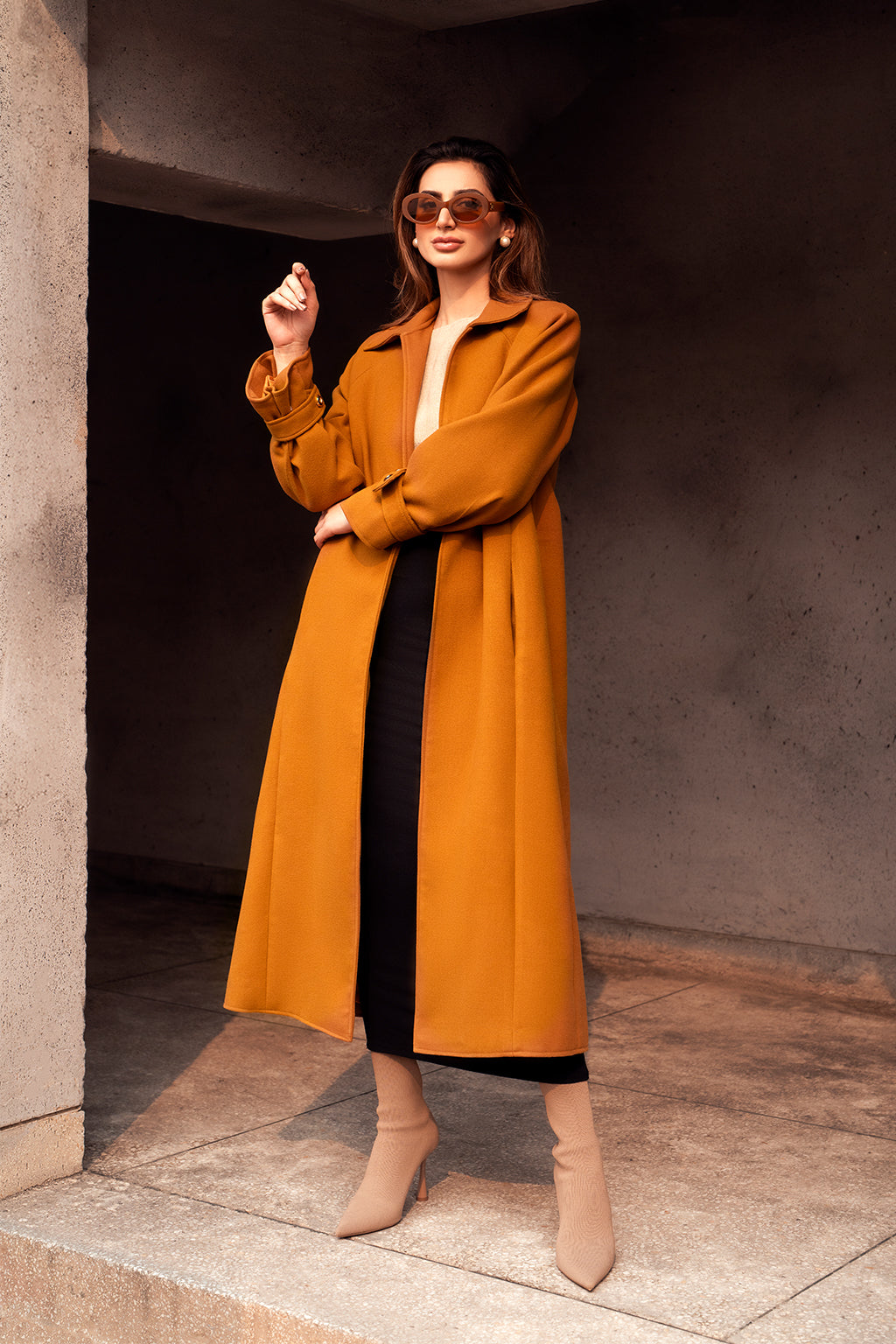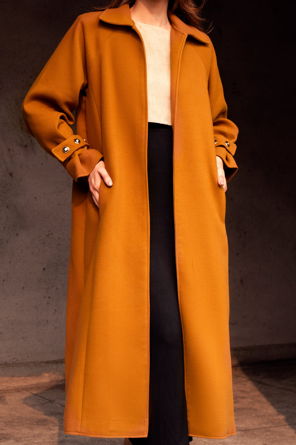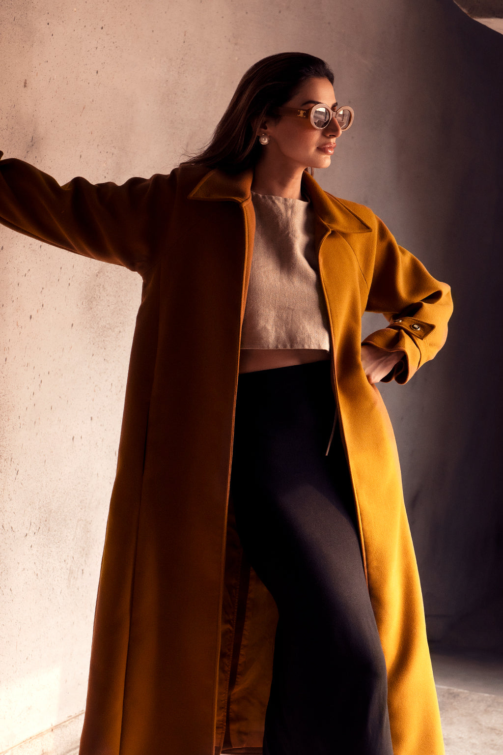 Mustard soft fine woollen fabric tailored full sleeves long coat