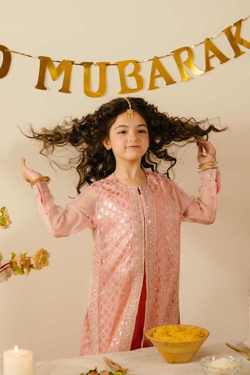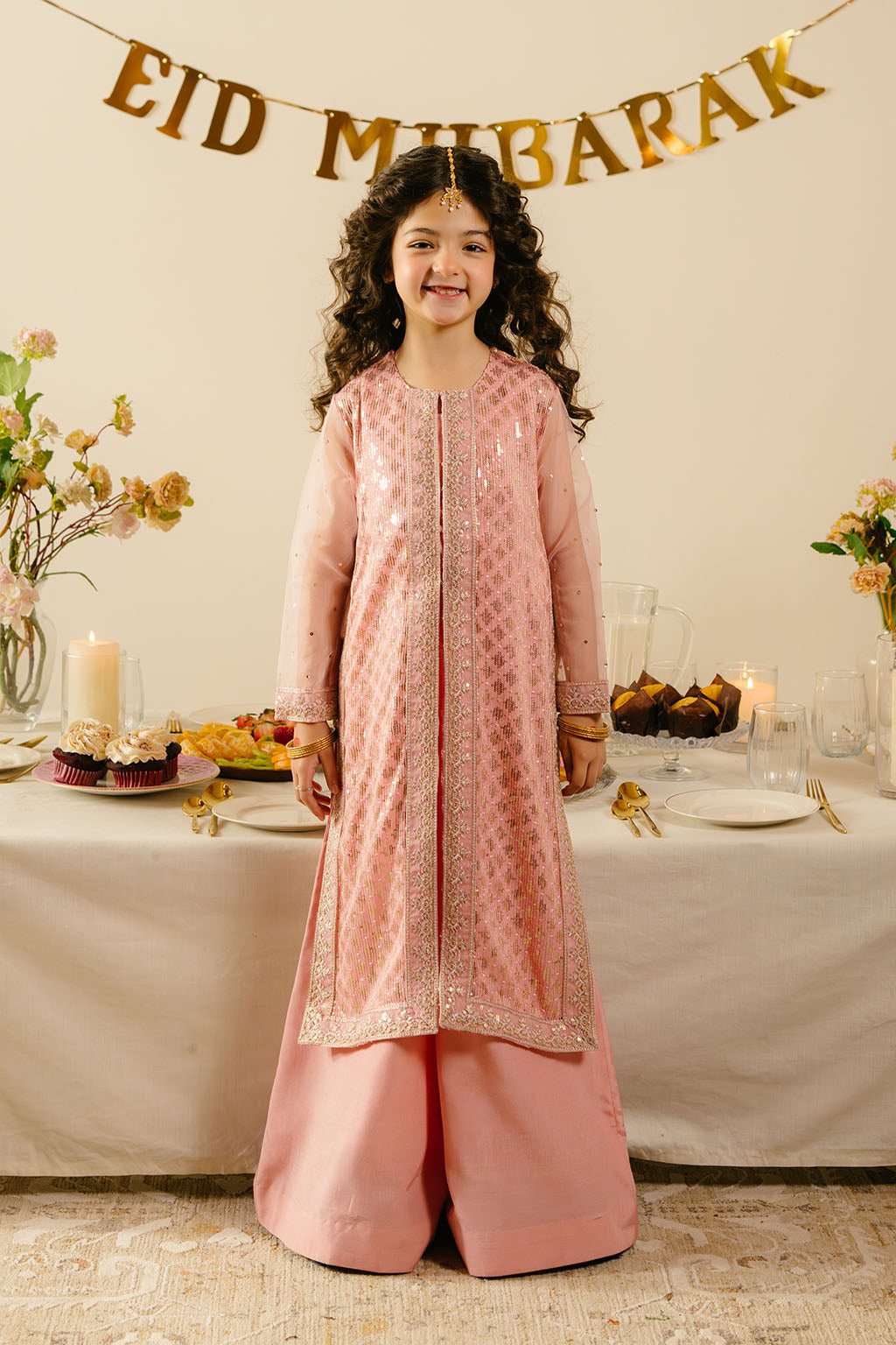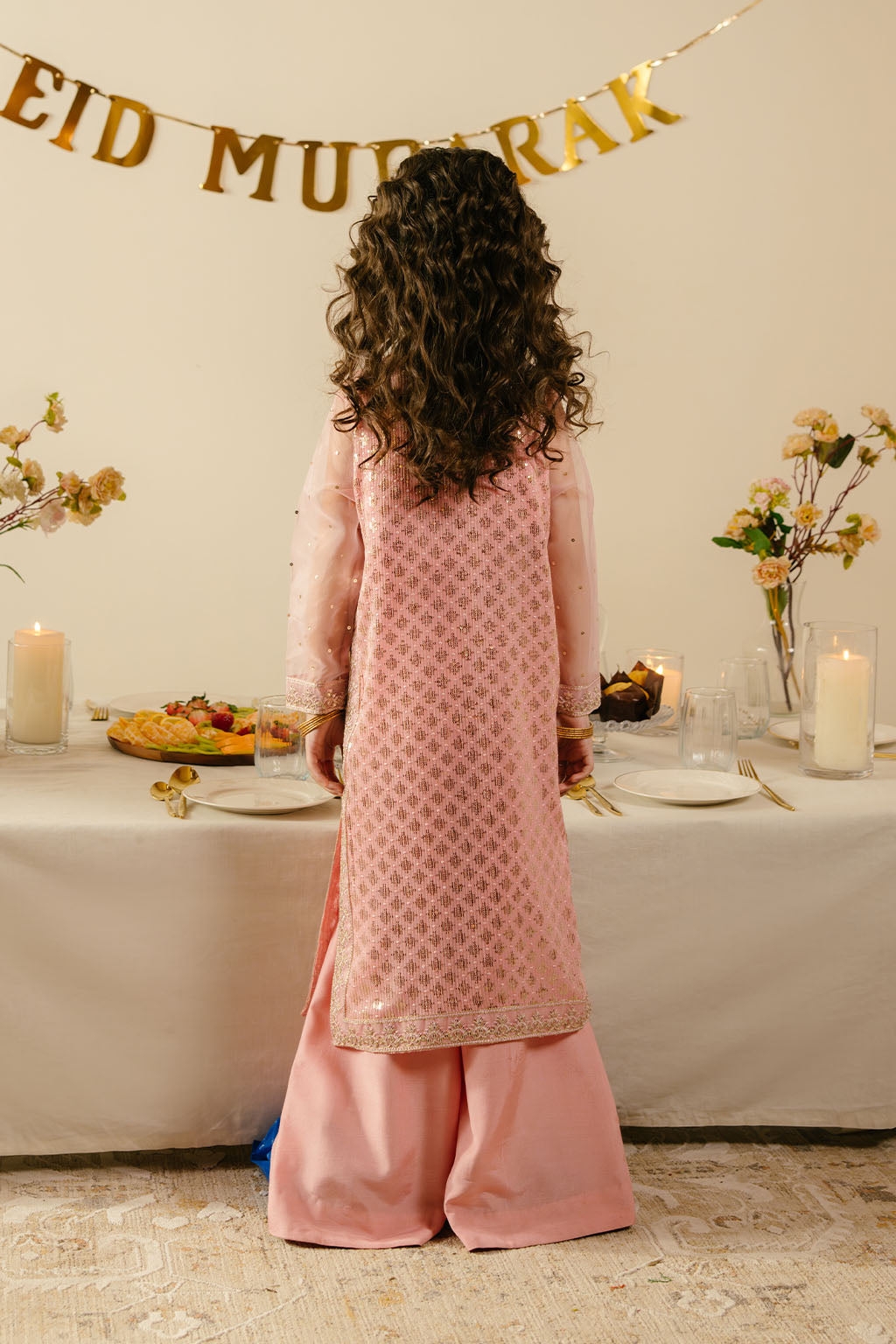 A pink sequinned and embroidered organza front open gown with raw silk tunic, paired with palzo pants