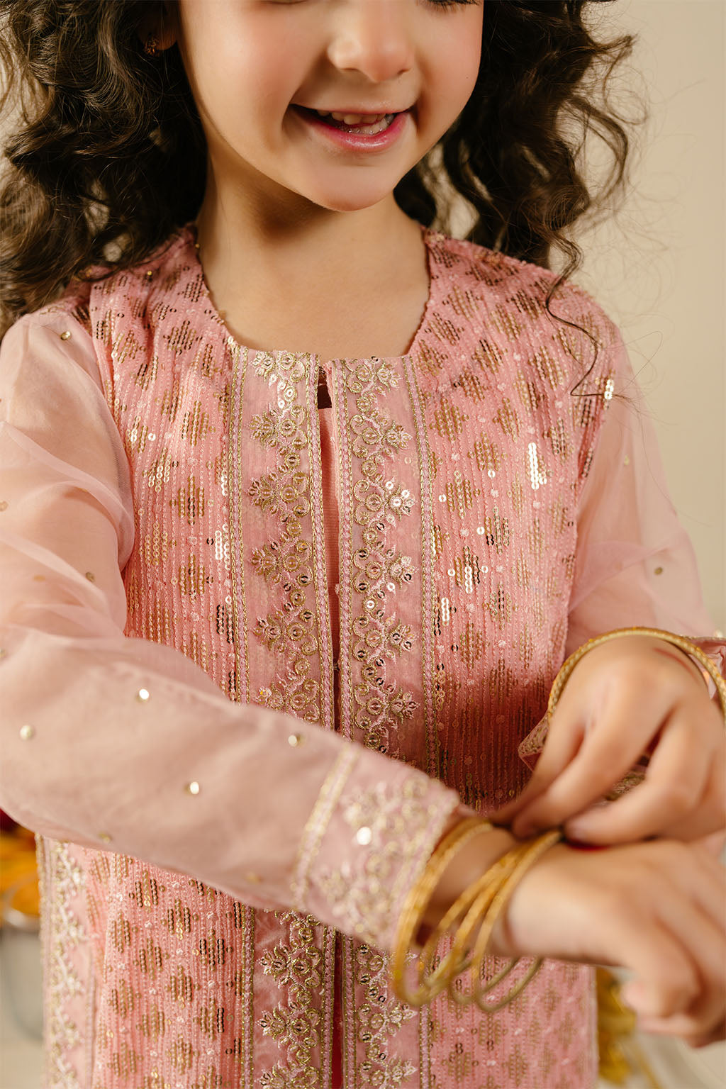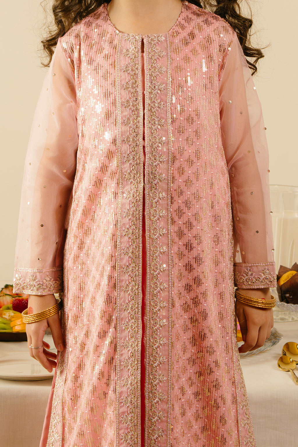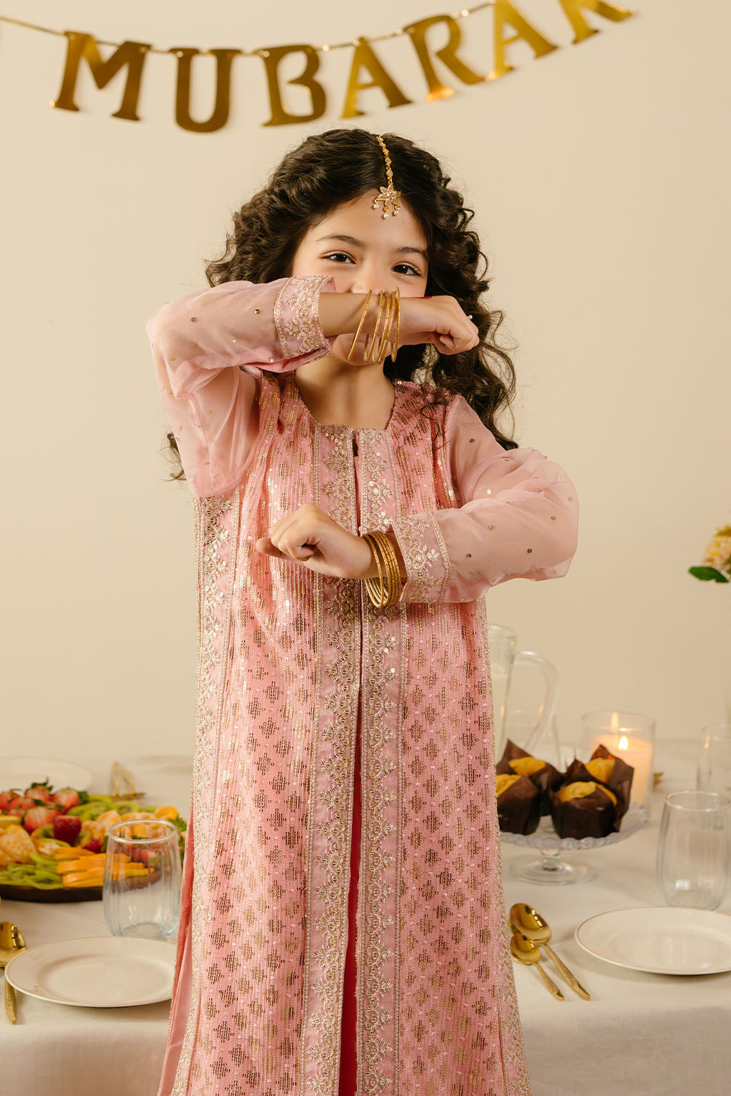 A pink sequinned and embroidered organza front open gown with raw silk tunic, paired with palzo pants