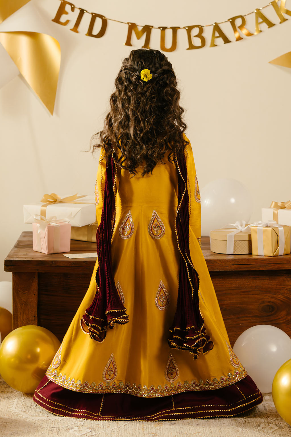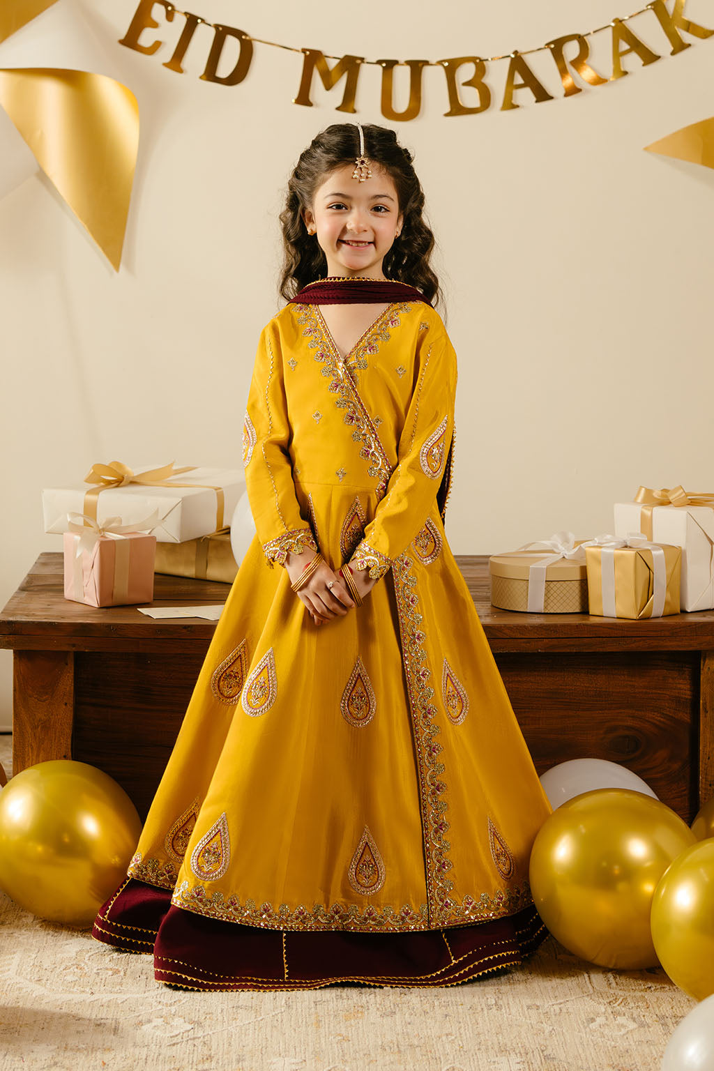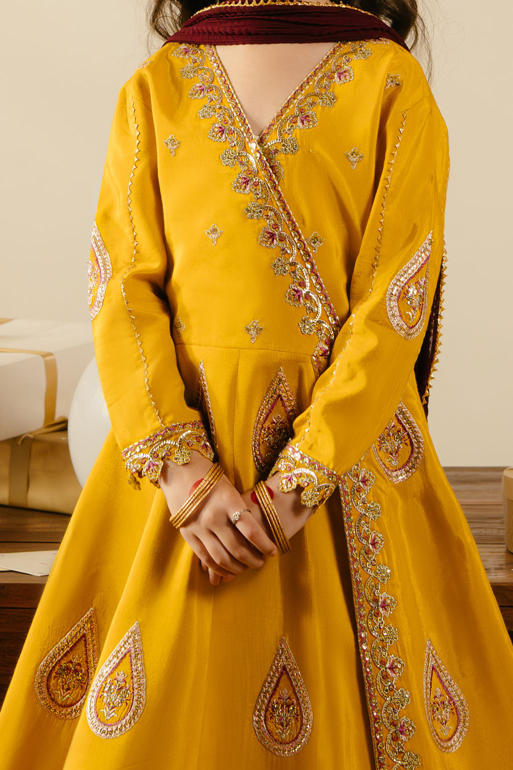 Mustard embroidered frock, paired with contrasting lehnga and chiffon dupatta