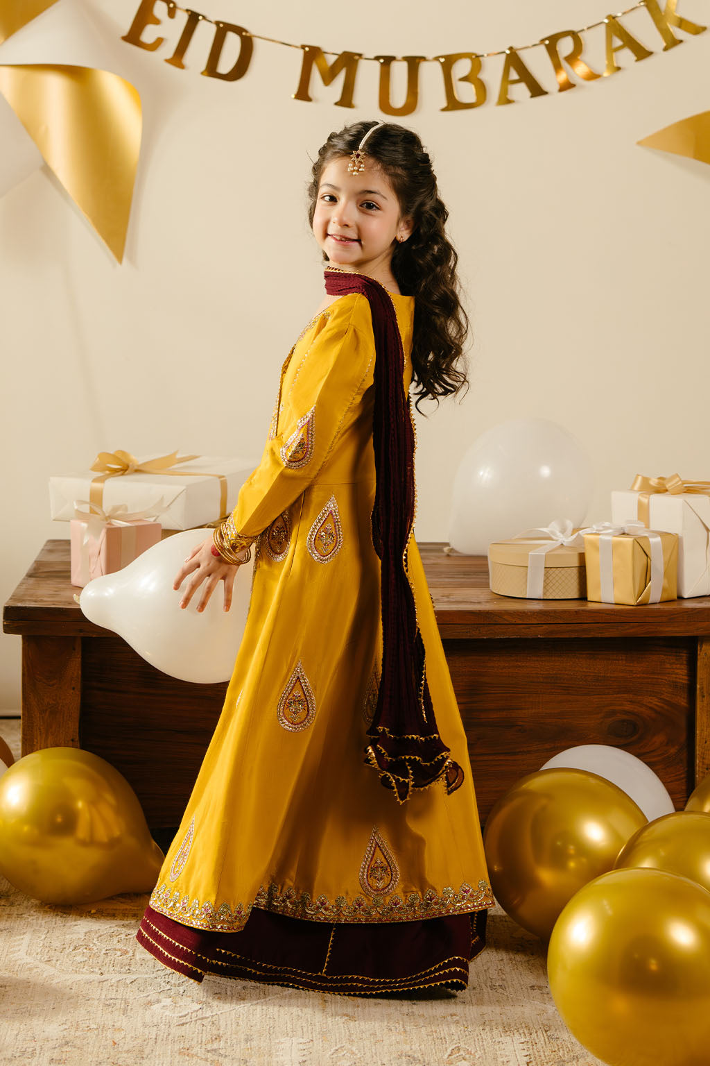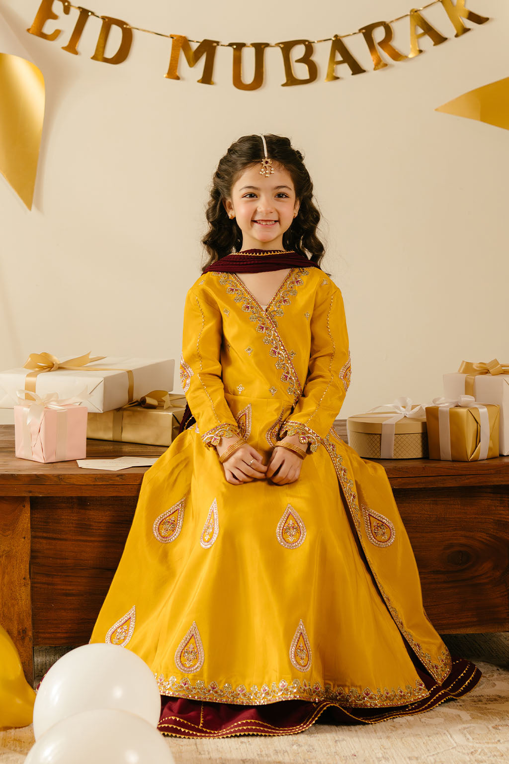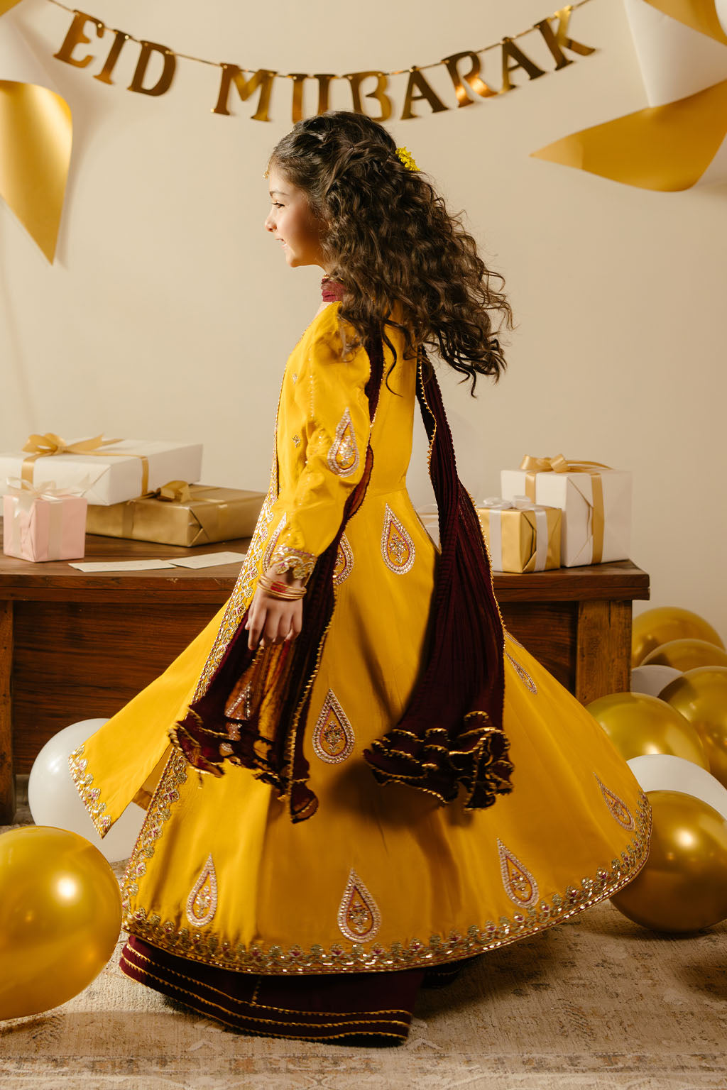 Mustard embroidered frock, paired with contrasting lehnga and chiffon dupatta