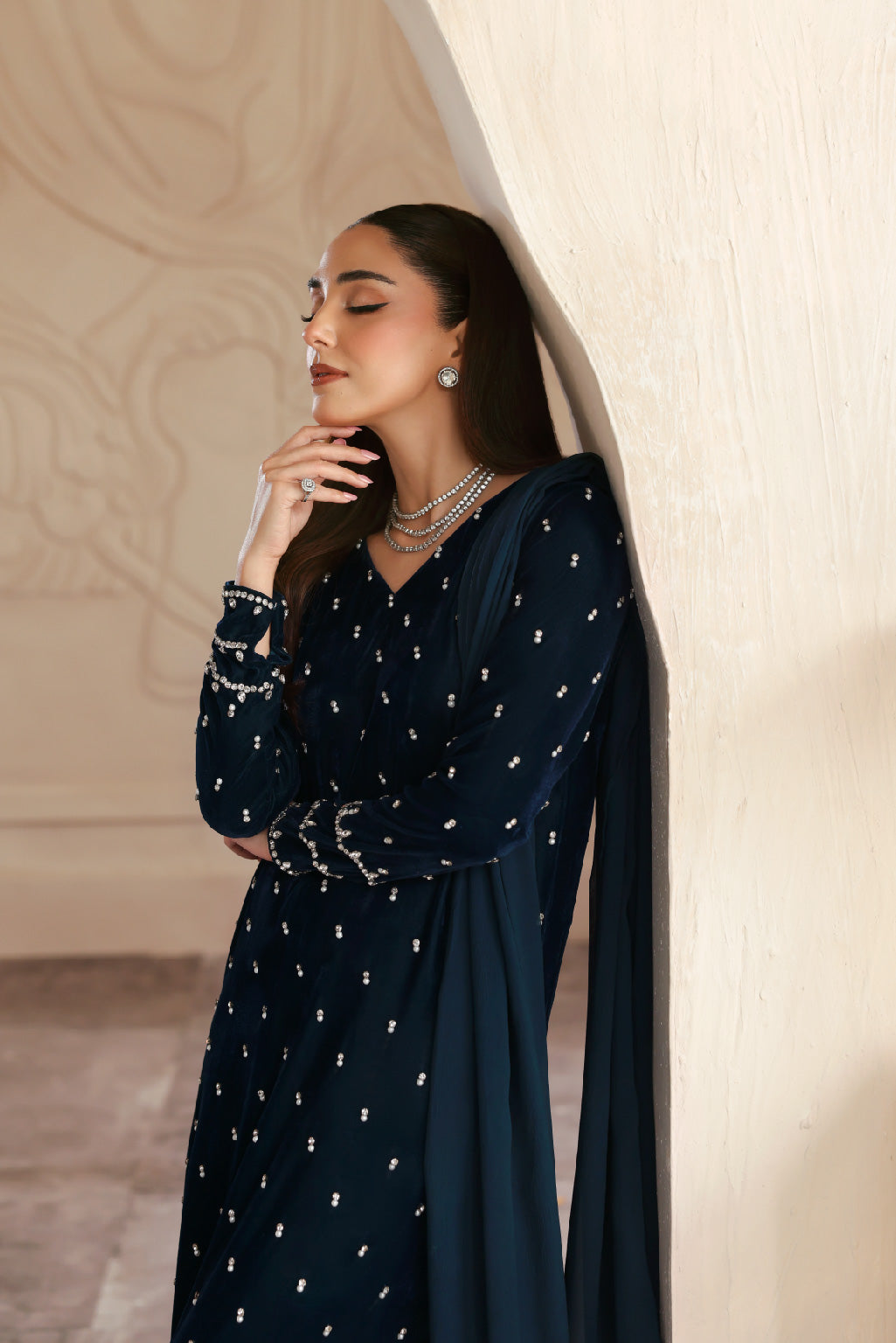 midnight blue velvet long shirt with intricate embellishments, paired with raw silk cigarette pants and a chiffon dupatta adorned with pearl hangings.