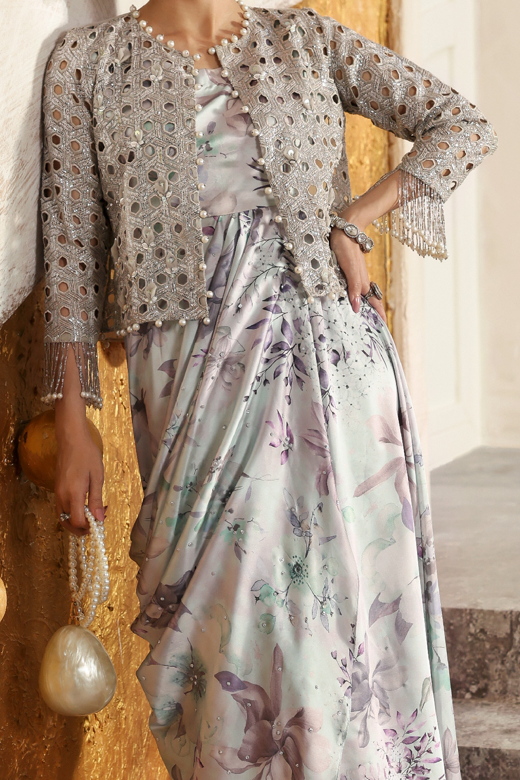 A contemporary draped dress in soft pastel floral print, paired with a hand-embroidered hand work jacket. Elegant, lightweight, and perfect for festive occasions or weddings