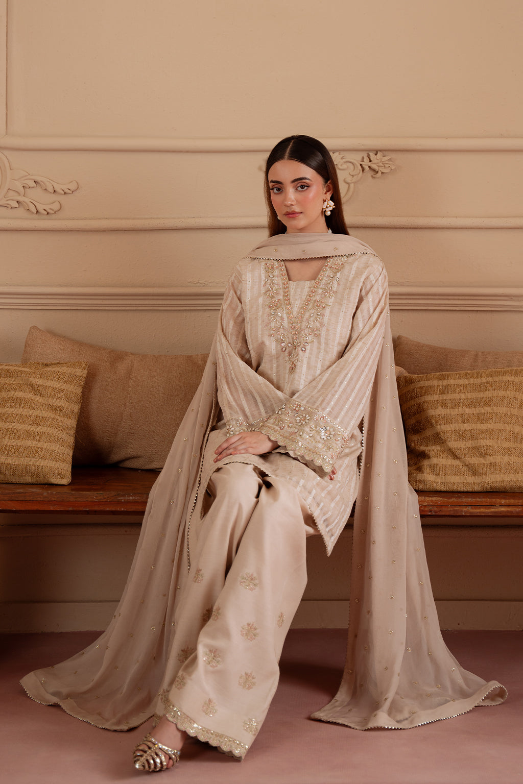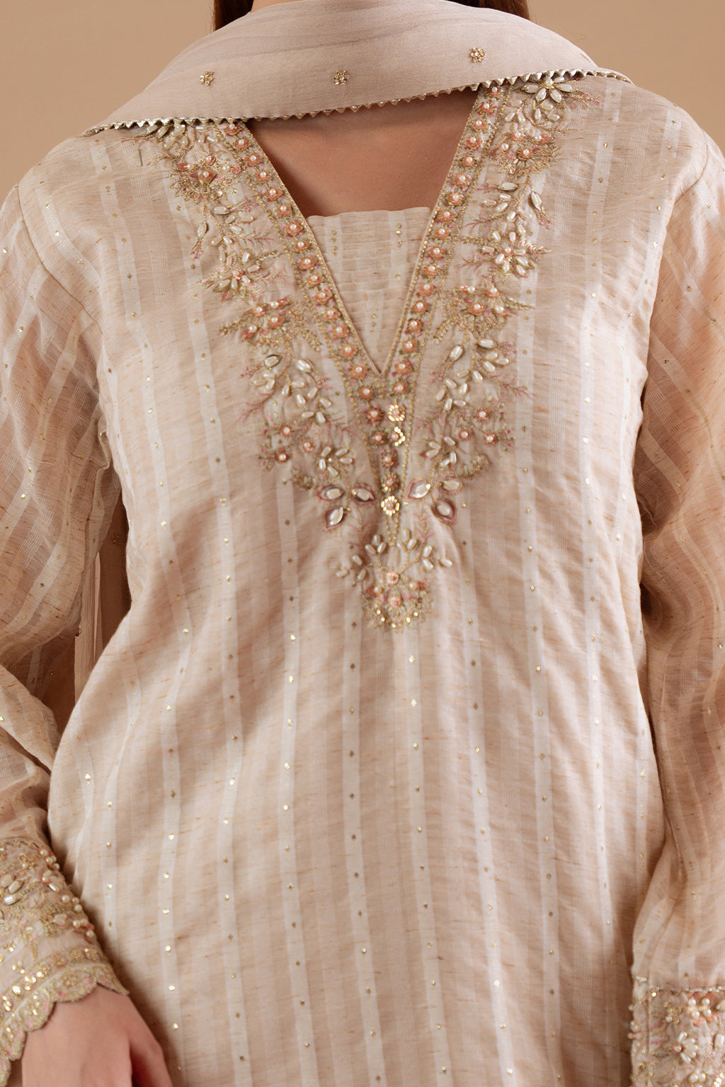 Embroidered and embellished zari brochia shirt paired with rawsilk trouser and embroidered chiffon dupatta