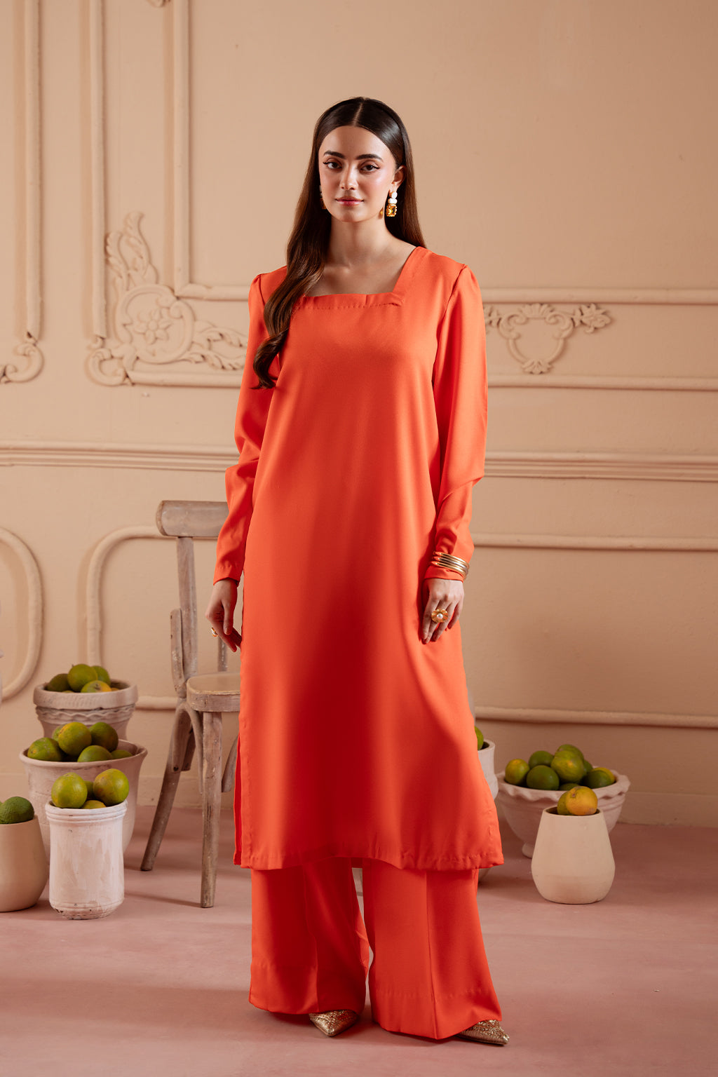 Beautiful bright orange georgette long shirt paired with georgette pants