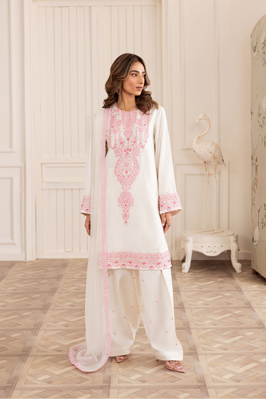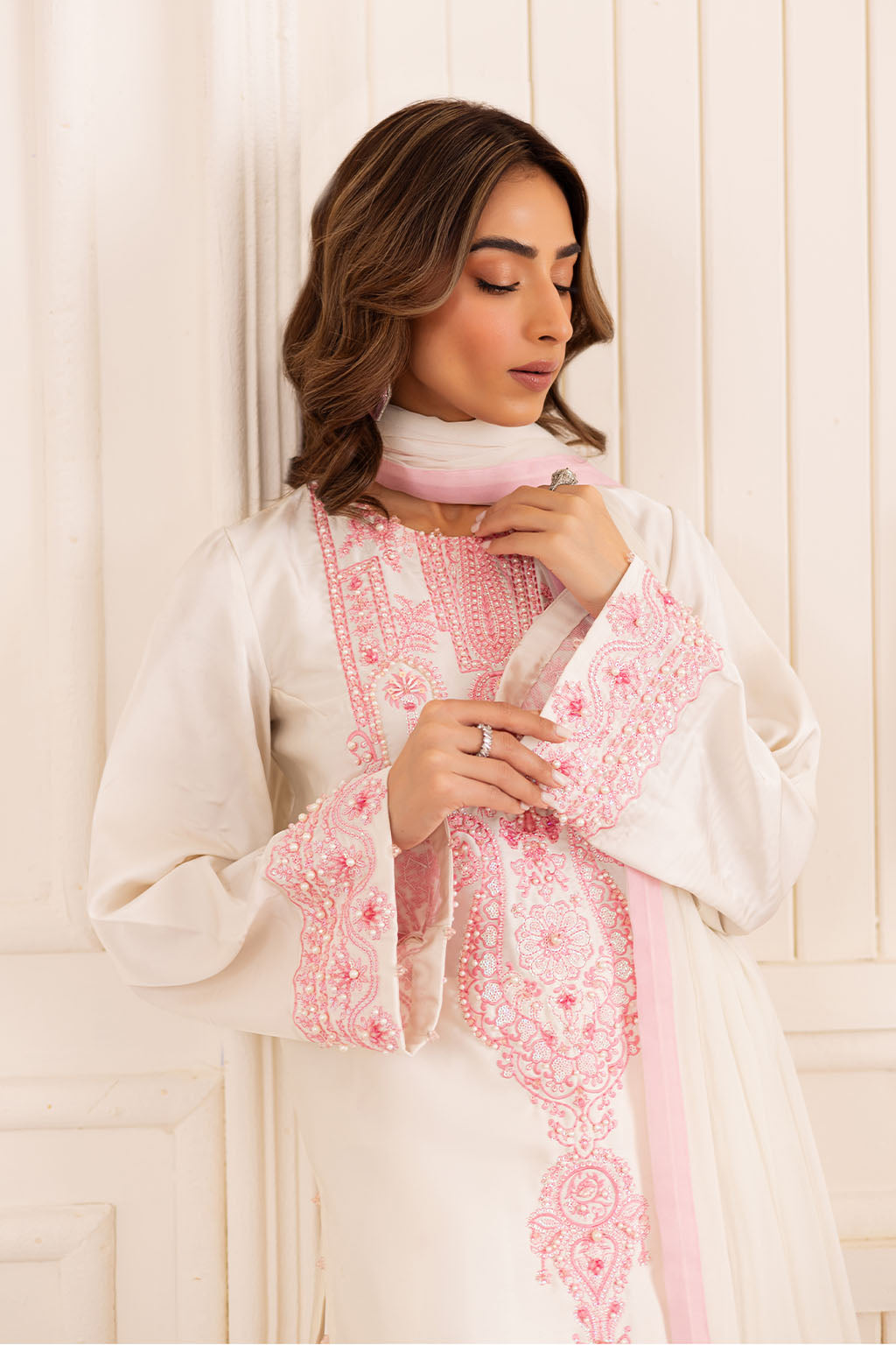 An off-white charmeuse embroidered and hand embellished shirt, paired with embroidered shalwar and chiffon dupatta
