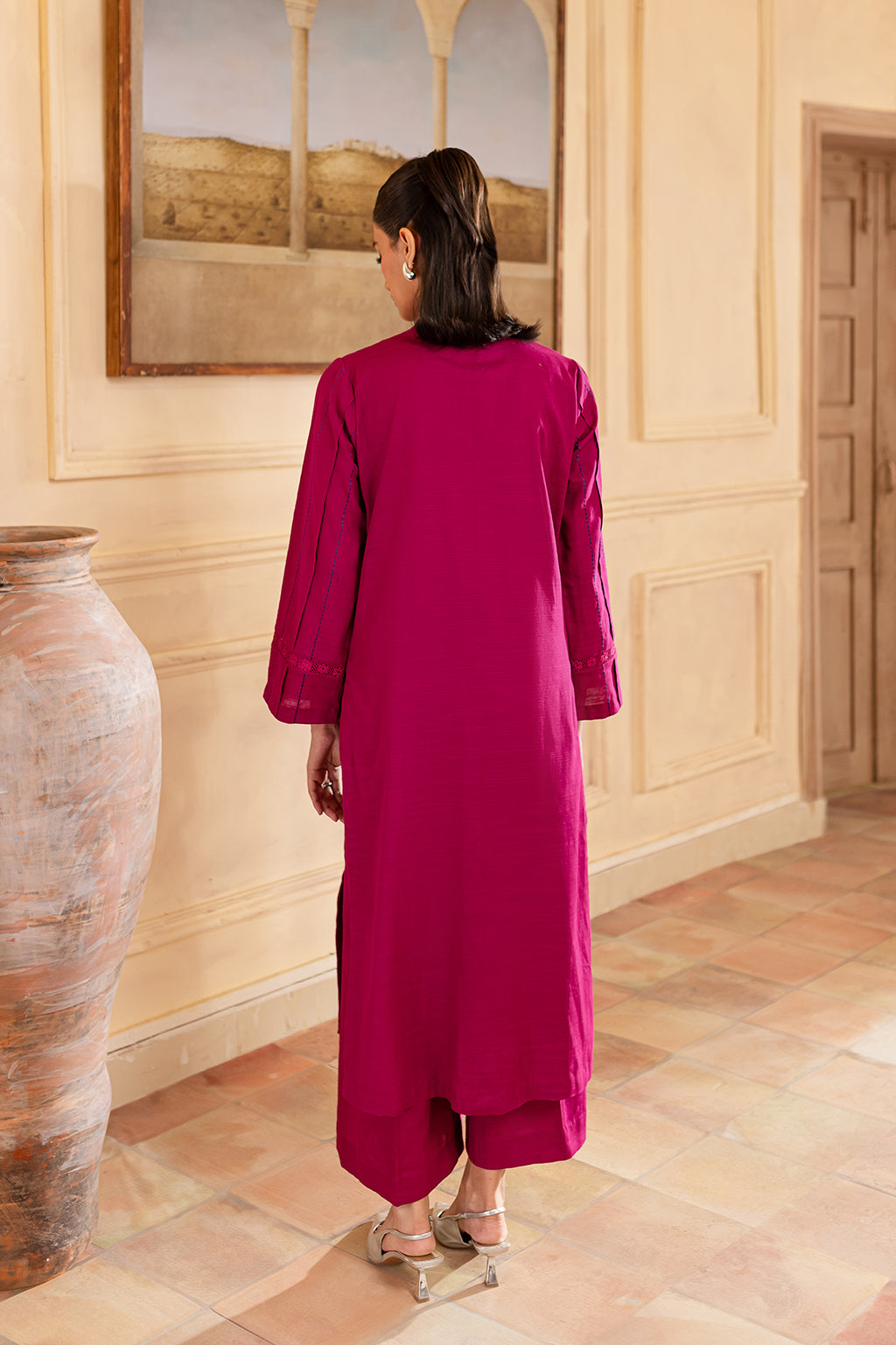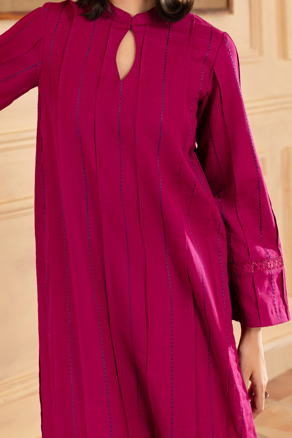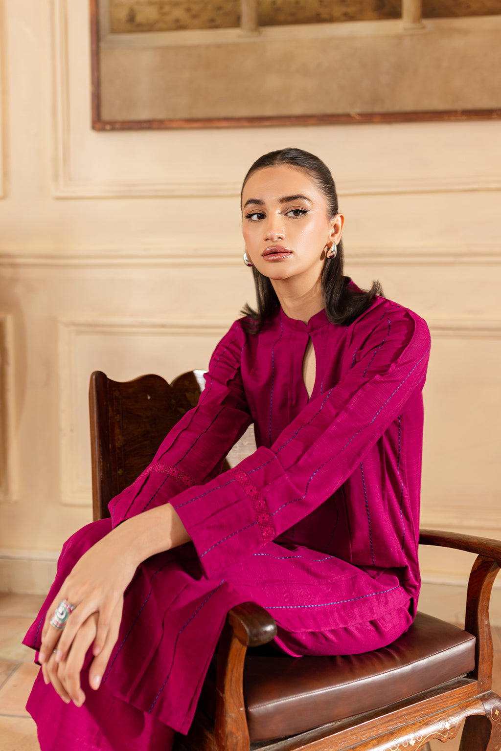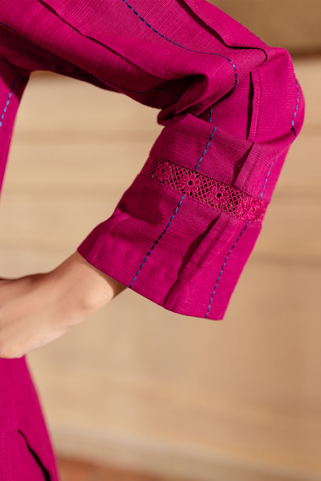 Fuchsia embroidered shirt with lace detailing, paired with wide legged trousers