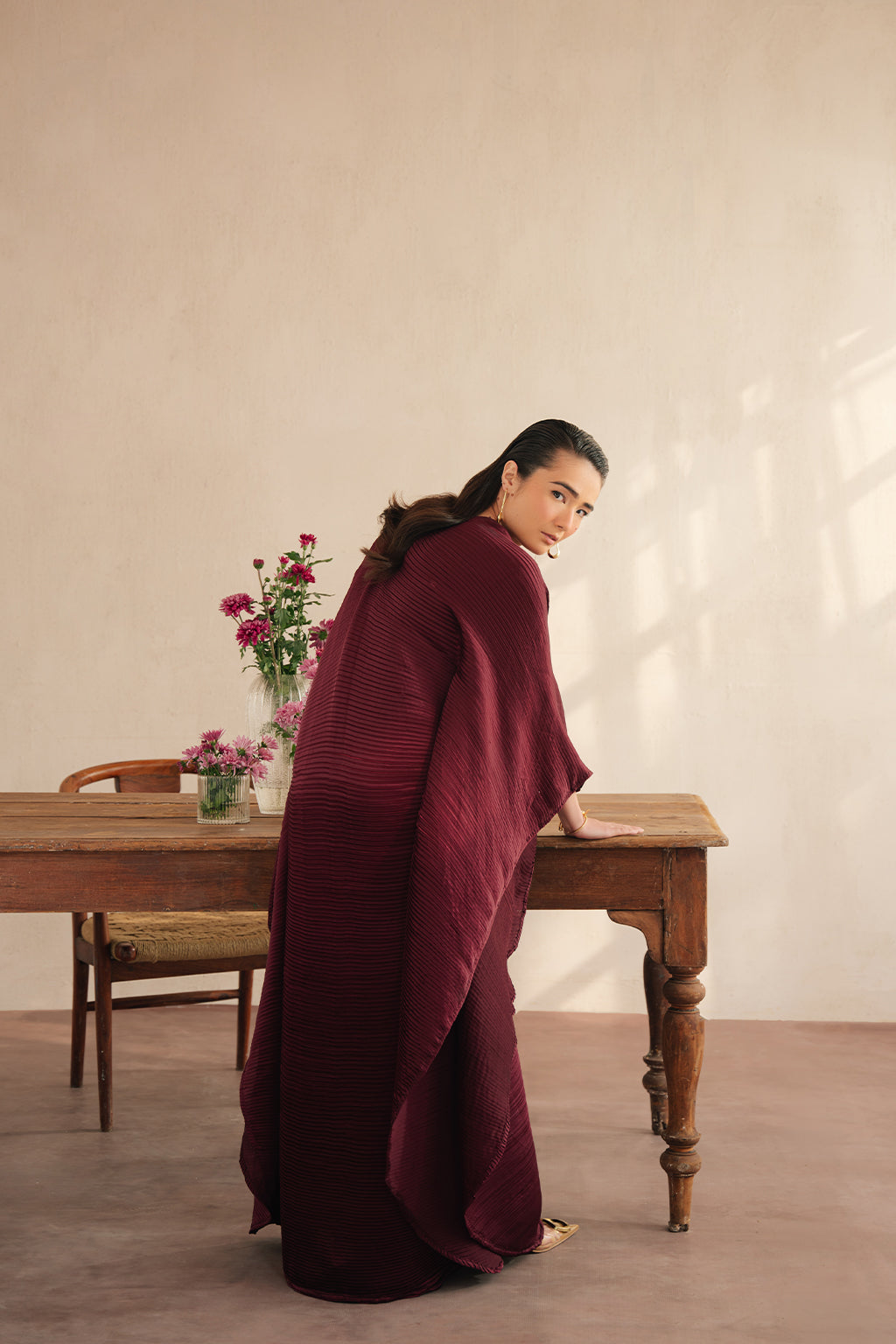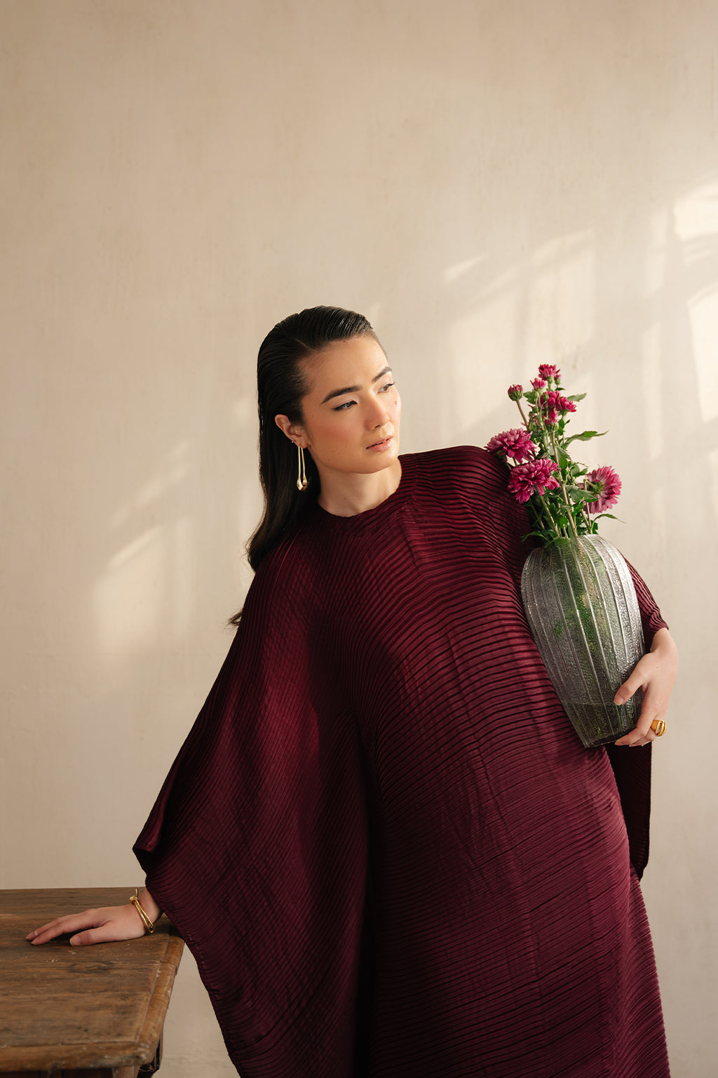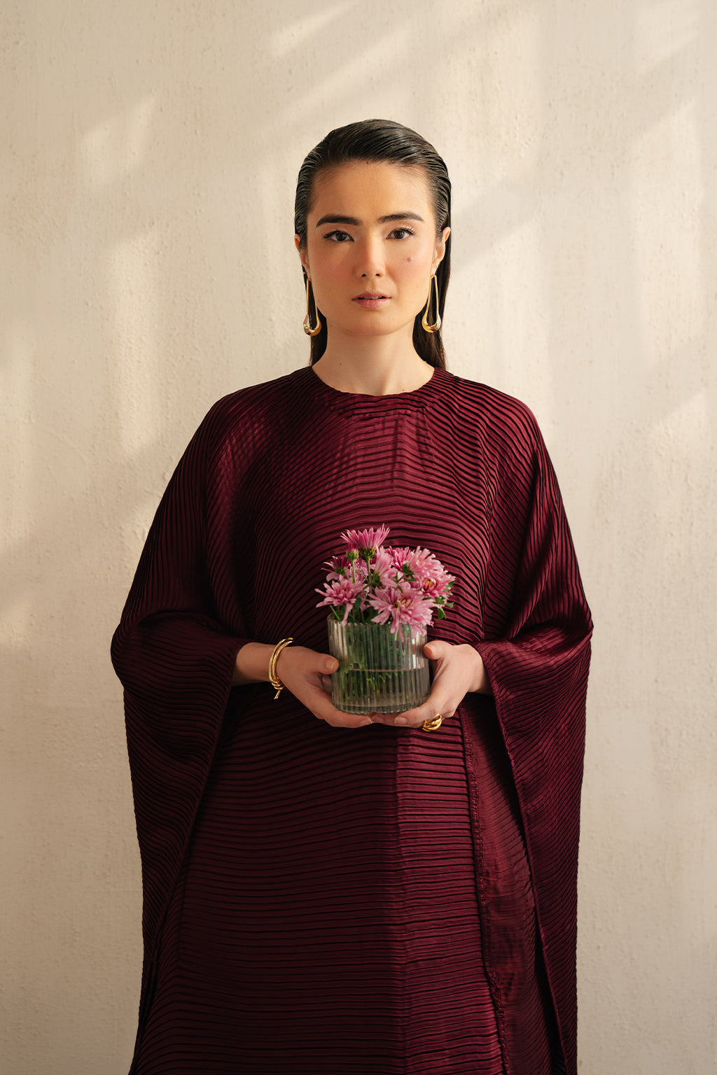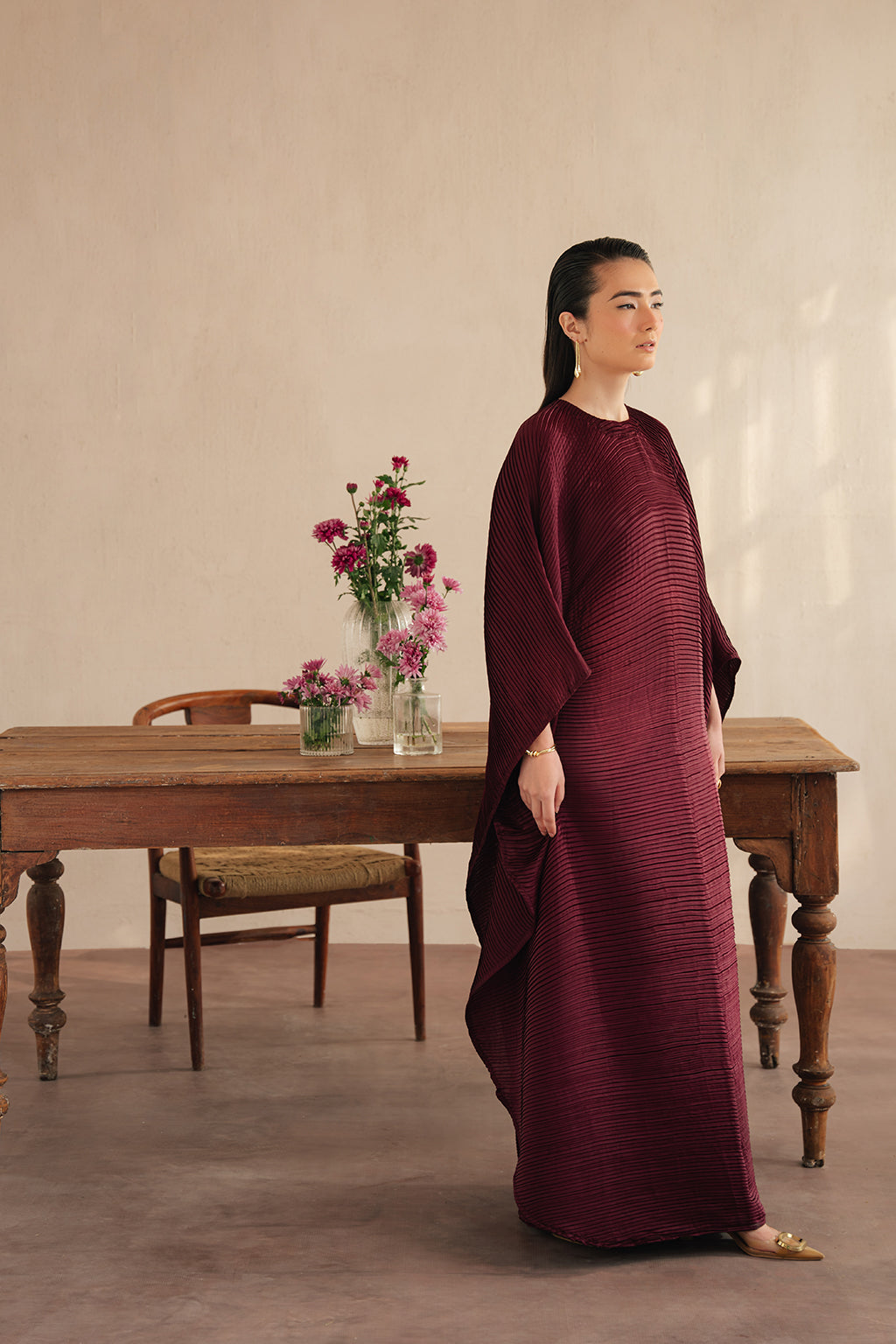 Deep maroon elegant pleated silk kaftan